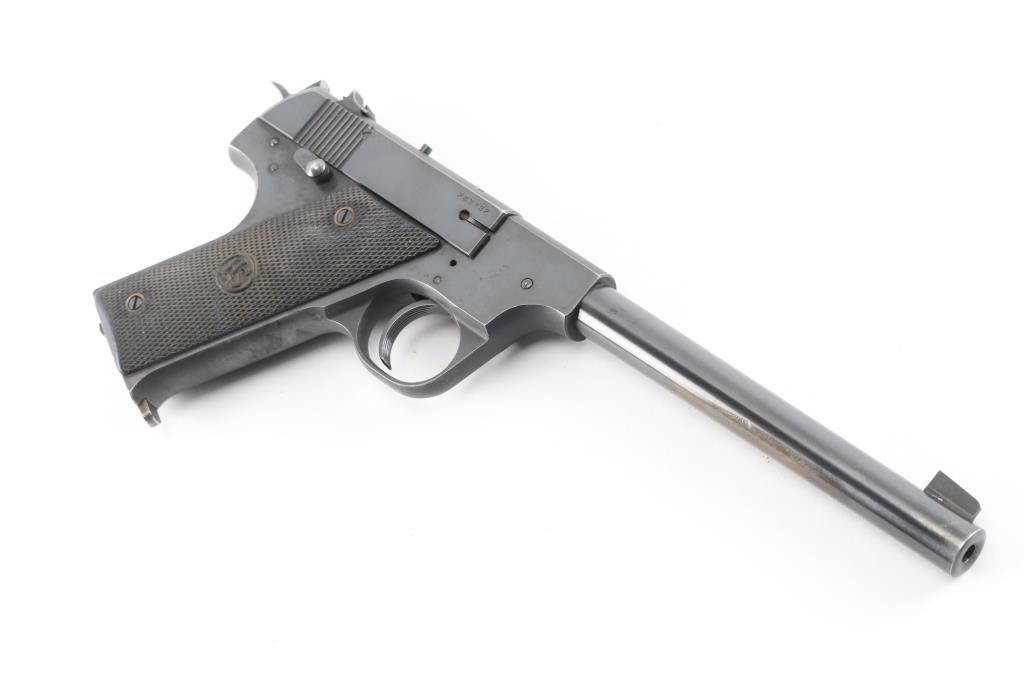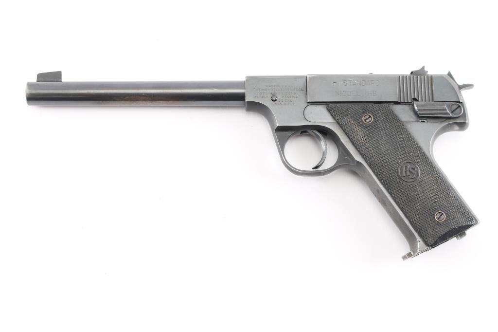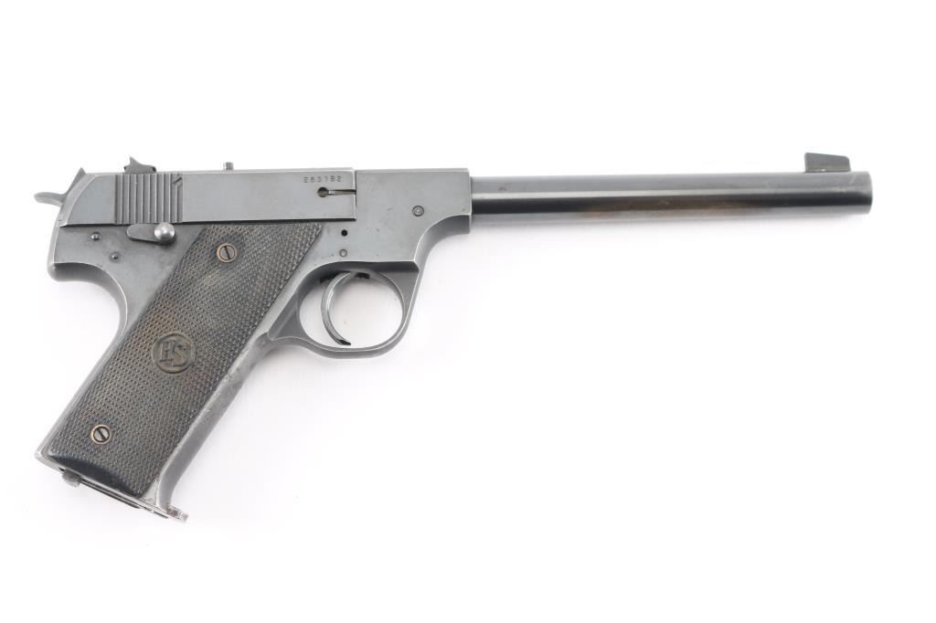 Vintage semiautomatic pistol features blued finish, 6.75" tapered barrel, fixed sights, external hammer with knurled spur, manual safety, heel style magazine release. Bore is very good condition. Retains 75% blue, fading to brown under barrel, thinning at grip straps, edge losses. Checkered black plastic grips with "HS" logos are in very good condition. Slide numbered to frame. Includes one magazine.