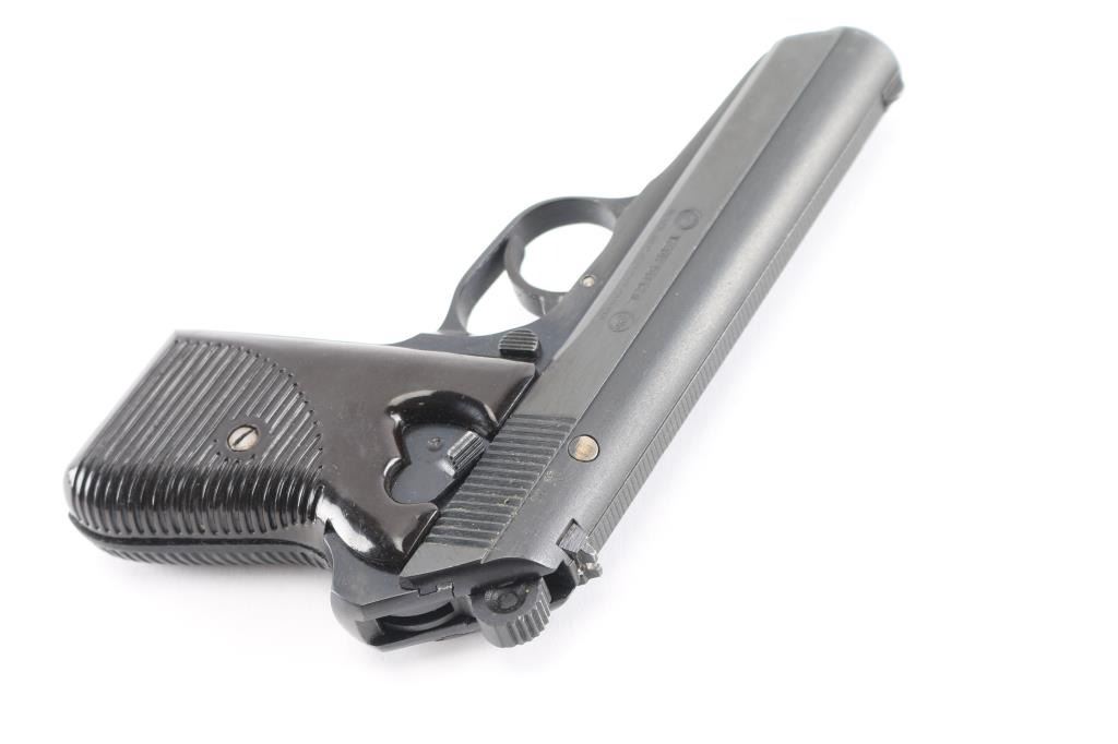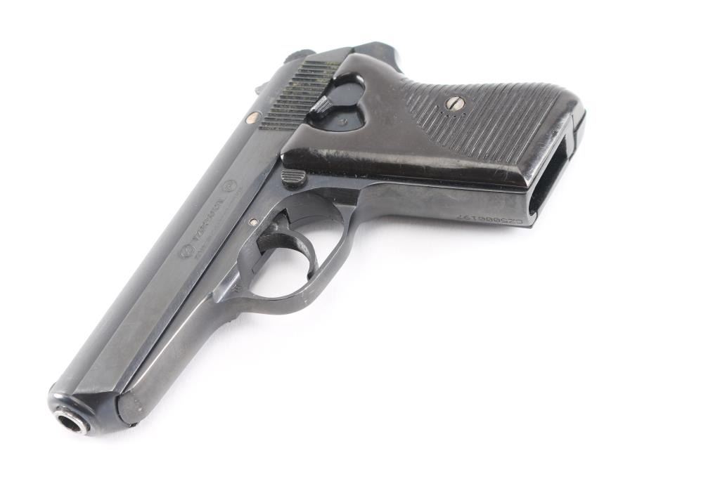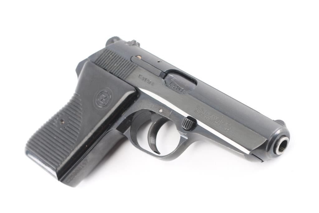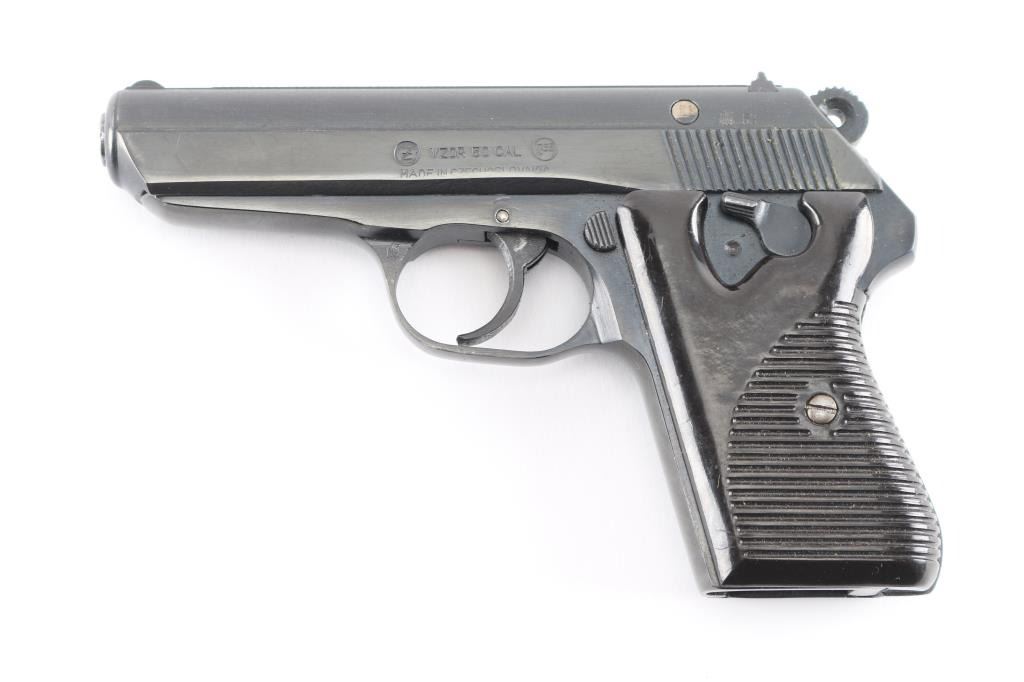 'Vz.50' Czechoslovakian semiautomatic pistol imported by CAI, Georgia VT. Dated 1969. Features fixed sights, approx. 3.5 inch barrel, frame mounted manual decocker/safety, double and single action, dark brown (almost black) "CZ" logo plastic grips with ribbed texture. Bore is very good condition. Probably reblued before importation, retaining 95% finish with handling marks. Grips are very good. Serial is importer applied, previous numbers visible on slide & barrel. No Magazine.