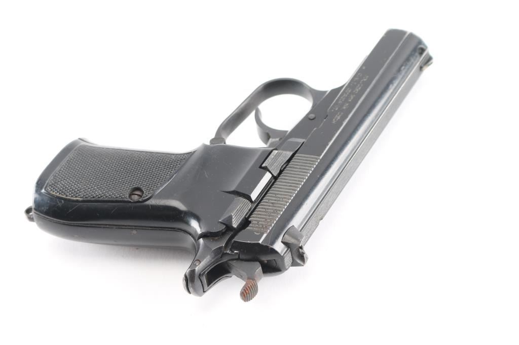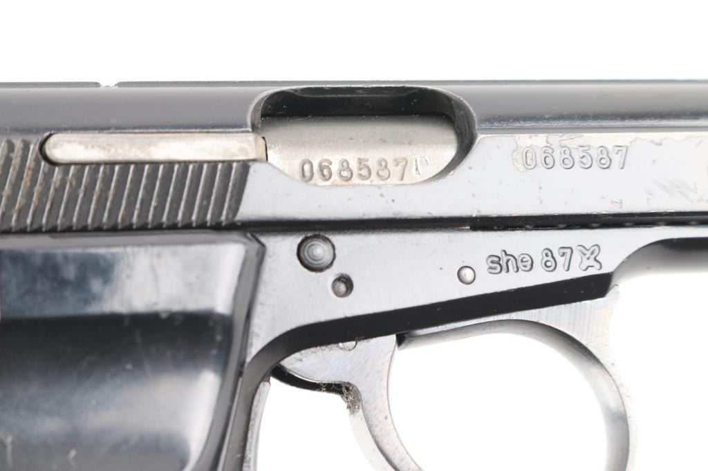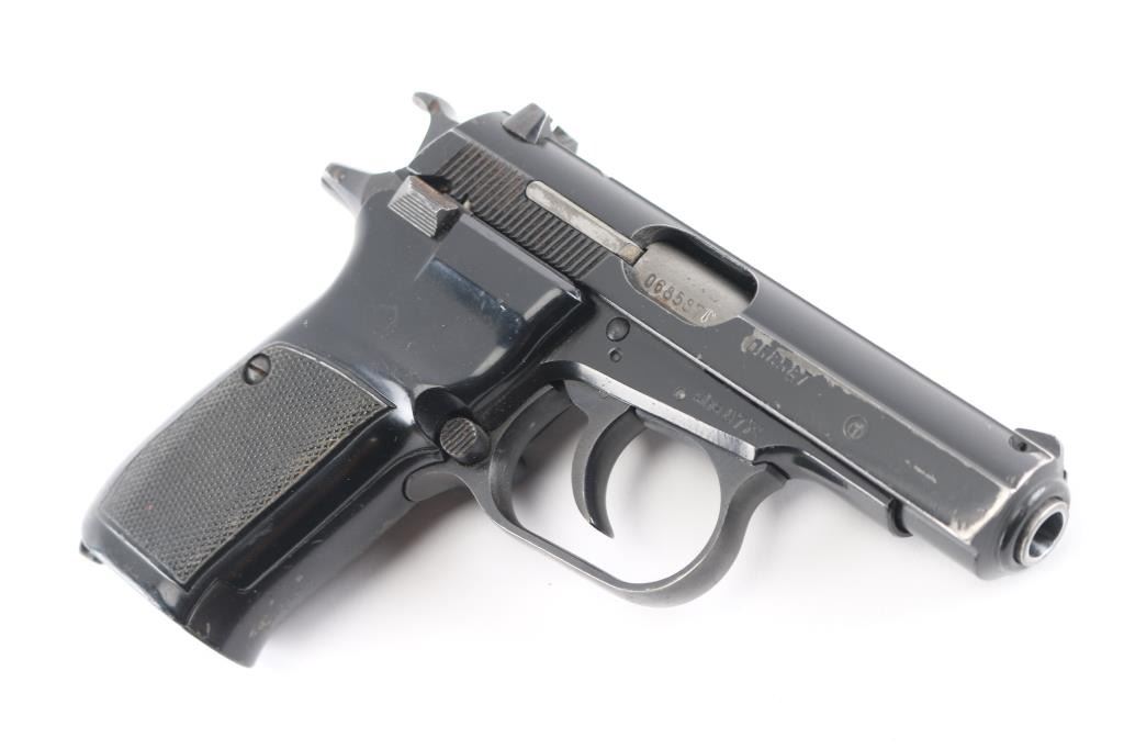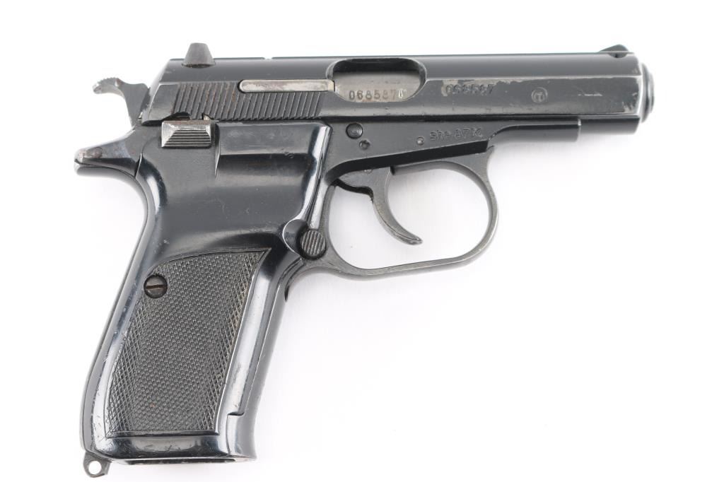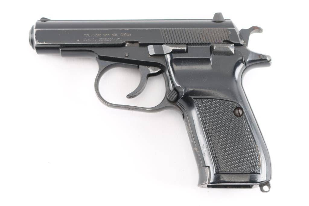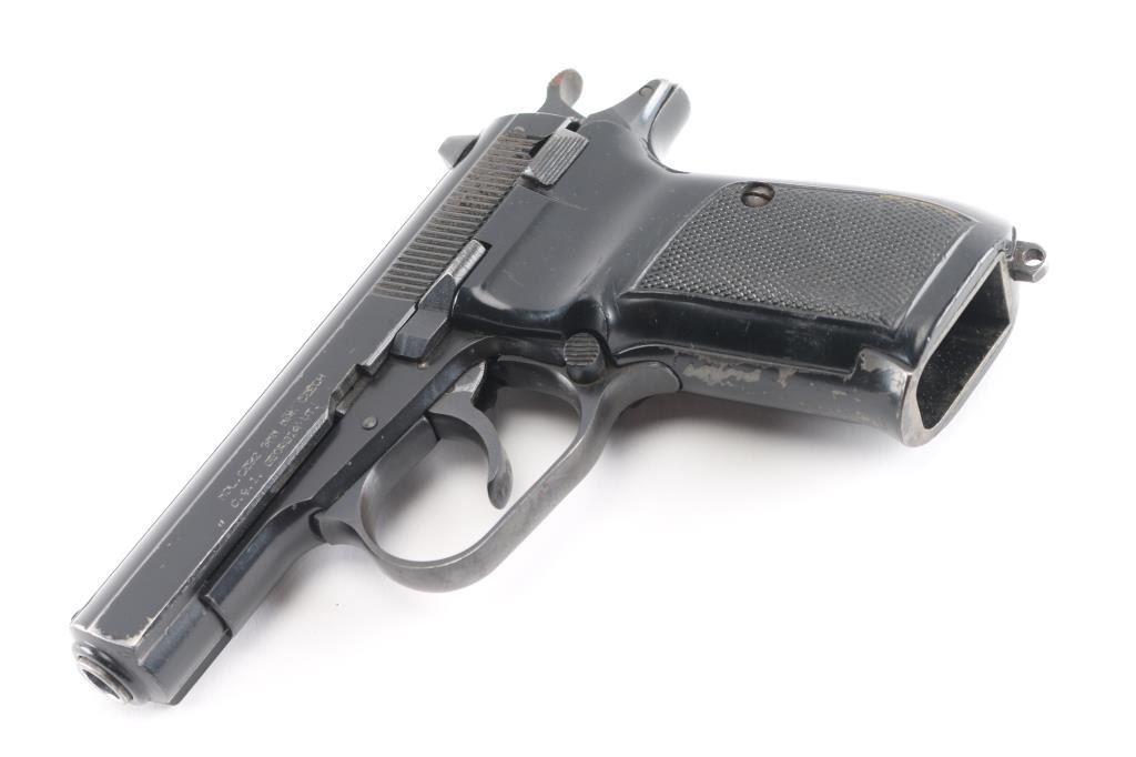 'Pistole Vz.82' Czech single/double action pistol imported by CAI, Georgia VT. Features 3.75" barrel, fixed sights with white front ramp, ambidextrous frame mounted safety, lanyard stud, black plastic checkered grips. Bore is very good condition. Retains 80% black finish, bare metal at sharp edges, scuffs on slide and grip straps, small amount of light rust on hammer. Grips are good to very good condition. NO MAGAZiNE.