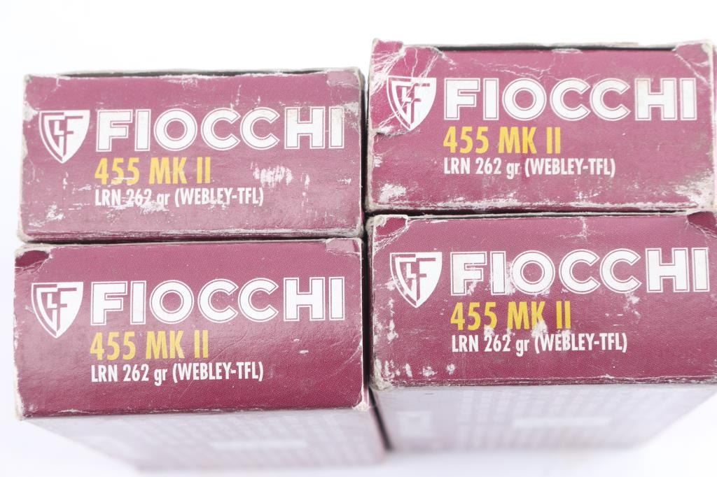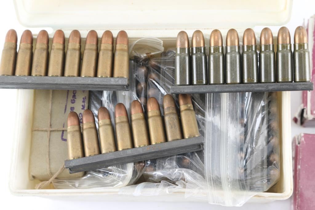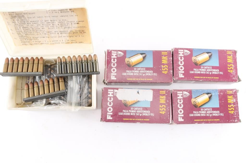 Approx. 440 rounds total. 200 factory new 455 Mk II ammunition. Fiocchi, 262 Gr. lead round nose. In factory boxes of 50 & approx. 240 rounds of 7.62 X 25mm Tokarev factory new ammunition. Most on 8 rd stripper clips. some in 16 rd paper packaging and 1 box of 70 rds, in white plastic case & factory boxes.