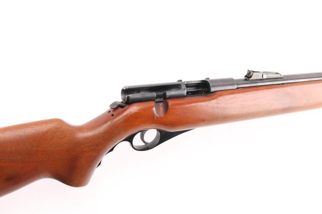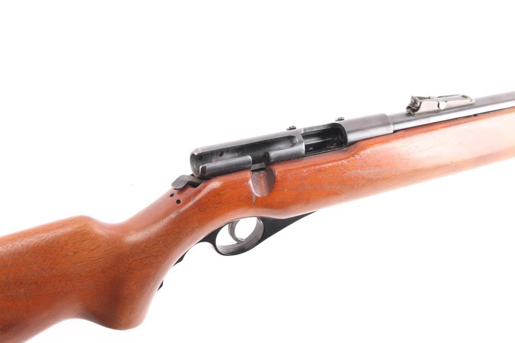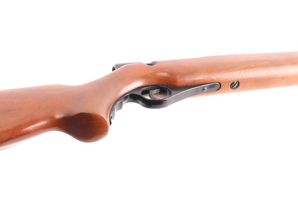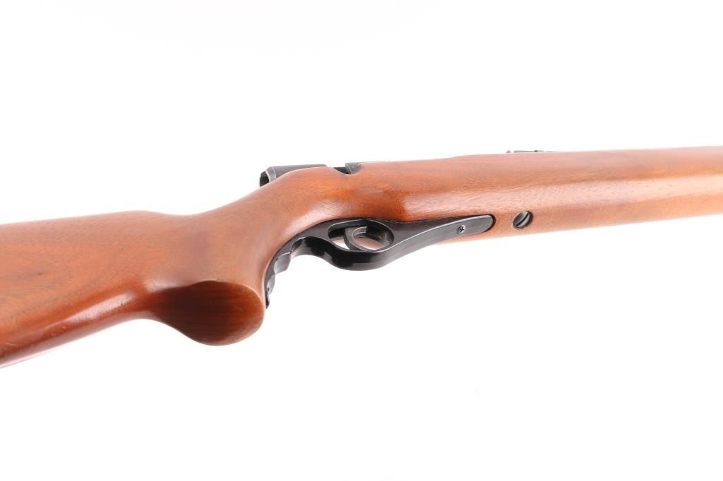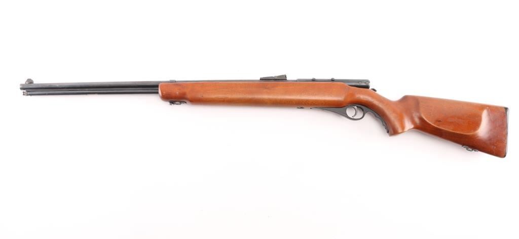Vintage bolt action rimfire rifle features blued finish, smooth wood stock with scant right hand cheek piece, 26" barrel, full length magazine tube, blade front & adjustable rear sights, manual safety, sling brackets (provide T slots for a vintage style swivel), plastic buttplate, plastic finger groove trigger guard. Missing Bolt assembly. Front screw for barrel band appears overly large, probably a later replacement. Bore is very good condition. Retains 90% finish with handling marks, edge losses, some thin patina on barrel. Wood is very good.
