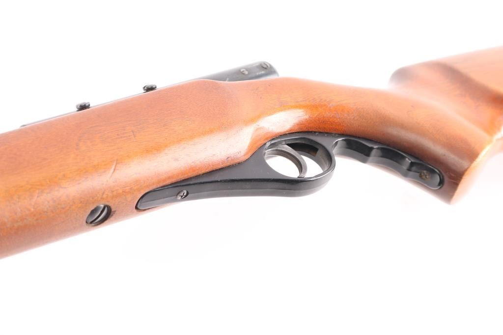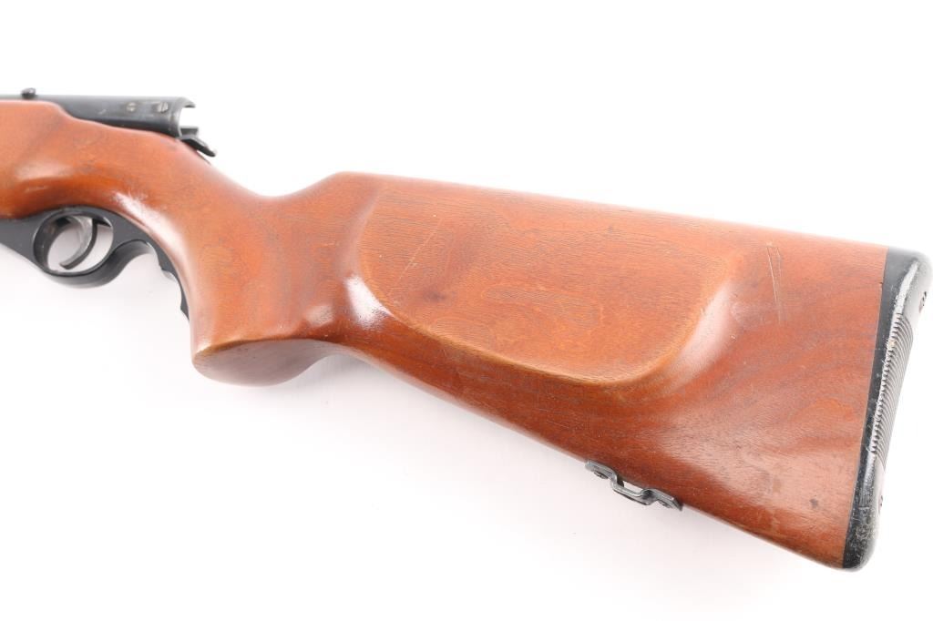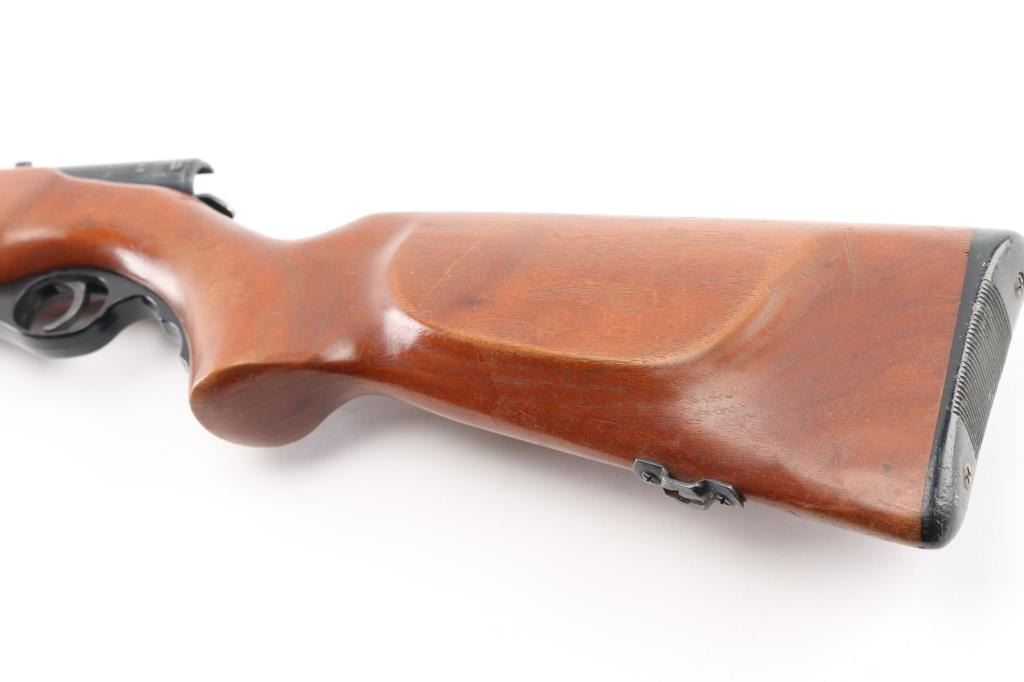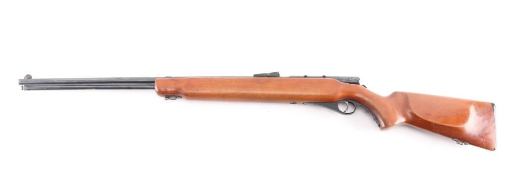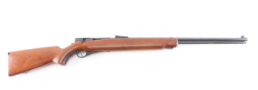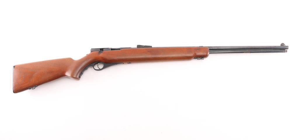 Vintage bolt action rimfire rifle features blued finish, smooth wood stock with scant right hand cheek piece, 26" barrel, full length magazine tube, blade front & adjustable rear sights, manual safety, sling brackets (provide T slots for a vintage style swivel), plastic buttplate, plastic finger groove trigger guard. Missing Bolt assembly. Front screw for barrel band appears overly large, probably a later replacement. Bore is very good condition. Retains 90% finish with handling marks, edge losses, some thin patina on barrel. Wood is very good.