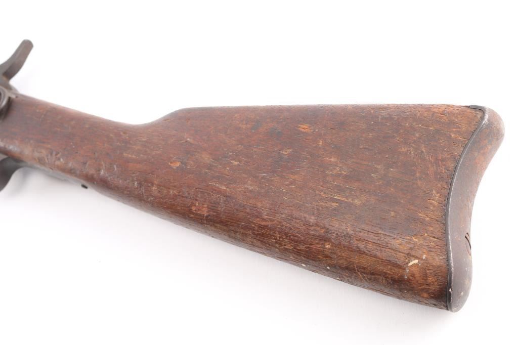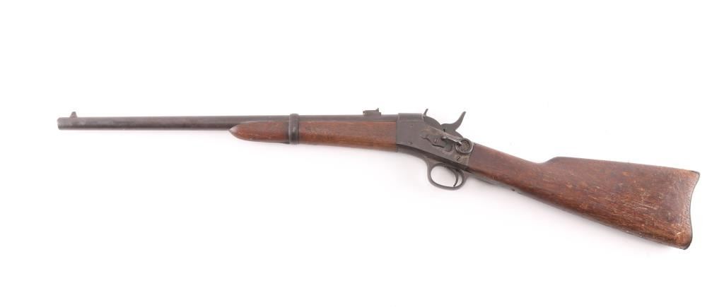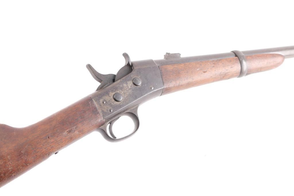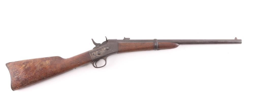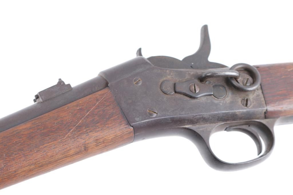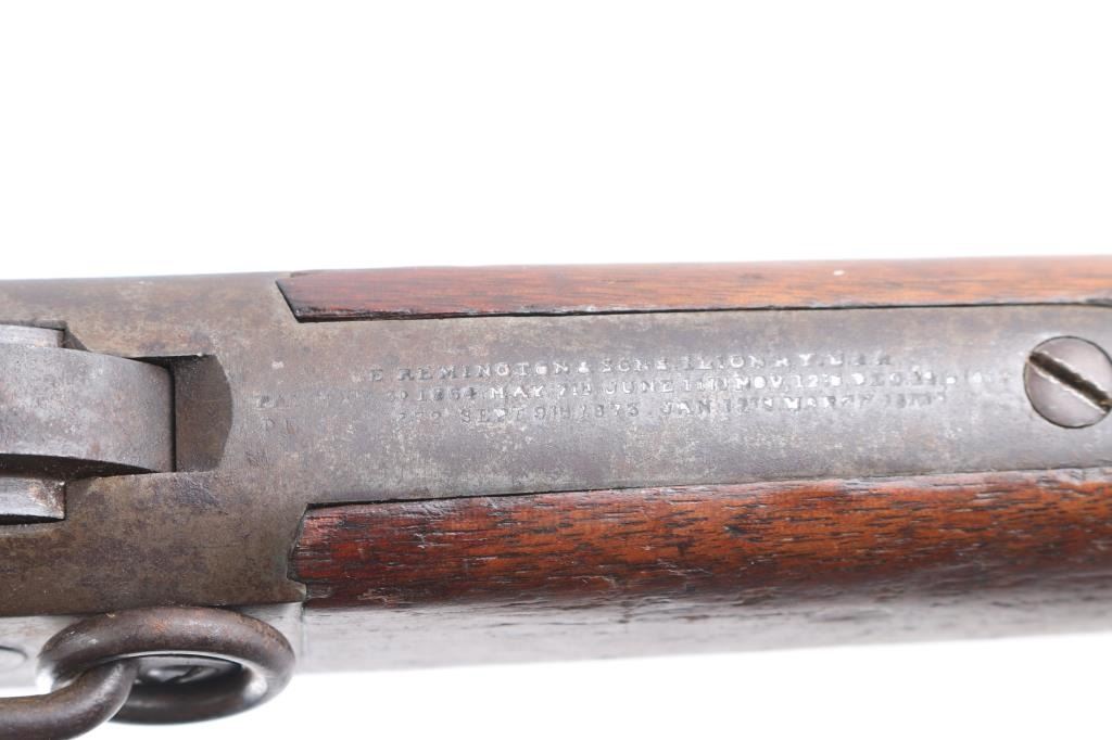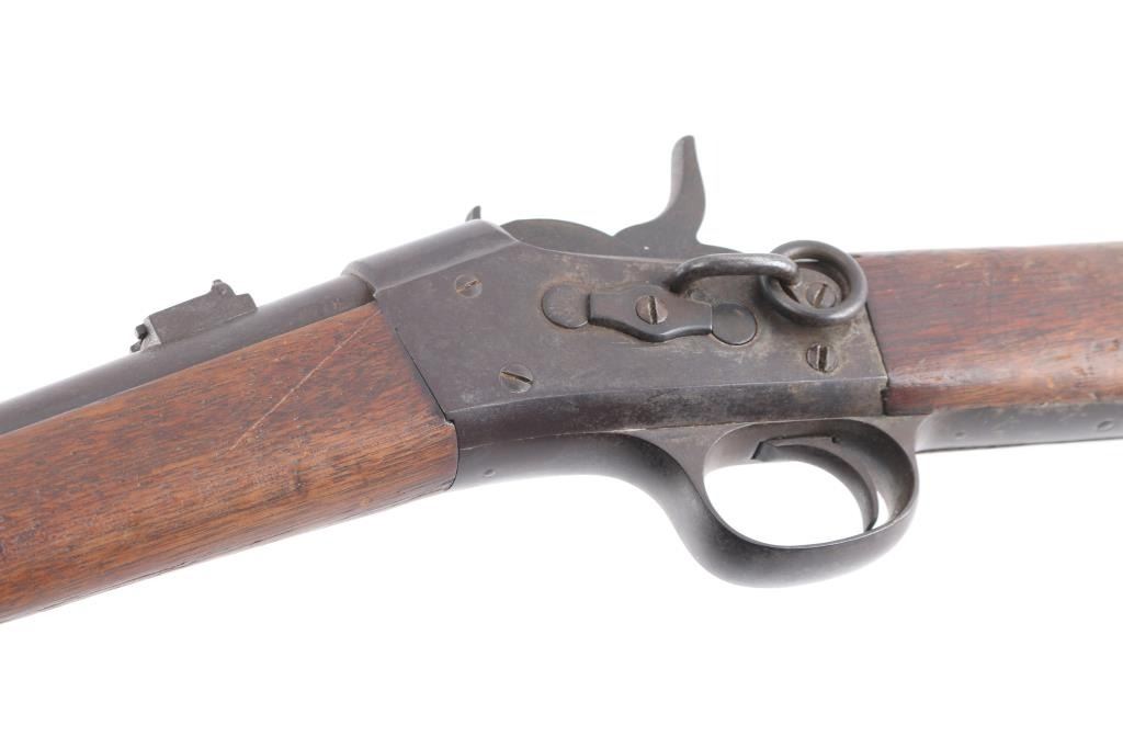 No. 1 Military Rolling Block carbine. Manufactured between 1867-1888. Not caliber marked. Features blued barrel & small parts, case hardened receiver, 20.5" barrel, pinched front sight, flip leaf rear sight with with two"V" notch sights, saddle ring on left side of receiver, curved metal carbine butt plate. Tang is marked "Remington & Sons Ilion NY USA" over two lines od patent dates, 1864-1874, feint, with somes dates worn off. Left side of barrel stamped "B", top of barrel stamped "P" above the band, and "HP" under the band, band stamped "U". Bore has good rifling/bright with light scattered pitting. Finish has turned a brown Patina, wood is sound with many scratches/dings, finish loss on the receiver. Action works well.