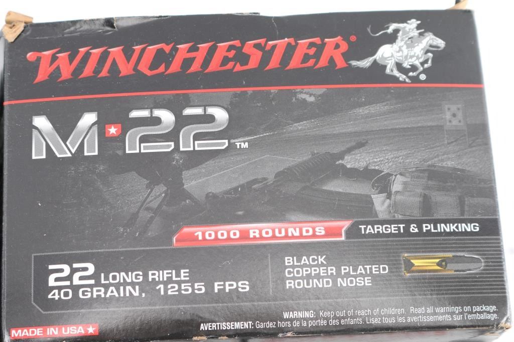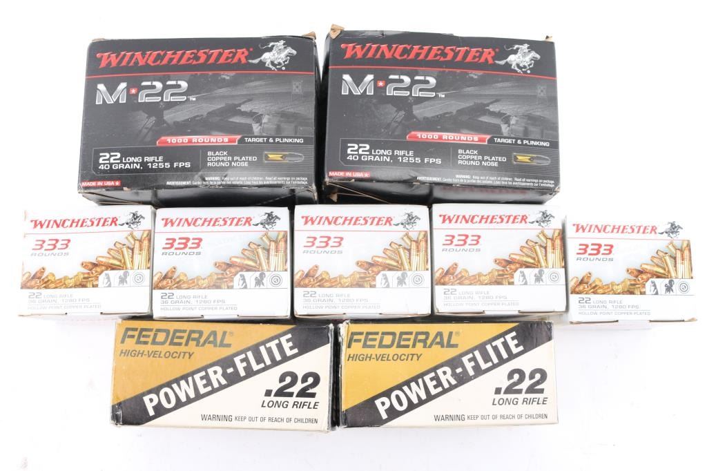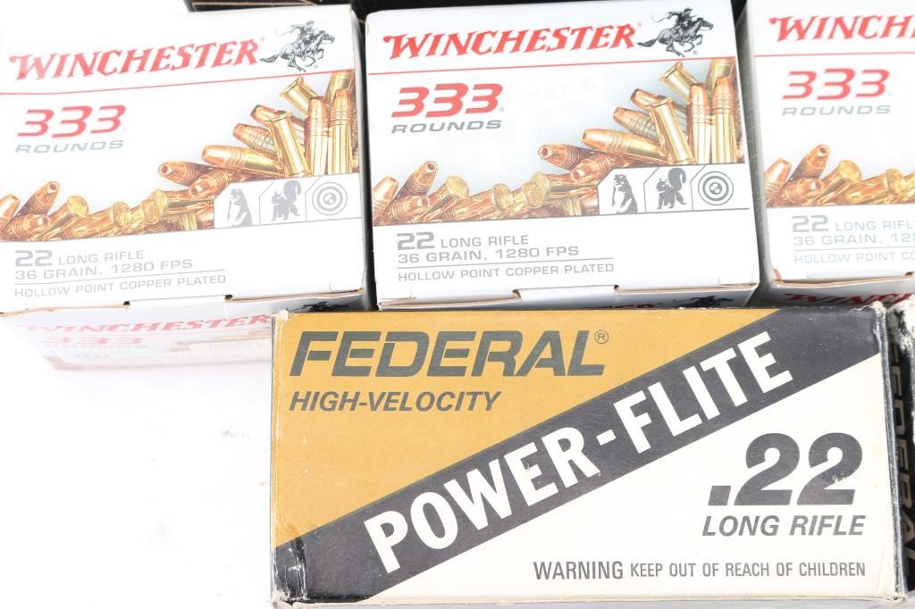 Approx. 4,665 rounds of .22 Long Rifle factory new ammunition. Winchester, 36 Gr. HP & Federal Power-Flite. All in factory boxes.