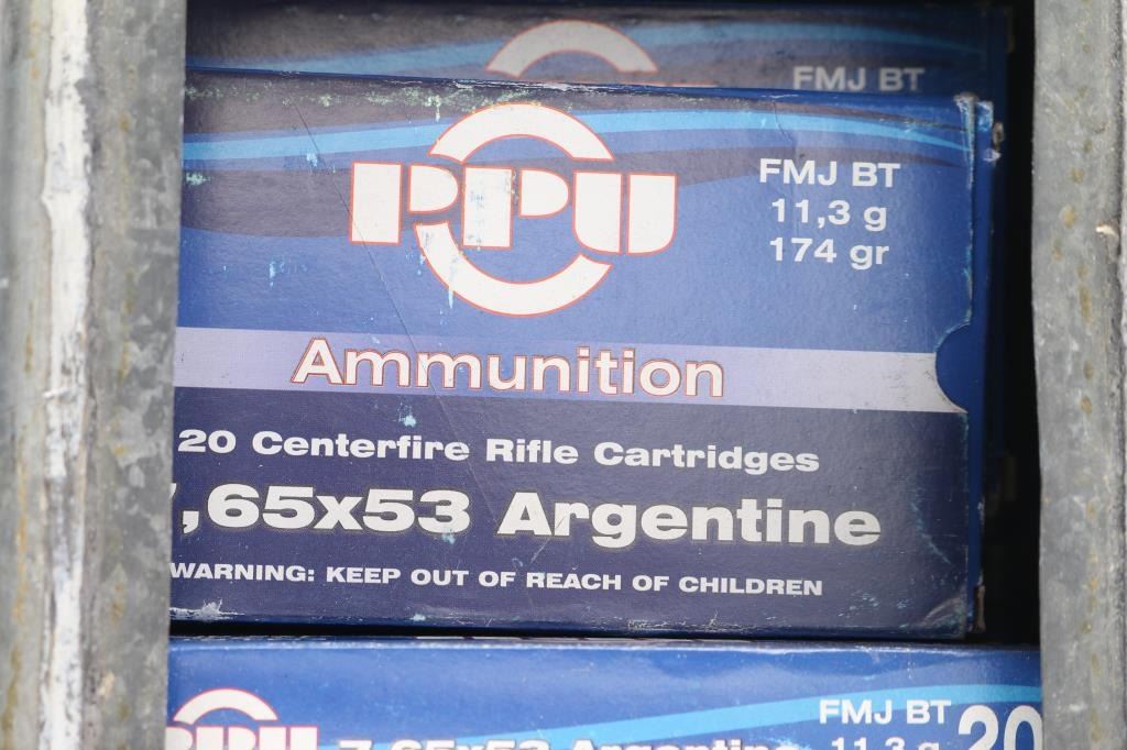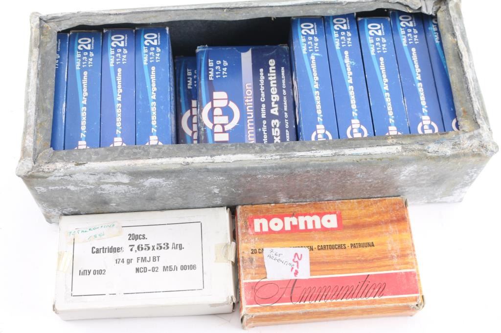 Approx. 260 rounds of 7.65 X 53 Argentine factory new ammunition. 220 rds of PPU 174 Gr. FMJ BT, 20 rds of Norma 150 Gr. SP BT & 20 rds of possible Yugo made 174 Gr. FMJ BT, all in 20 rd factory boxes.