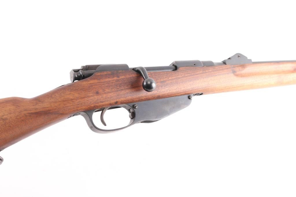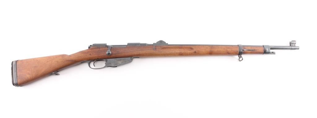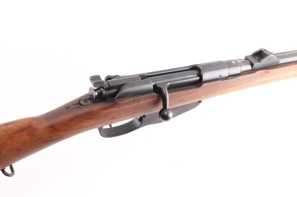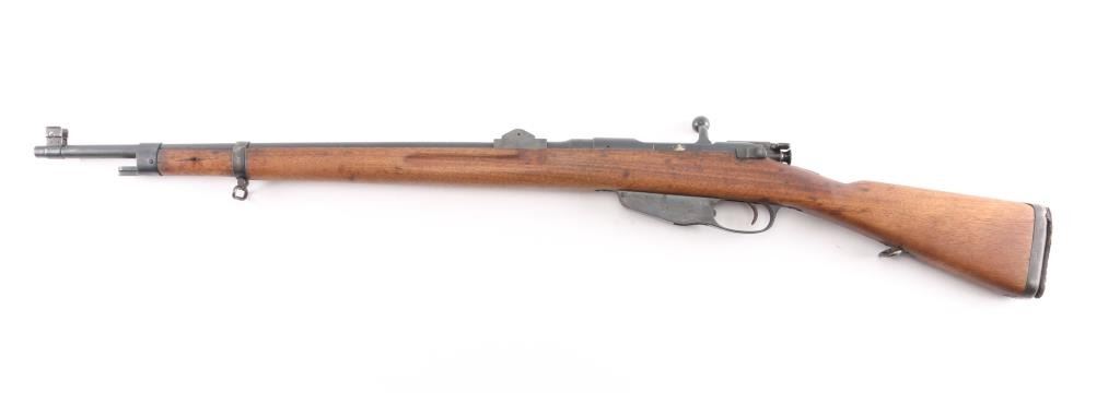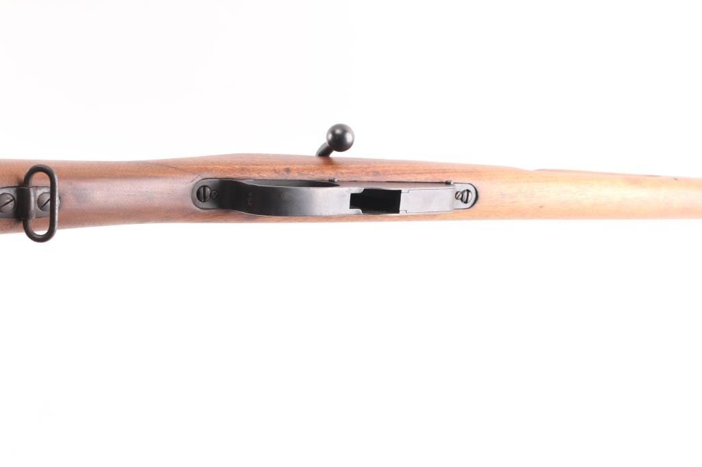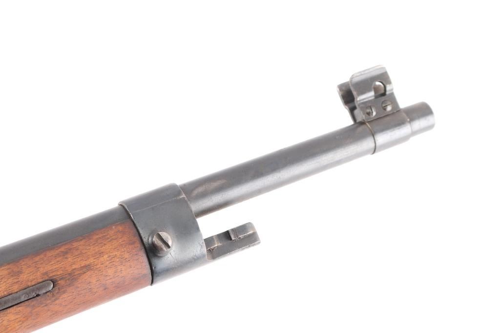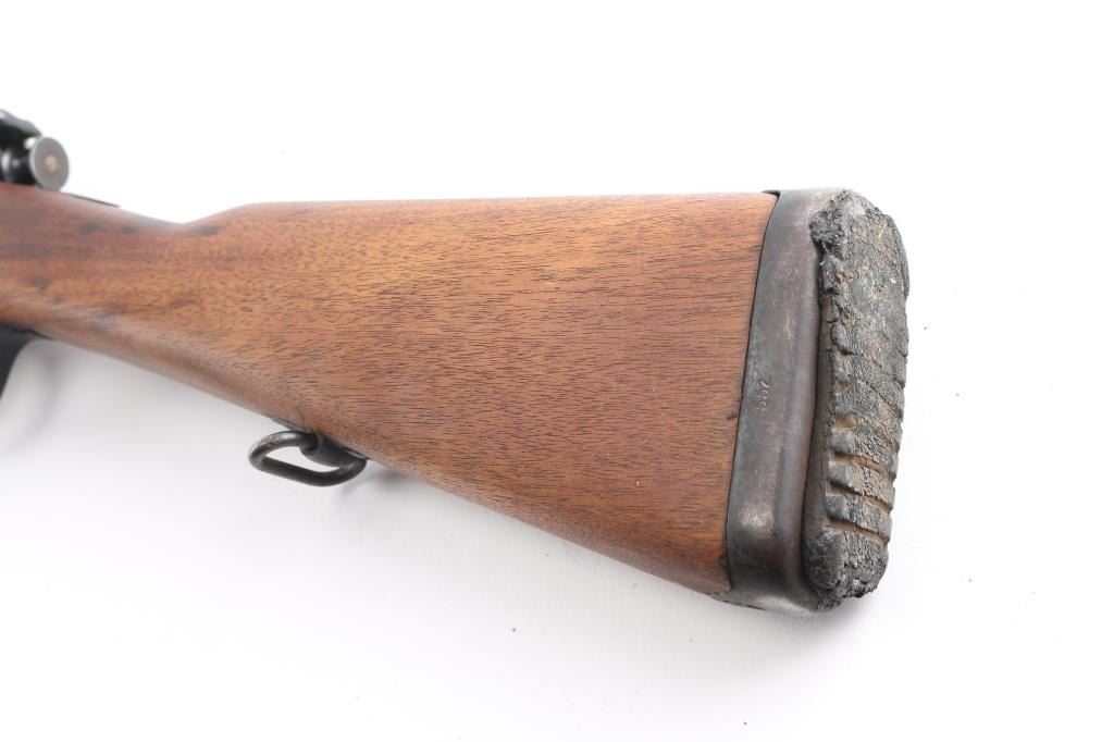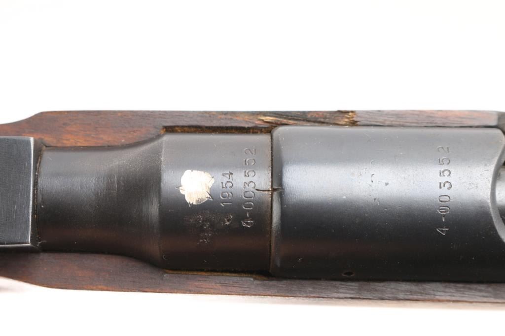SN: 4-003552. Rare Indonesian Mannlicher Model M95/1954 Rifle chambered in 7.7mm otherwise known as .303 British. This rifle is all-matching and 100% original. These M1954 Rifles were from Dutch KNIL (Royal Netherlands East Indies Army) M95 Mannlicher rifles used the Indonesians. 25: barrel, protected blade front sight, protected flip rear sight with 300, 600 meter leafs. Imported by Odin, VA, feint marked on the right chamber. Serial number matched on the receiver, barrel, trigger group, both barrel bands. Both of the Indonesian Communist stars on the chamber, and left receiver rail were scrubbed when they left military service. Bore is bright, strong rifling with some frosting in the grooves, wood and finish are excellent, correct hard rubber but pad id dry/cracked.