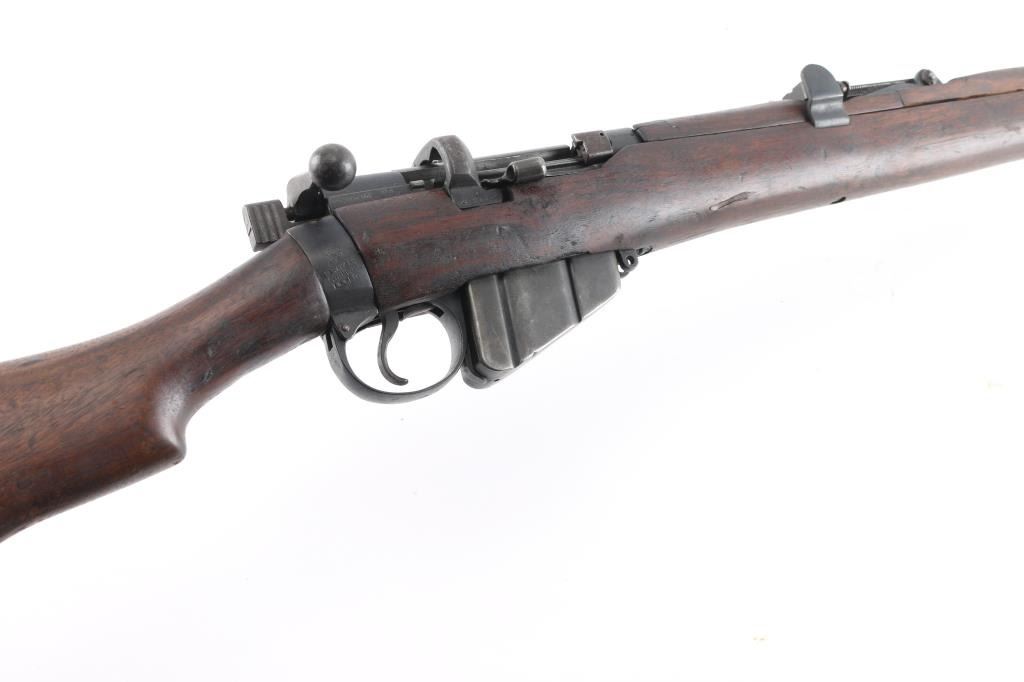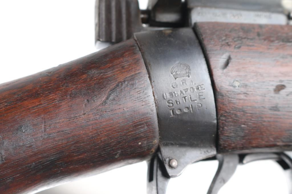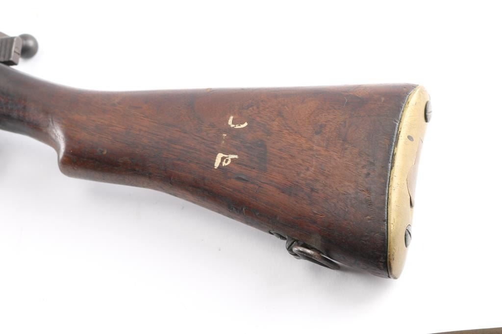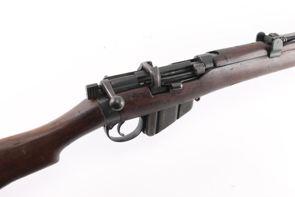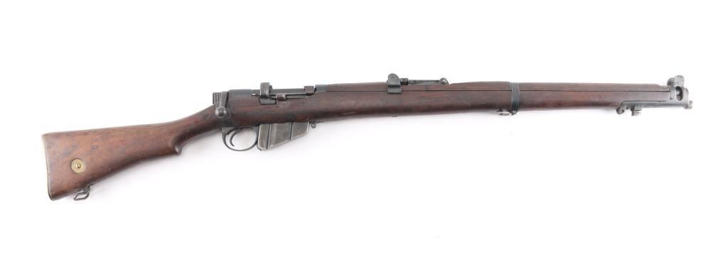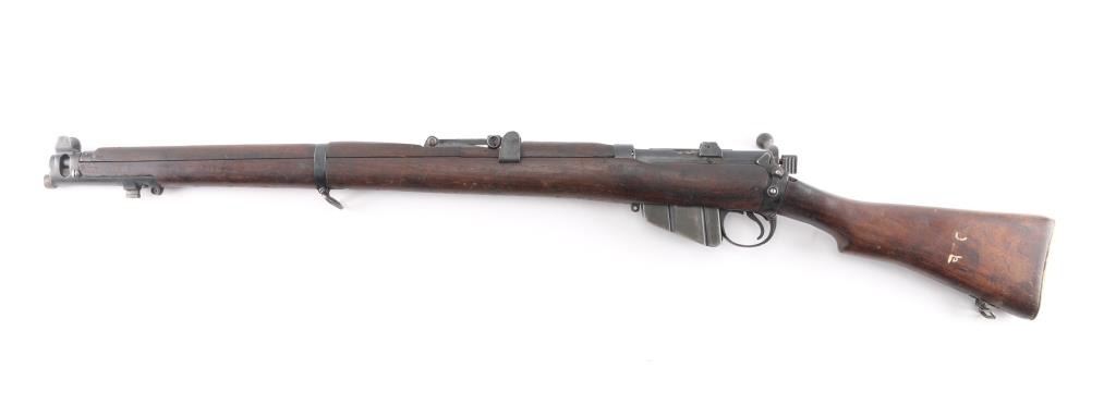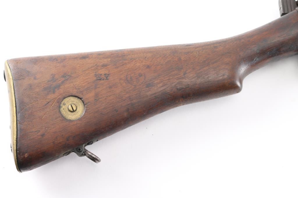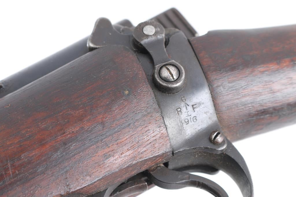 WW1 era Indian British empire military magazine fed bolt action service rifle chambered in .303 British, manufactured circa 1916. Imported by C.A.I. of St. Albans, VT with import marks on the receiver. Features a blued finish, 25.2" barrel, raised patridge front sight, shrouded leaf type rear sight graduated to 2,000 yards, metal nosecap with bayonet lug, no piling swivel & protective front sight ears, single barrel band, serrated trigger, detachable 10 round magazine, manual safety on the left side of the receiver, charge loading bridge on the receiver, smooth full-length wood hand guard & forend and straight grip shoulder stock with unmarked inlayed brass disk on the right side & brass trapdoor buttplate. magazine cut-off. Matching serial numbers are found on the receiver, rear sight. The right side of the butt socket is marked "[crown]/ G.R./Ishapore/SHT L.E/I** IP". Left butt socket is marked"C/broad arrow/RF I/1916". Numerous British proofs. Rifle retains approximately 70% of blue finish with handling/edge wear, bore is very good/bright, action is smooth, wood is good/sound with minor scratches/dings.
