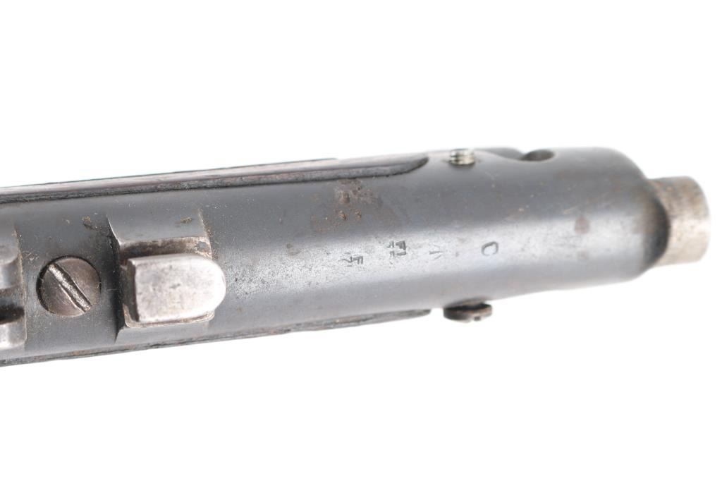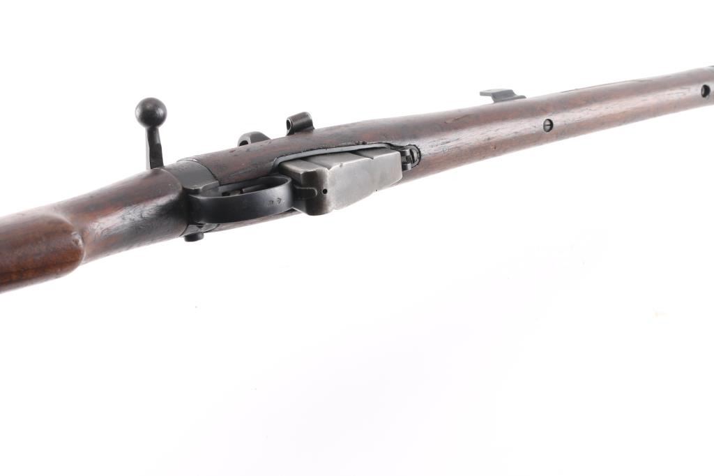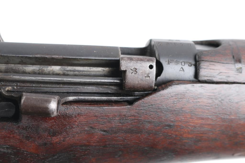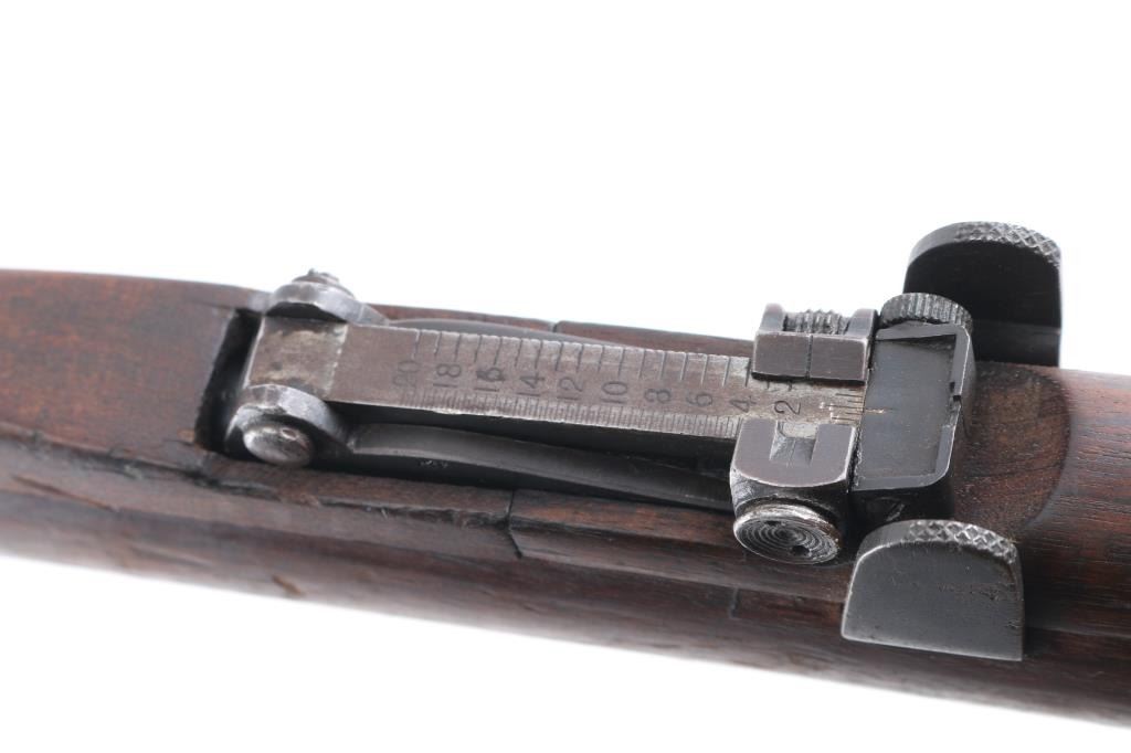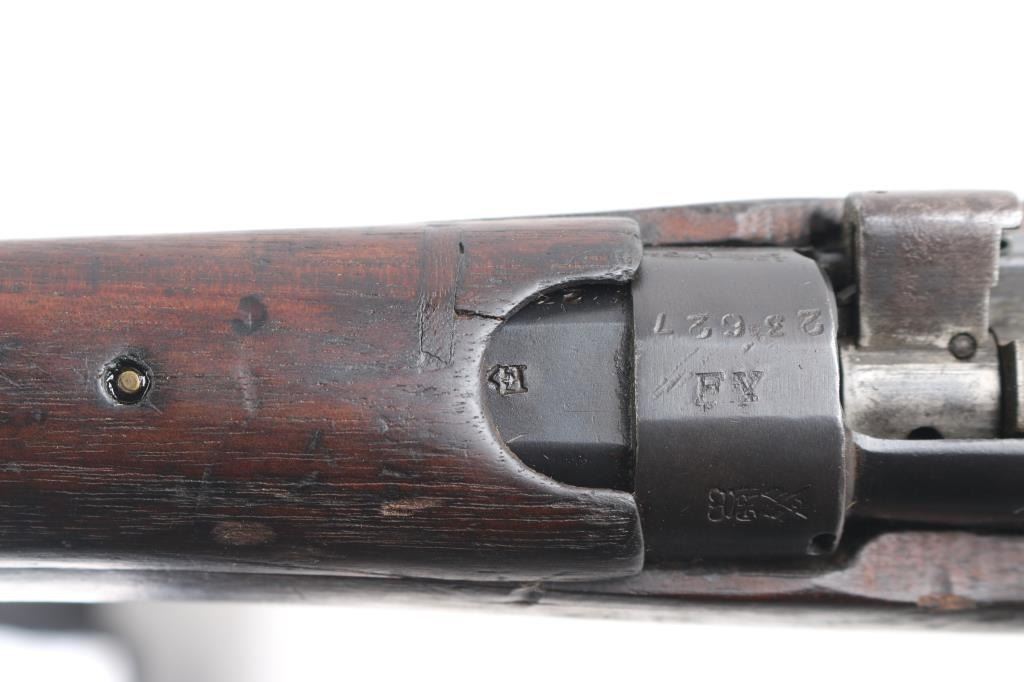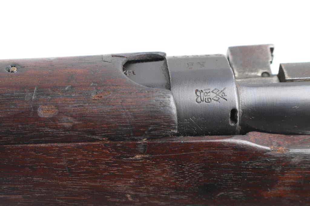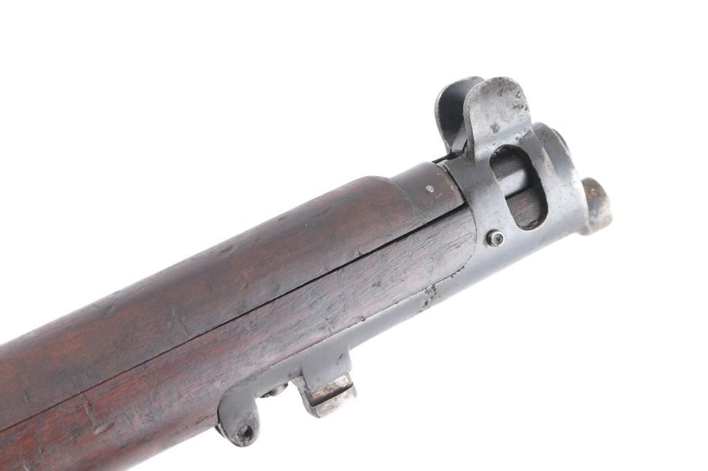 WW1 era Indian British empire military magazine fed bolt action service rifle chambered in .303 British, manufactured circa 1916. Imported by C.A.I. of St. Albans, VT with import marks on the receiver. Features a blued finish, 25.2" barrel, raised patridge front sight, shrouded leaf type rear sight graduated to 2,000 yards, metal nosecap with bayonet lug, no piling swivel & protective front sight ears, single barrel band, serrated trigger, detachable 10 round magazine, manual safety on the left side of the receiver, charge loading bridge on the receiver, smooth full-length wood hand guard & forend and straight grip shoulder stock with unmarked inlayed brass disk on the right side & brass trapdoor buttplate. magazine cut-off. Matching serial numbers are found on the receiver, rear sight. The right side of the butt socket is marked "[crown]/ G.R./Ishapore/SHT L.E/I** IP". Left butt socket is marked"C/broad arrow/RF I/1916". Numerous British proofs. Rifle retains approximately 70% of blue finish with handling/edge wear, bore is very good/bright, action is smooth, wood is good/sound with minor scratches/dings.