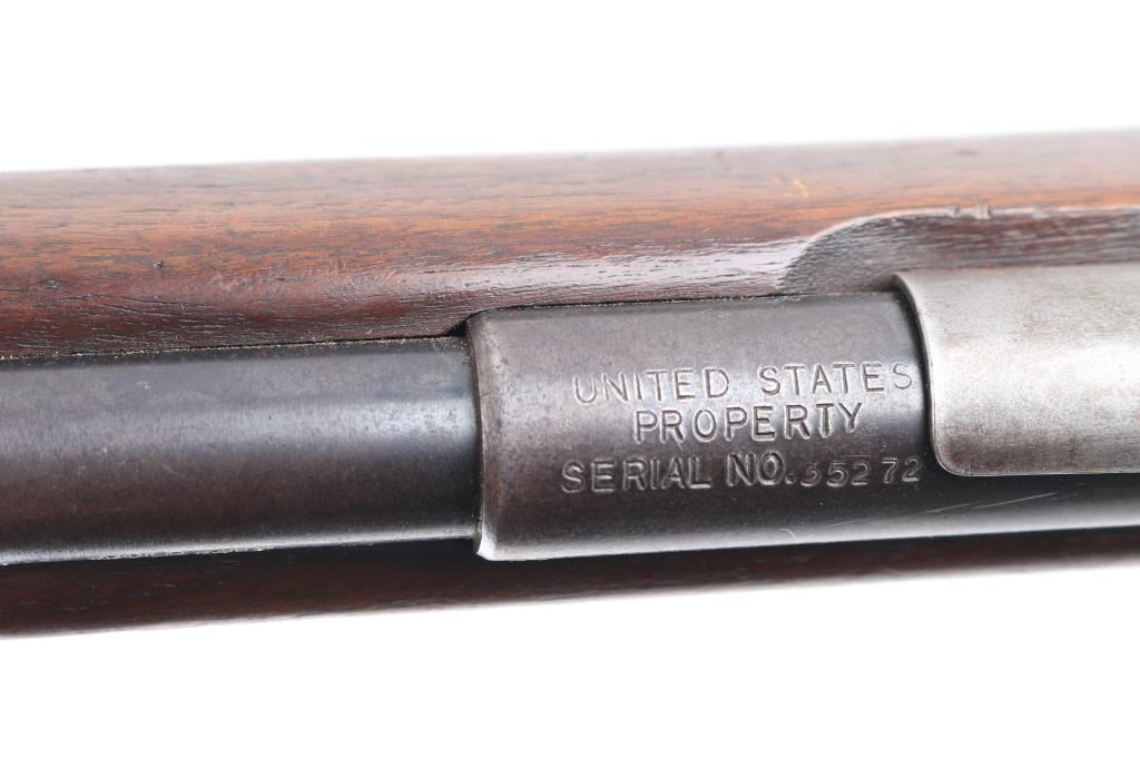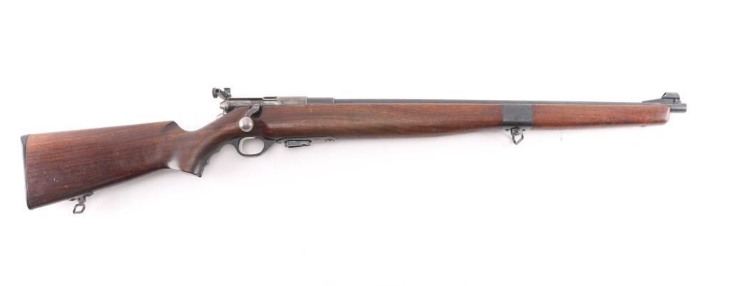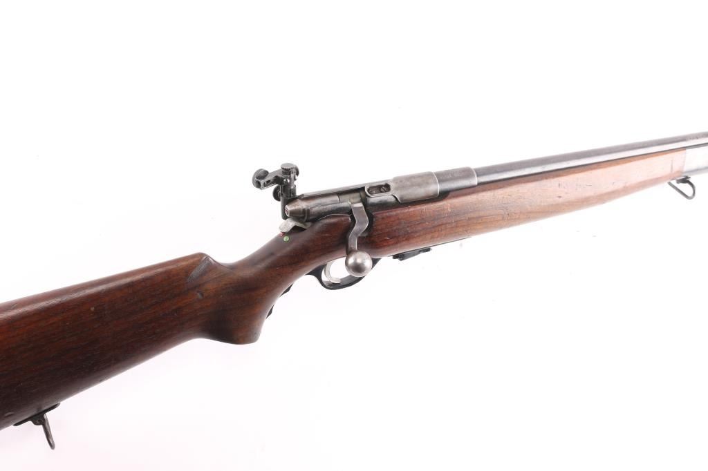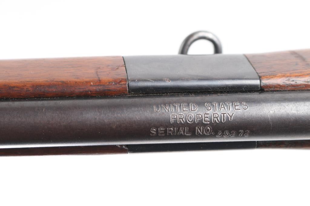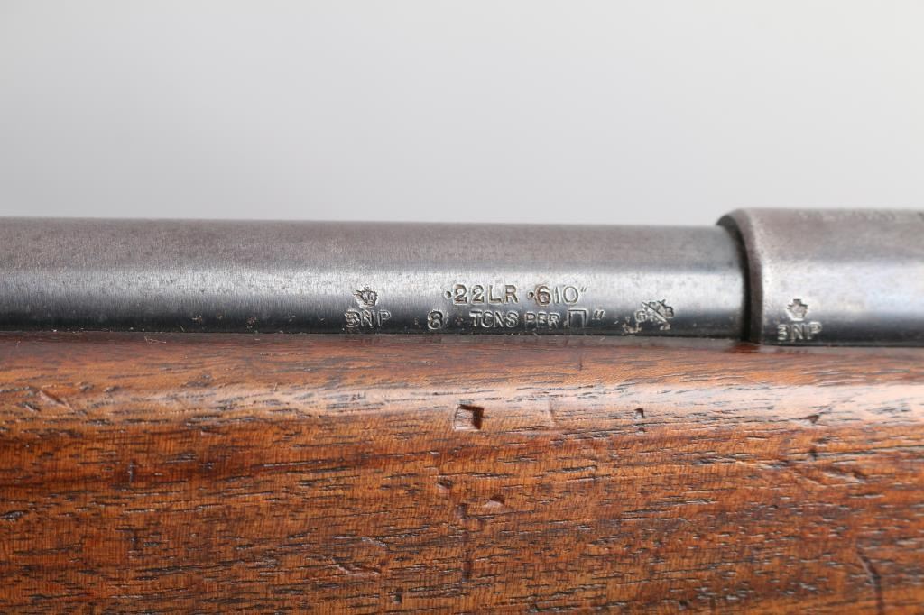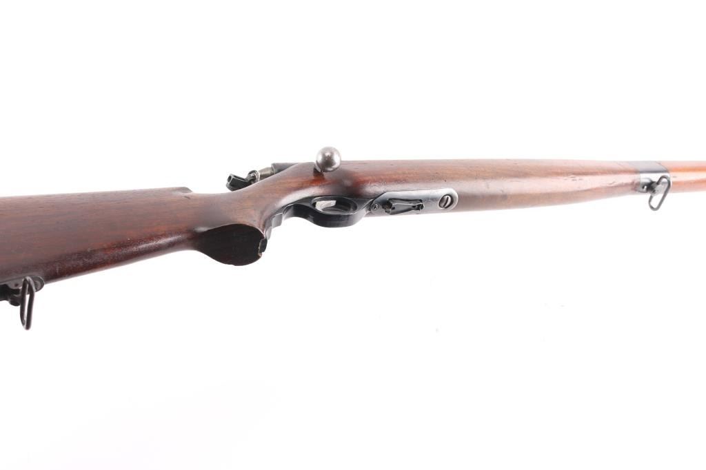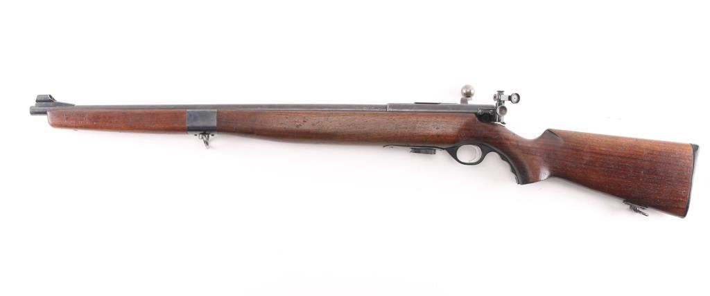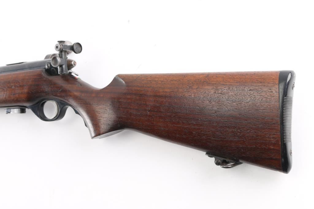 U.S. British Lend-Lease military magazine fed bolt action training rifle chambered in .22 S/L/LR, manufactured in New Haven, CT circa 1944-1950. Features a blued finish, 23” barrel, hooded post front sight with bead top, receiver mounted Mossberg S-130 adjustable aperture sight, serrated trigger, synthetic trigger guard with finger grooves, cocked indicator on the rear of the bolt, manual safety on the rear of the receiver, bent bolt handle with round knob, dust cover attached to the bolt, detachable 7 round magazine, sling swivels and two-piece full length smooth walnut semi-pistol grip stock with factory plastic butt plate. The barrel and receiver are both marked “UNITED STATES/PROPERTY/SERIAL NO. 35272” and the barrel, and receiver are stamped with Birmingham nitro proof marks. (BNP) Rifle retains approximately 60% of its original blued finish showing edge wear, thinning/handling loss on the bolt/receiver. Action is sound, the bore is pristine and the wood stocks are very good with minor scratches dings.