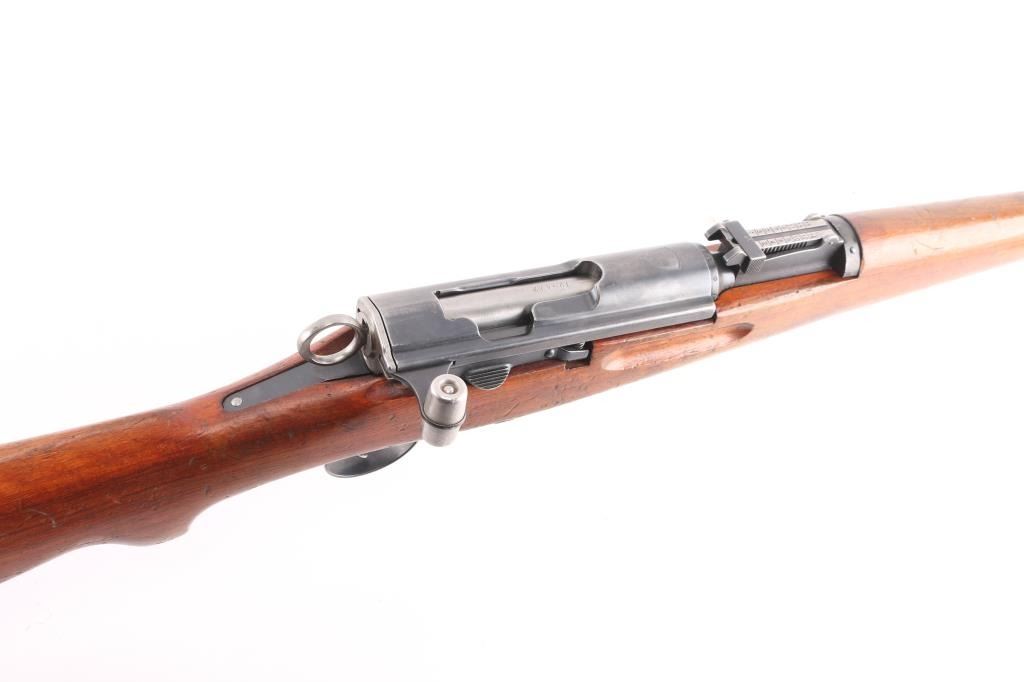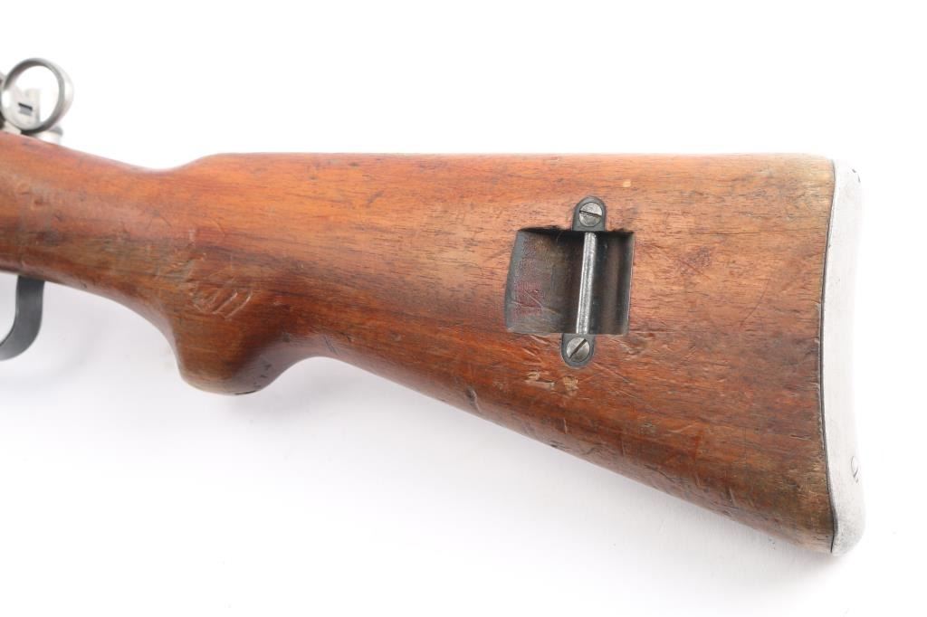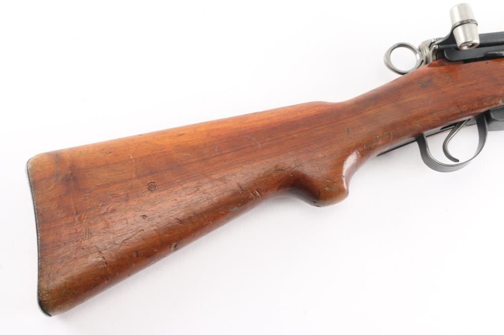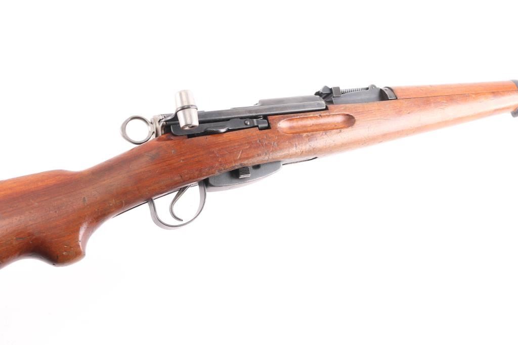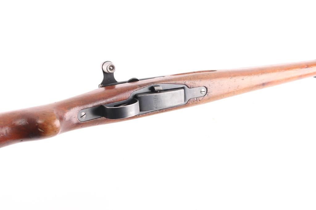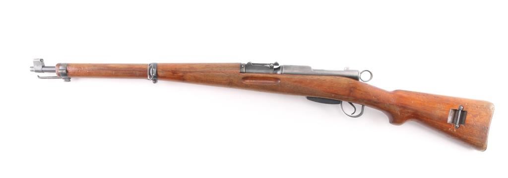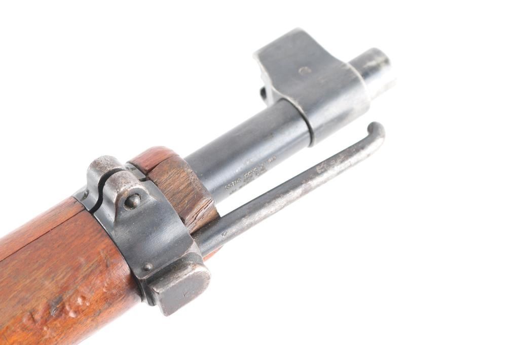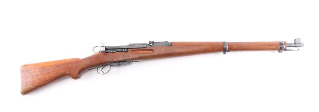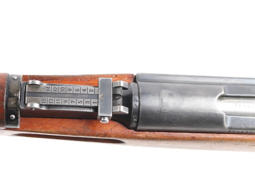 SN: 792472. Schmidt–Rubin' Swiss military straight pull bolt action rifle imported by M&M Co., marked on the underside of the barrel. Features blued finish, wood semi pistol grip stock, 25" barrel, bayonet lug, stacking hook, blade front sight inside protective ears, tangent rear sight, sling swivels, detachable magazine, "beer barrel" shaped aluminum bolt knob. Swiss cross in shield on chamber. Bore is excellent/bright. Retains about 75% coverage of blued finish, showing edge losses & handling marks, handling loss on the receiver. Bolt assembly is mostly bright polished, some blued pieces, overall in very good condition. Stock is good/sound, many small dents. Original serial number matched on receiver, barrel, bolt, magazine.