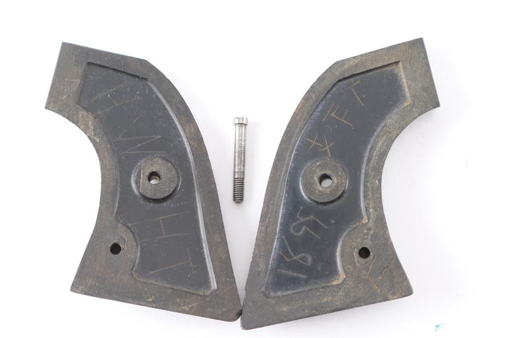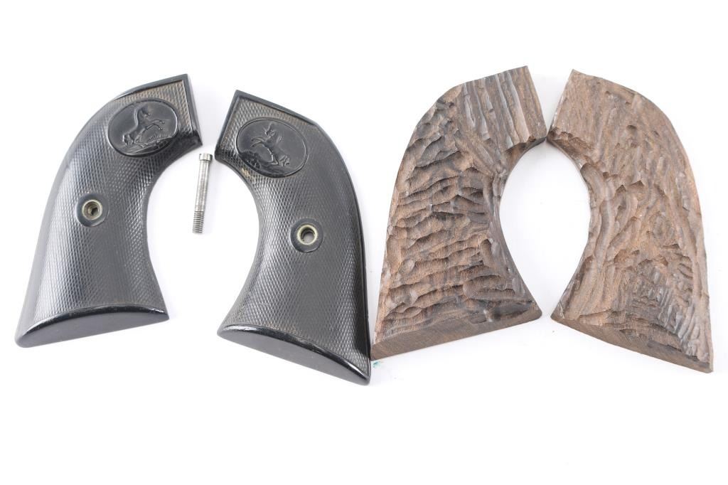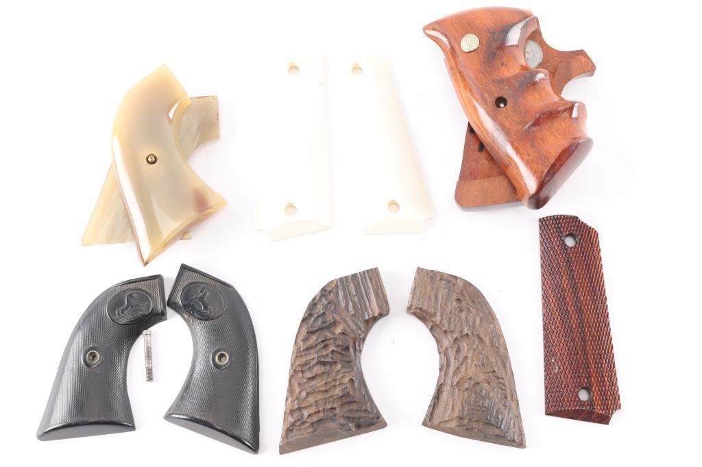 including a pair of solid faux Ivory 1911 grips, a pair of S&W medallion finger groove wooden grips, black SAA grips, pair of light gray polished resin grips, pair of wood grips for a 1911 & pair of unknown wood carved grips.