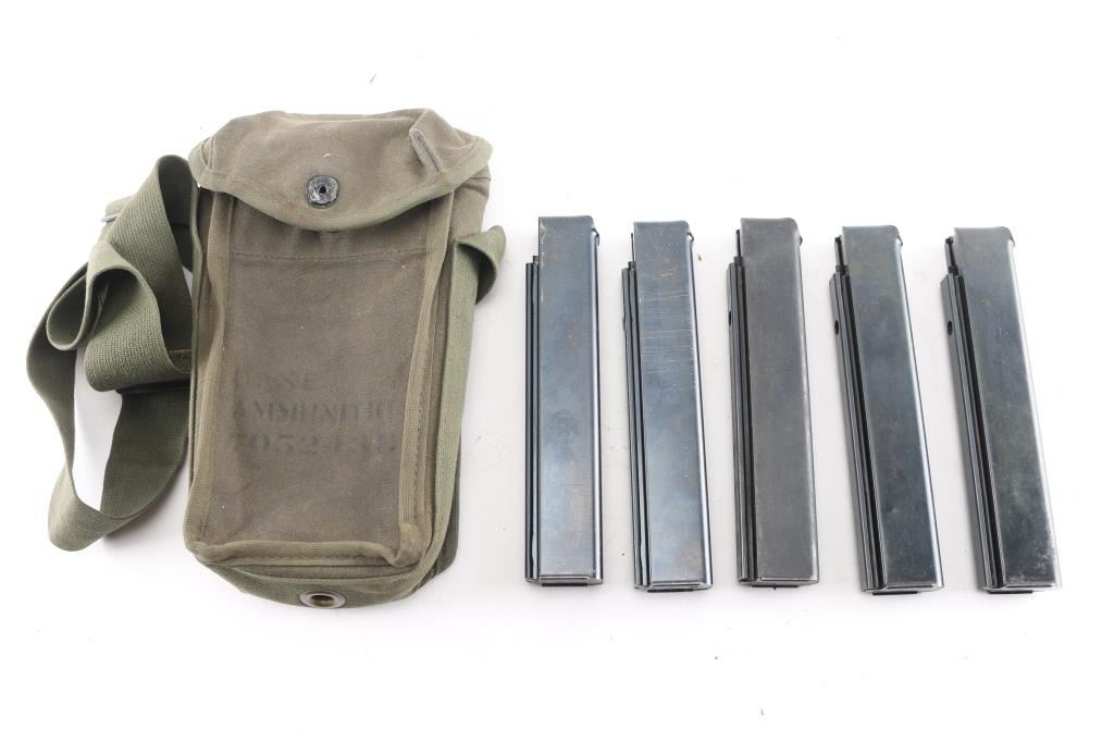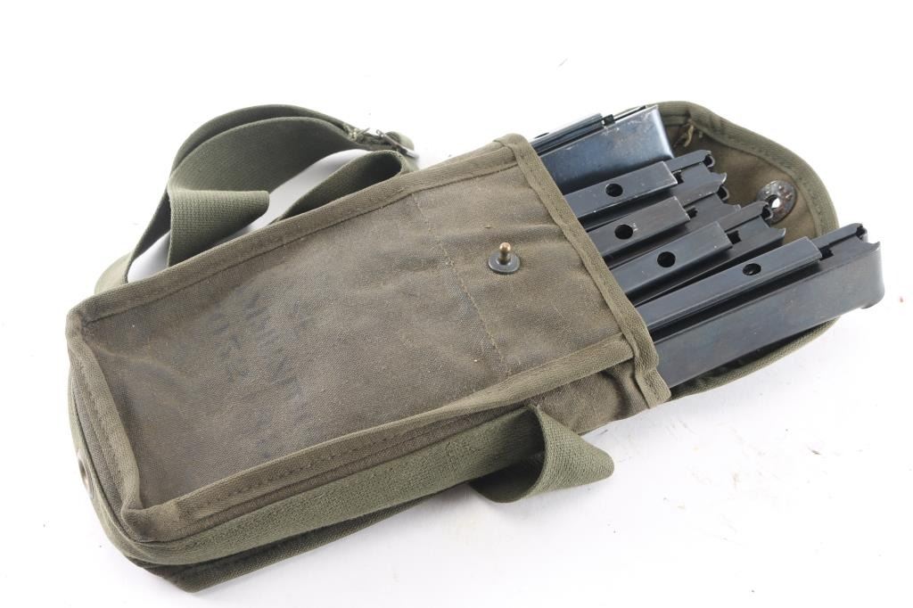 Five mags, four marked "Seymour" (very good condition) and one Crosby (good condition). Includes a green cotton web pouch with blet loop and shoulder strap.