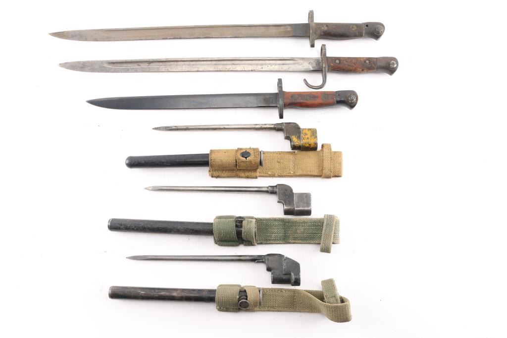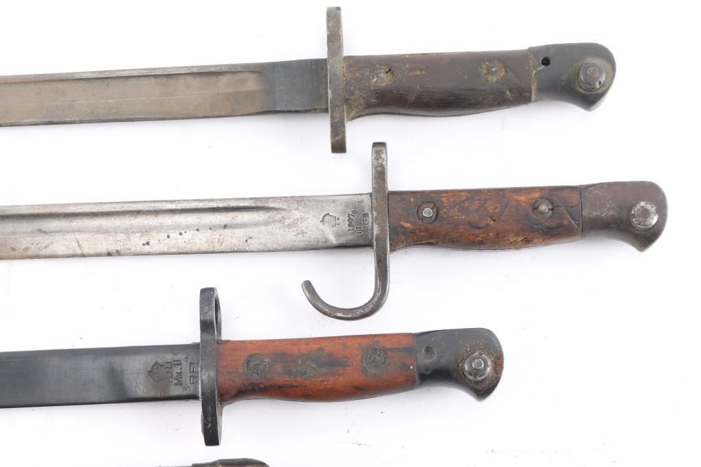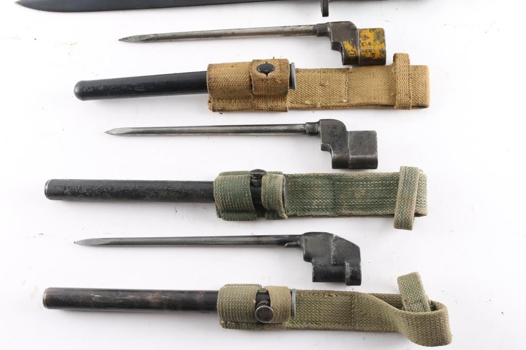 Six Total. 1) No.4 spike bayonet with rare Mk III plastic scabbard, tan canvass frog. 2) P1907 Mk I bayonet with rare hooked Quillon, 11-09 dated, crown over ER, British proofs, and "EFD" (Enfield), 16 3/4" blade, no scabbard. 3) P1907 Remington bayonet, 16 3/4" blade, dated 11-15, British proofs, Quillon removed, no scabbard. 4) P1907 Mk II marked G.R.I. under crown(Georgius Rex Imperator), and RFI ( Rifle Factory Ishapore) 3-42 dated, no scabbard. 5) Two No. 4 spike bayonets with round Mk II scabbards, both have green canvass frogs.