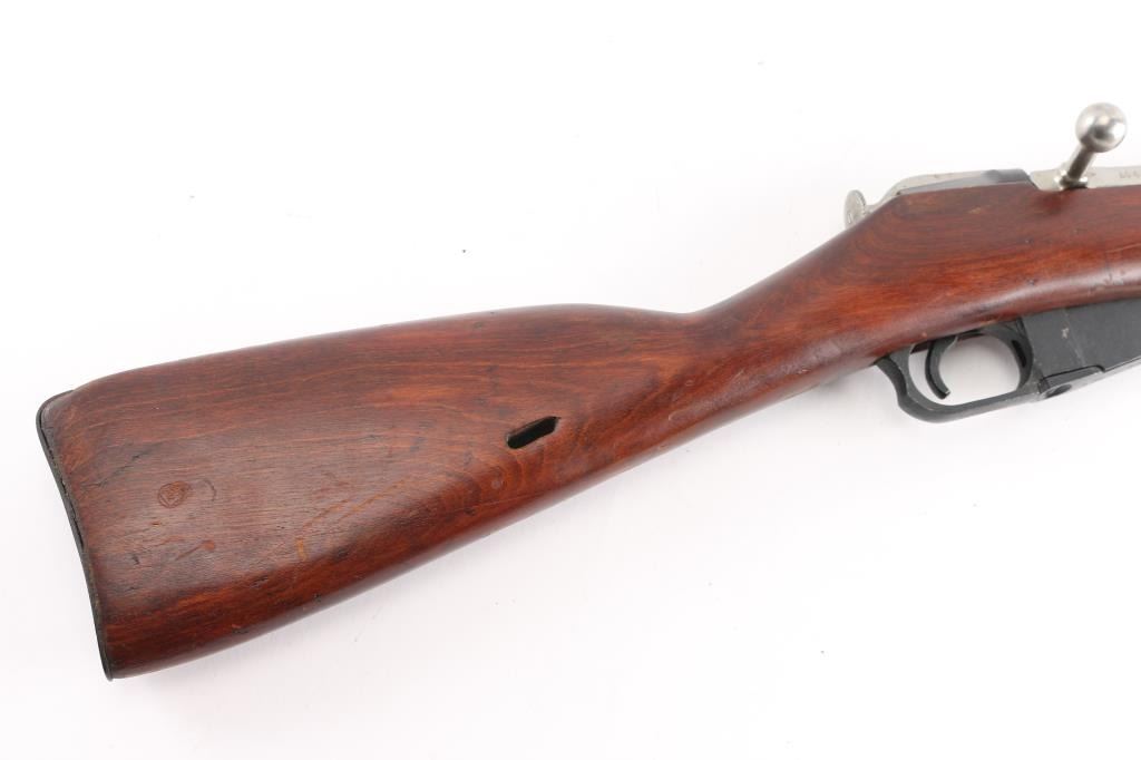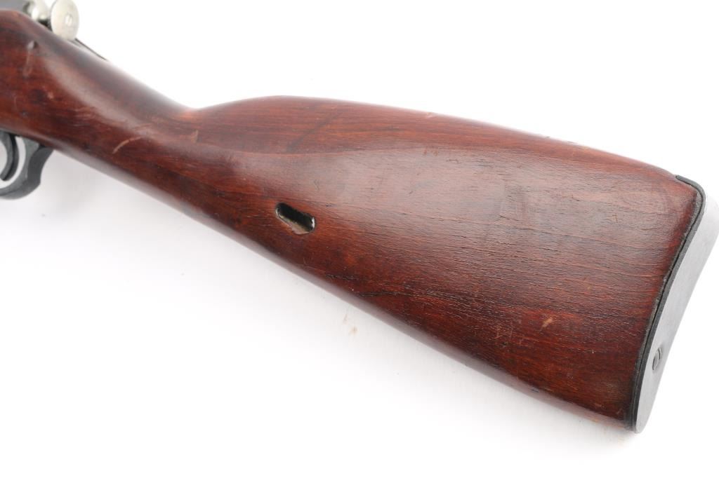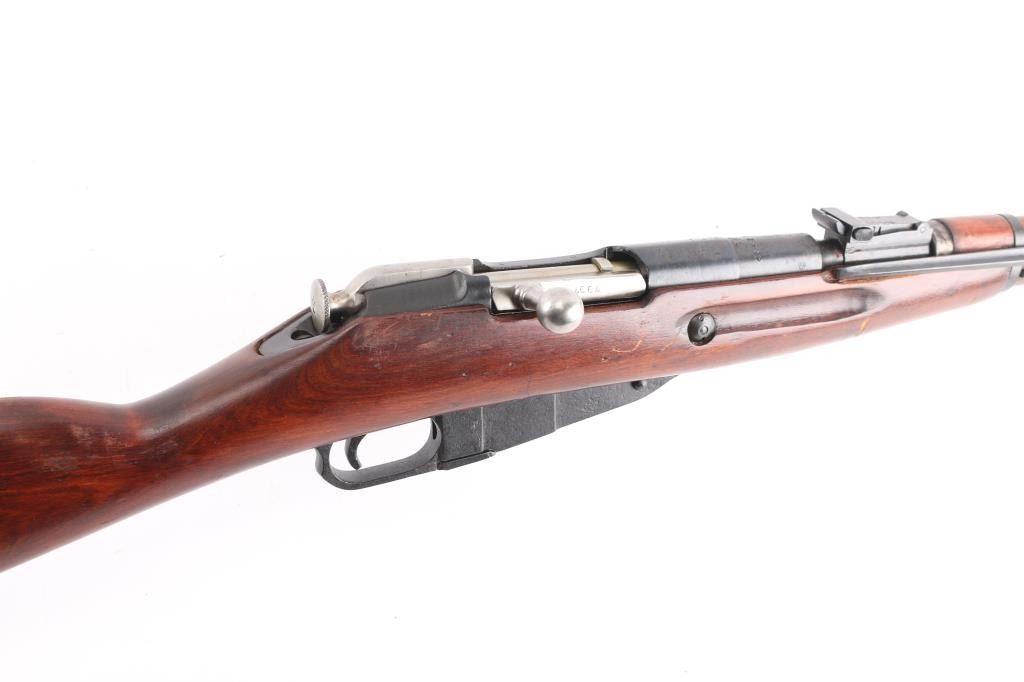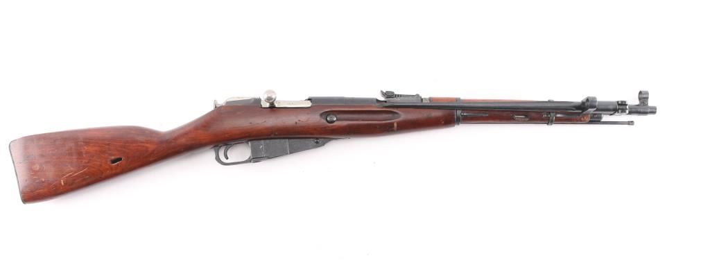 Russian Mosin Nagant military bolt action rifle dated 1944, imported by PW Arms. Features 20" barrel, post front sight inside protective ring, tangent style rear sight, manual safety, straight bolt handle, sling slots, cleaning rod under barrel, folding spike bayonet. Bore is very good/bright, strong rifling. Retains 90% dark blued arsenal refinish with small scratches and handling marks, small area of very light pitting on the chamber. Bolt assembly is very good polished bare metal. Laminated stock & handguard are good condition, good fit to metal with some scratches/gouges. Serial numbers matched barrel shank, floorplate, bolt, and steel butt plate..