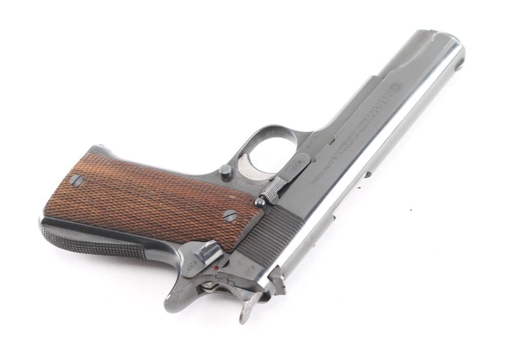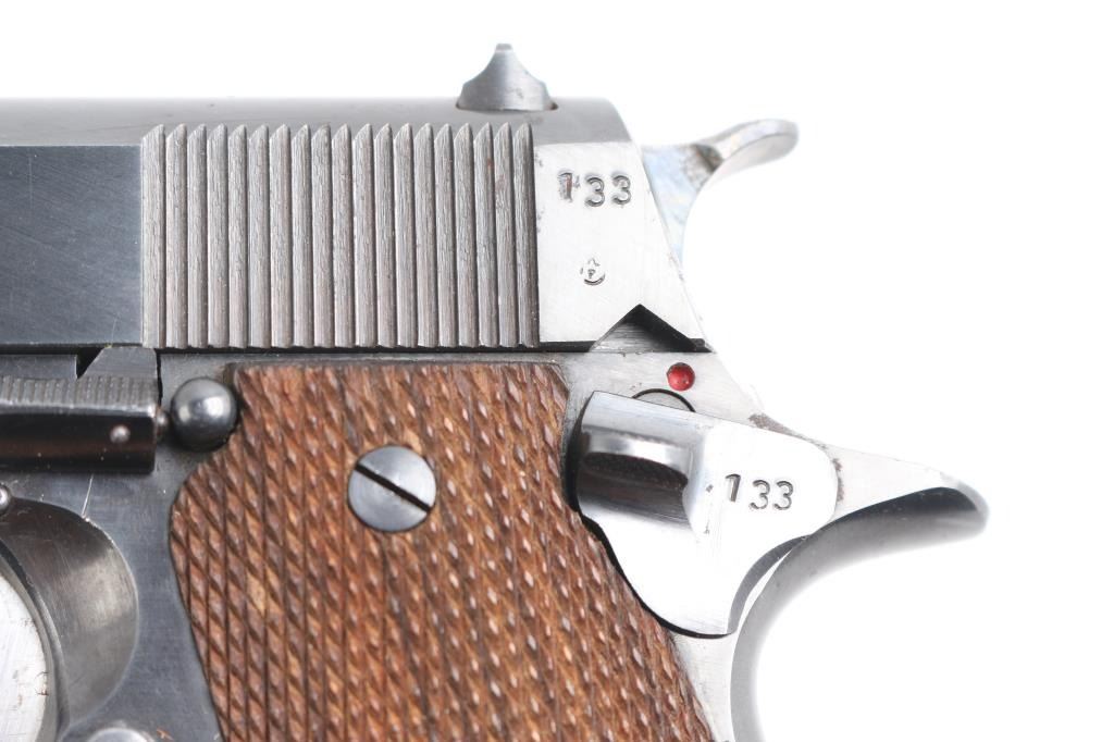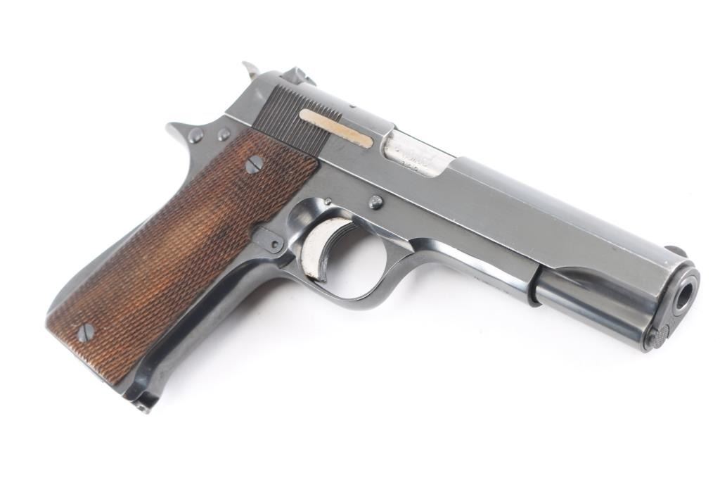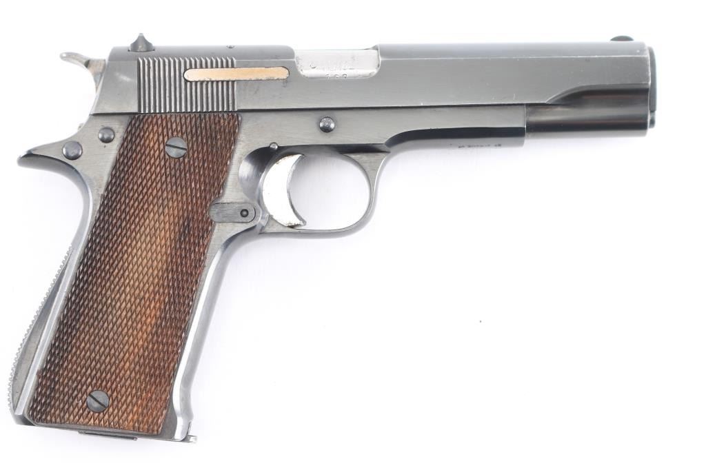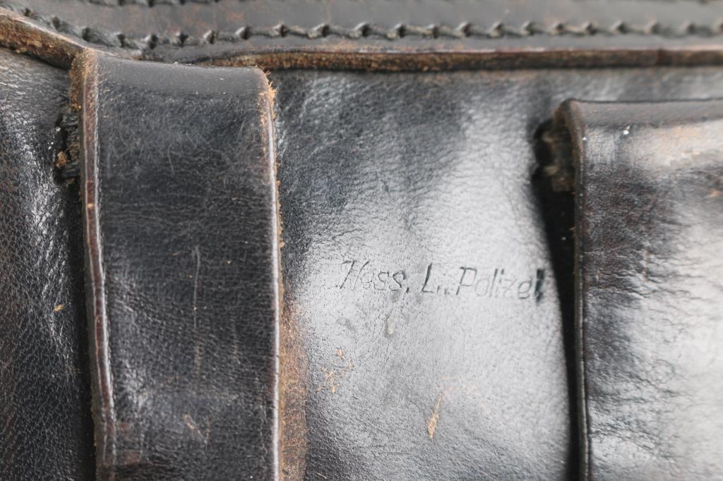 'German Police Use' Spanish 9x19mm semiautomatic pistol imported by Century Arms, St Albans VT. Features blued finish, checkered wood grips, single action trigger, 5" barrel, fixed sights, frame mounted manual safety, push button mag release. Bottom of grip marked with "lion under crown" emblem, for Hesse. Bore is very good. Retains 90% blue with handling marks. Grips are very good condition with minor blemishes. Numbers match where observed, "133", including the two magazines (both numbered "133", also marked "1" and "2"). Includes fair condition black leather full flap holster (stamped on back "Hess. L. Polizei")..