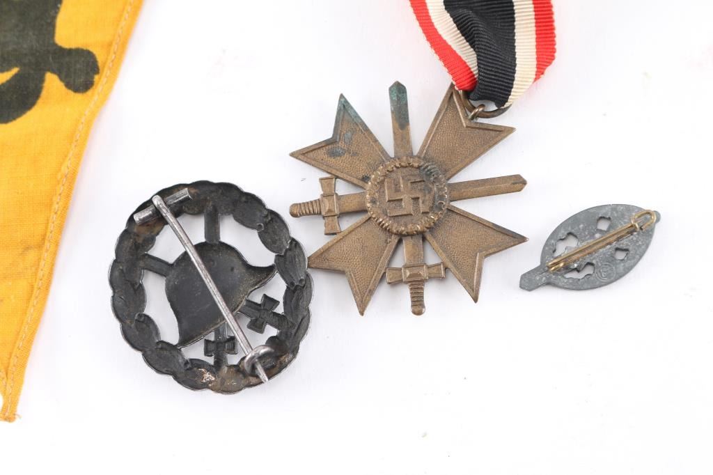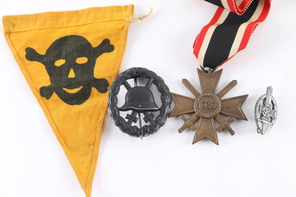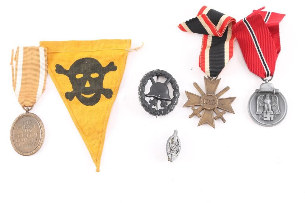 Includes War Merit Cross with Swords, 2nd class, with correct ribbon, West wall Medal with correct ribbon, The Eastern Medal, officially the Winter Battle in the East 1941–42 Medal, with correct ribbon, WW1 stamped wound badge in black, small Third Reich veterans tinnie, sword, swastika, Maltese cross in wreath, RZM marked. Also included is a Pioneer land mine warning flag yellow cotton construction, inverted, triangular flag with a small, black printed, skull and cross bones. All in very good condition, original.