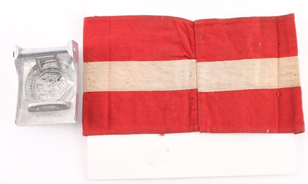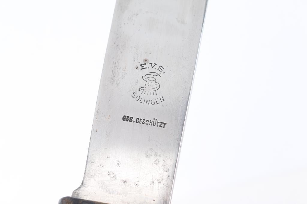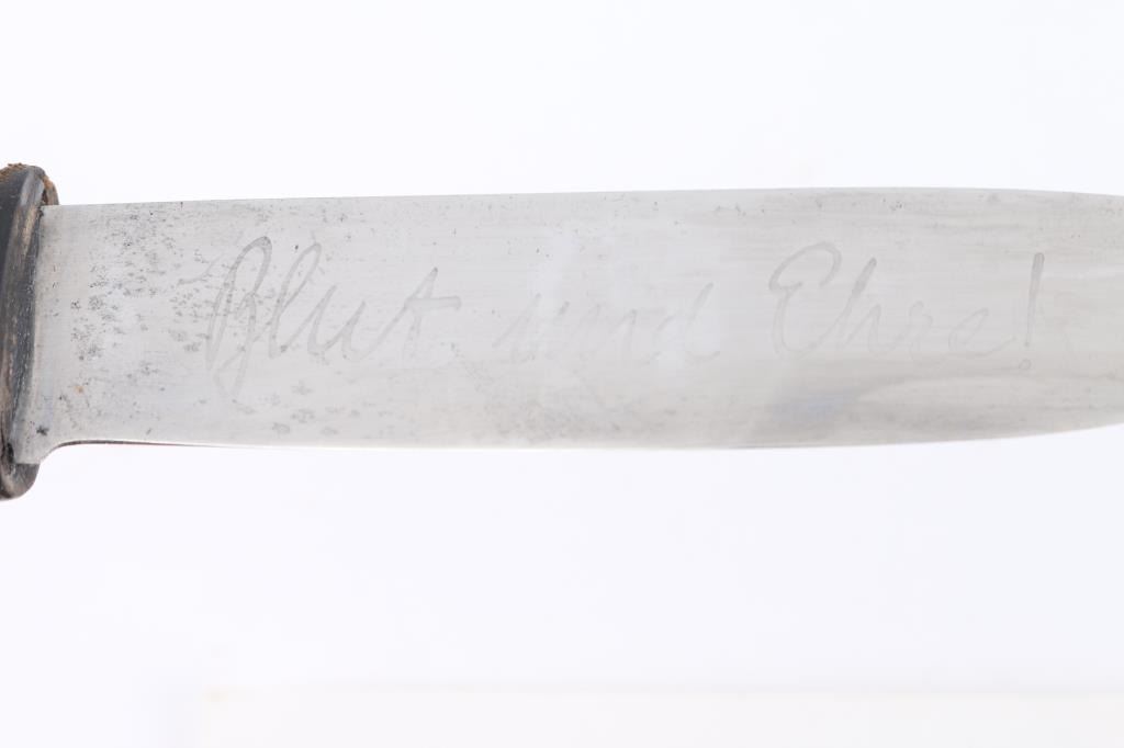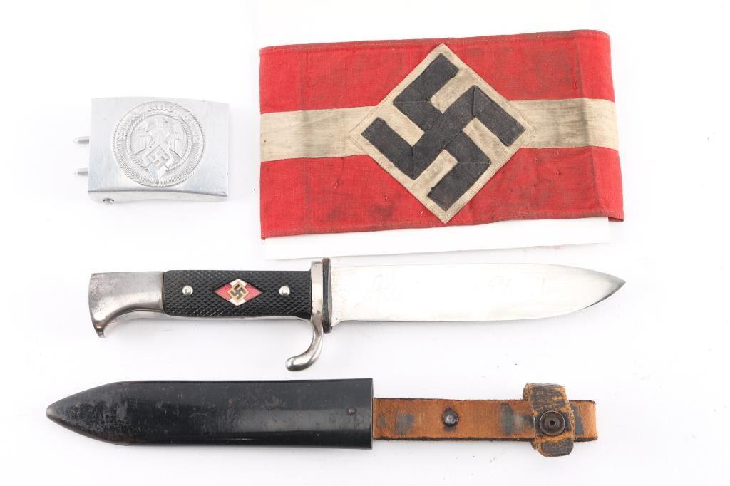 Includes Original German M33 WWII Early Motto-Marked HJ Knife by E.V.S of Solingen with Scabbard. The acid-etched motto Blut und Ehre! (Blood and Honor!) is present and legible but the original dark etched finish has been polished off by use. Early with no RZM markings. Overall very good, with scuffs to the steel scabbard leather. HJ armband, good, intact, dirty. HJ aluminum belt buckle marked "RZM M 4/101" 1. By Dominik Schönbaumsfelds & Sohn. Very good condition. Original items.