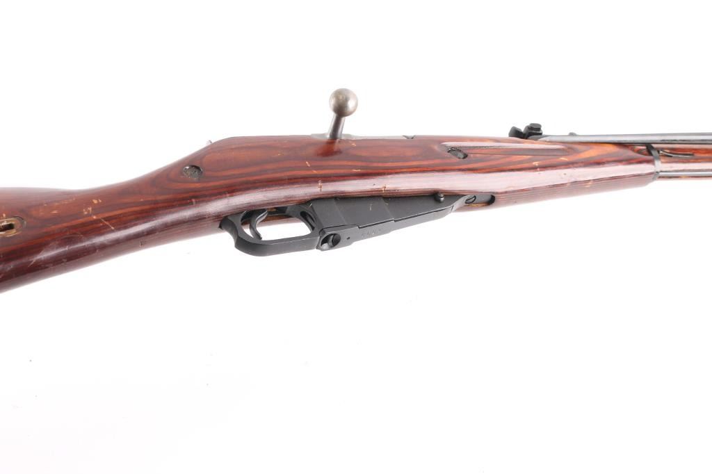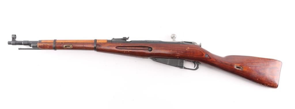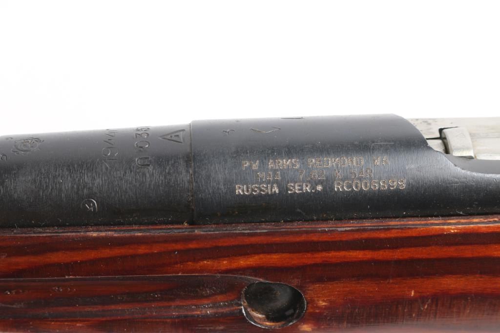 Russian Mosin Nagant military bolt action rifle dated 1944, imported by PW Arms. Features 20" barrel, post front sight inside protective ring, tangent style rear sight, manual safety, straight bolt handle, sling slots, cleaning rod under barrel, folding spike bayonet. Bore is very good, needs cleaning, strong rifling. Retains 95% dark blued arsenal refinish with small scratches and handling marks. Bolt assembly is very good polished bare metal. Laminated stock & handguard are good condition, good fit to metal with some finish loss, scratches/gouges. Original Russian serial numbers matched on barrel shank, floorplate, bolt, & steel butt plate.
