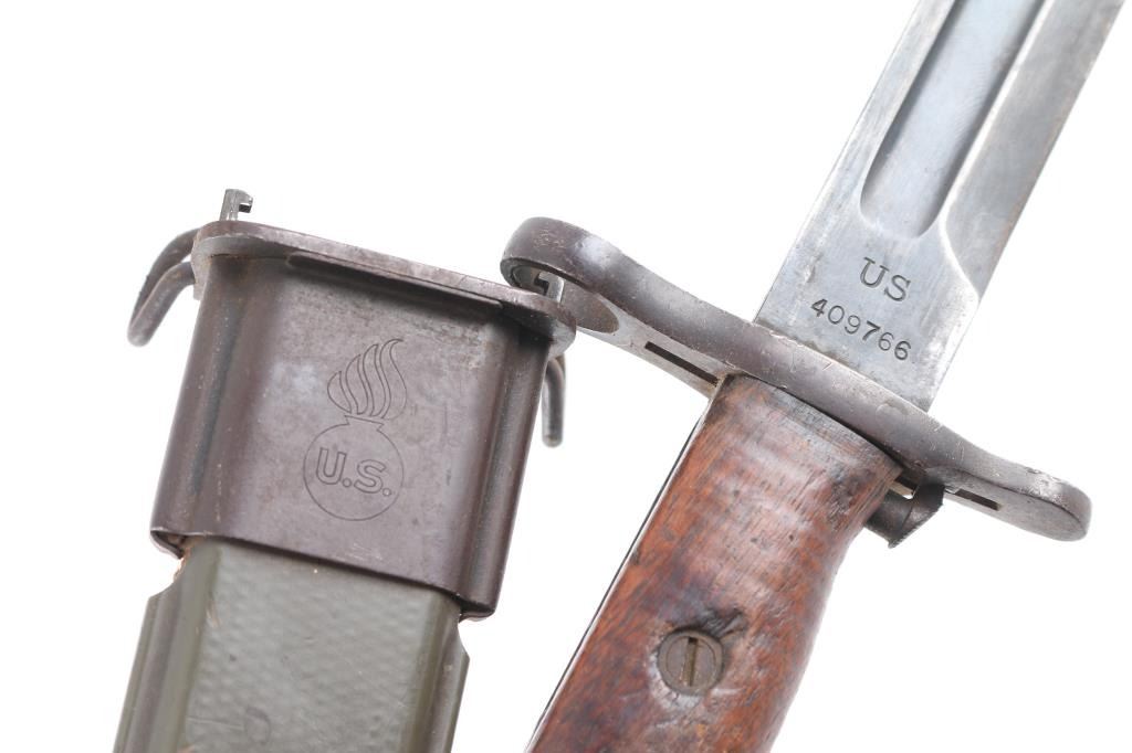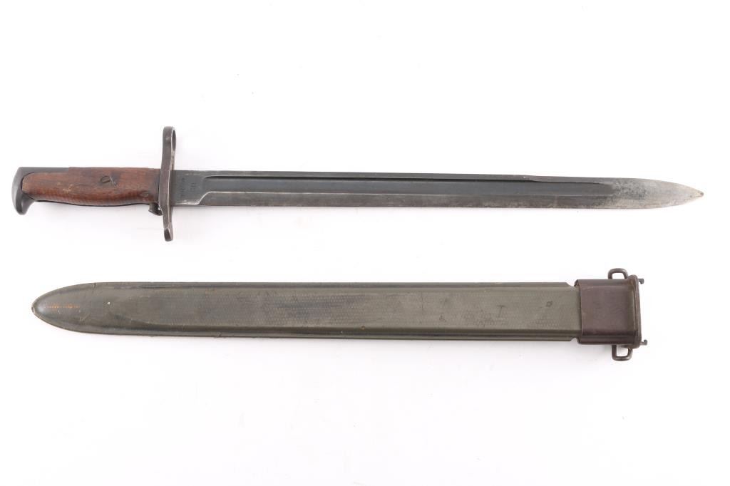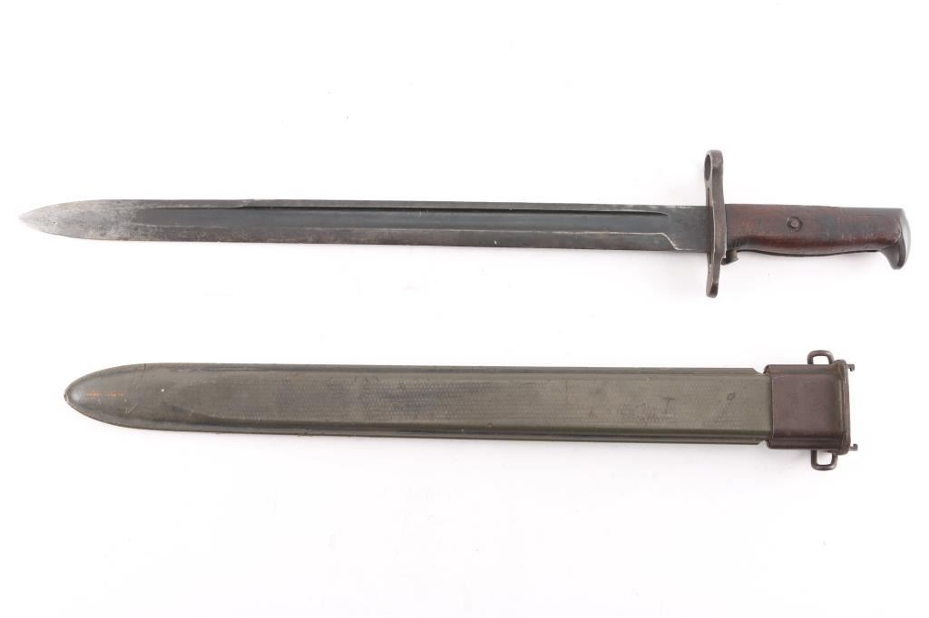 Early Springfield Armory. 16" blade. Wood grips. Ricasso marked "U.S." "409766". Reverse marked "S.A." with flaming bomb and "1909". Comes in M3fiberglass scabbard marked "U.S. inside flaming ordnance bomb" on throat. Overall very good condition with a couple of very minor nicks on the blade, the scabbard is sound, has minor scuffs to the left rib.