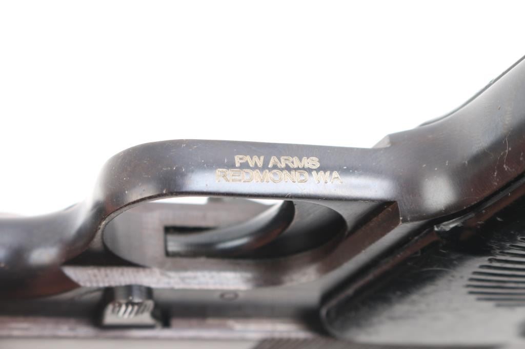 'Brigadier' single action semi-automatic pistol. Imported by PW Arms, Redmond WA. Features a blued finish, 4.6" barrel, fixed front sight, dovetailed rear sight, smooth trigger, push button safety, serrated round hammer spur, push button magazine release low on grip, 8 round magazine with pinky rest extension, lanyard loop and two-piece grooved black plastic wrap-around grips. Bore is very good condition. Retains 85% finish with scratches and edge losses. Grips are good or better condition with scratches. Includes one magazine. Slide stop and hammer are sticky or slow moving due to dried grease, needs cleaning.