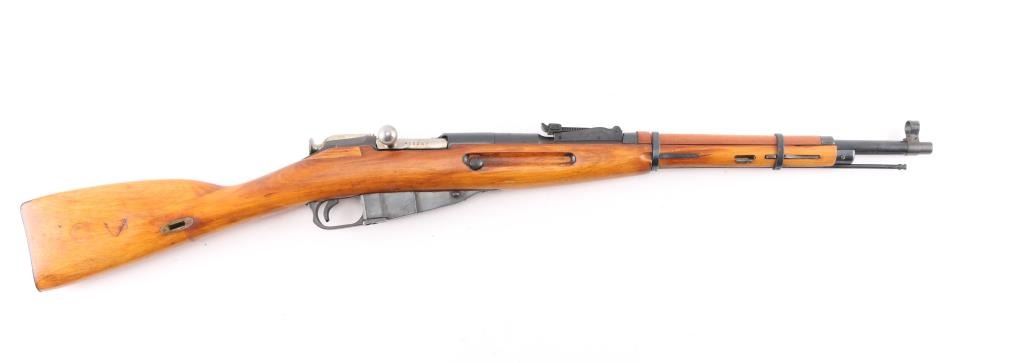 Reconditioned WW2 Russian military bolt action service rifle chambered in 7.62x54R, circa 1938. Features a blued finish, Izhevsk marked 20.25" barrel, hooded post front sight, graduated rear sight to 1,000 meters, cleaning rod, two barrel bands, 5 round fixed magazine, straight bolt handle, smooth wood handguard and straight grip shoulder stock with metal buttplate. Matching serial numbers on barrel, receiver, floorplate, steel butt plate, & bolt. Import marks on barrel. Rifle retains approximately 98% of it's blued finish showing few losses. Action performs well, bore is very good/bright, and wood stocks are very good.