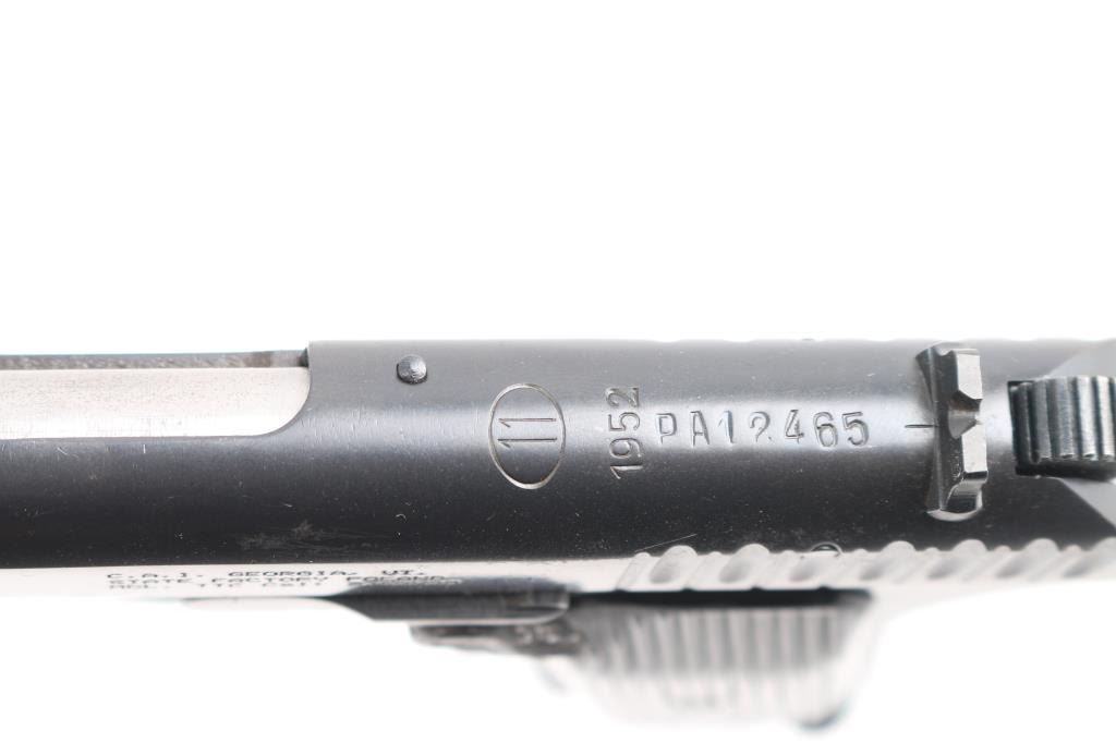 'wz.33' Polish Tokarev copy military pistol imported by CAI, Georgia VT. Features dark blued finish, approx 4.5" barrel, fixed sights, detachable magazine, manual safety on left side of frame, push button magazine release, lanyard loop, black plastic ribbed grips. Bore is very good condition. Retains 95% arsenal re-finish with handling marks. Grips are very good condition. Original markings include 1952 date, "Circle 11". Includes one mismatched magazine.