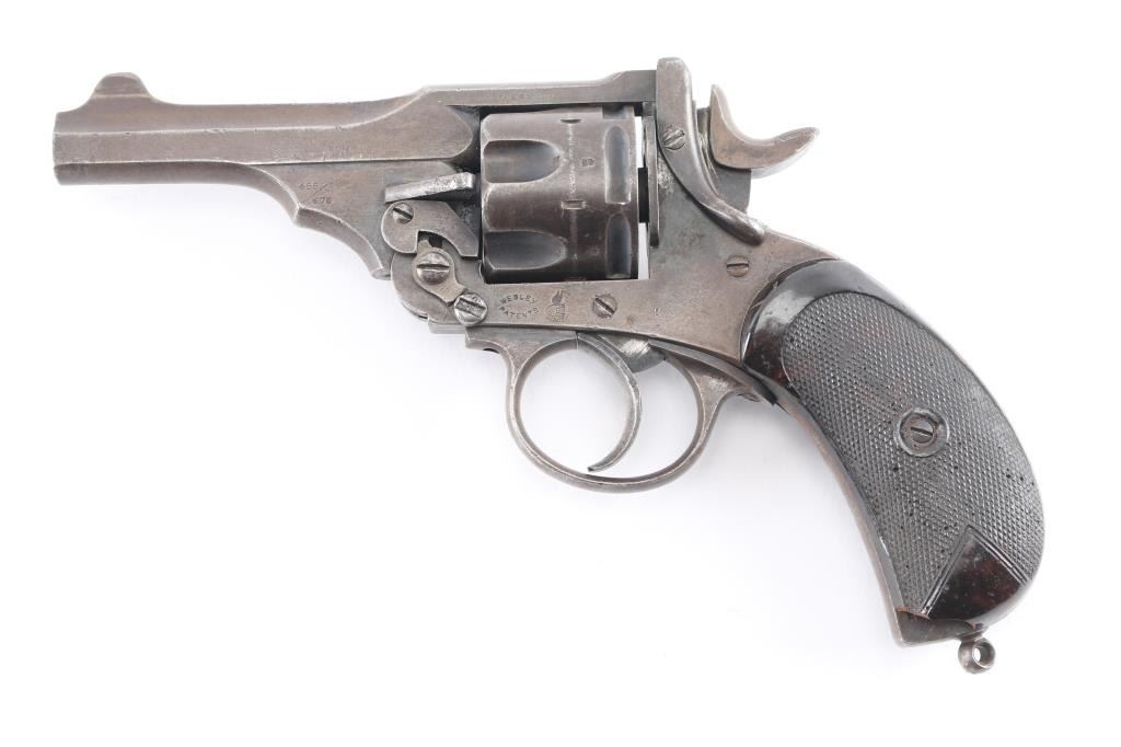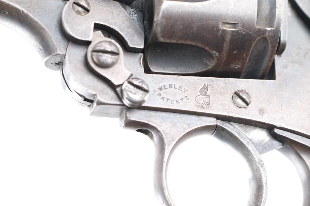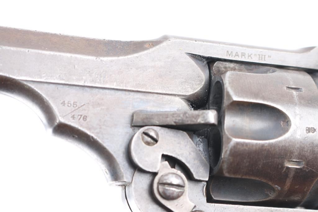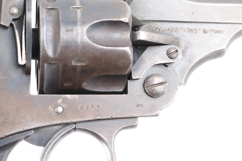 Cylinder has been shaved to fit 45 ACP in clips, or 45 Auto Rim ammunition, both of which are generally considered to be a bit hot for this model revolver. British top-break double action revolver. Features a blued finish, 4" barrel, forged round blade front sight, notched rear sight on the barrel catch, fluted six-shot cylinder, automatic extractor, smooth trigger, knurled hammer spur, lanyard stud (ring missing) on the bird's head shaped butt, two-piece checkered brown hard rubber grips. Serial numbers match on the barrel & frame, none observed on the cylinder. British proof marks are observed on the barrel and over every charge hole on the cylinder. Other markings include "455/476" on left side below barrel, "WEBLEY/PATENTS" on the frame, "MARK III" on top strap, "W&S" flying bullet logo on left side. Bore is good condition, mostly bright with strong rifling, showing dark streaks and some light pitting. The revolver retains approximately 10% of it's original finish, most finish has faded to a dull brown color, some darker grays in protected areas. Many small dings, especially on sharp edges. Screw slots typically show some marring. Grips are good condition, large chip missing from left panel at point, many small holes on both sides, smoothing of the checker points throughout. Action is smooth with fair lock-up, cylinder is fairly easy to turn by hand with trigger at reset. Extractor operation is good if opened quickly.