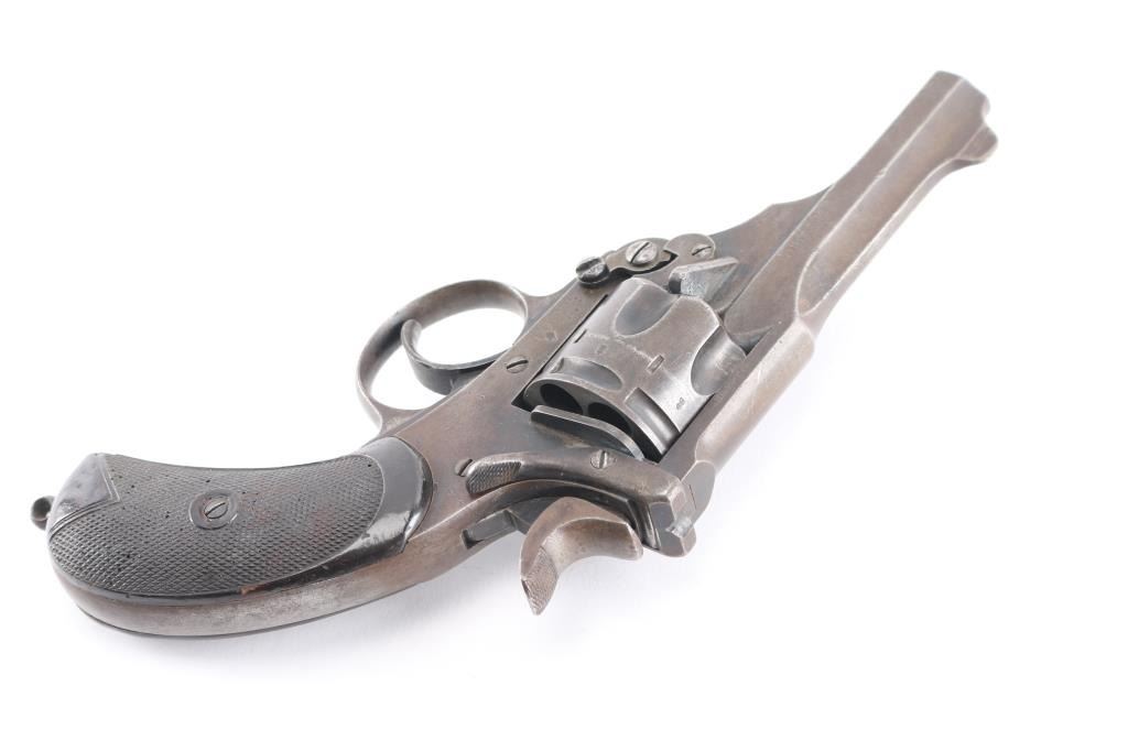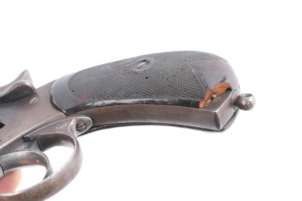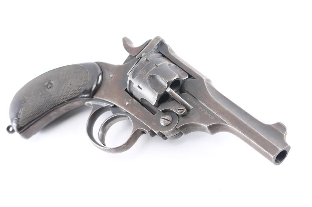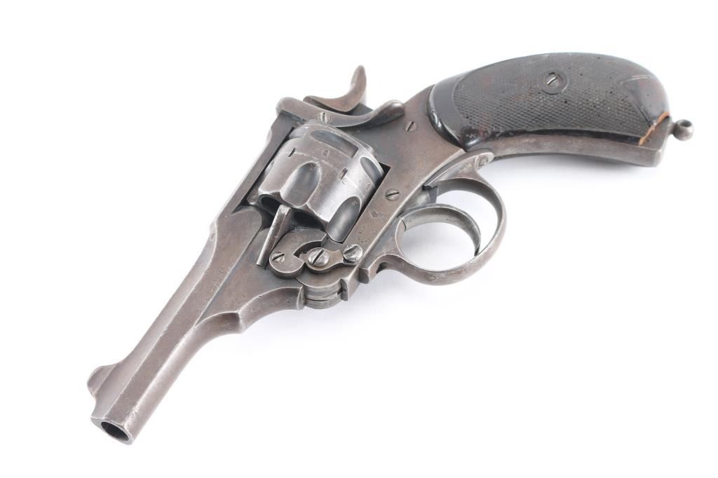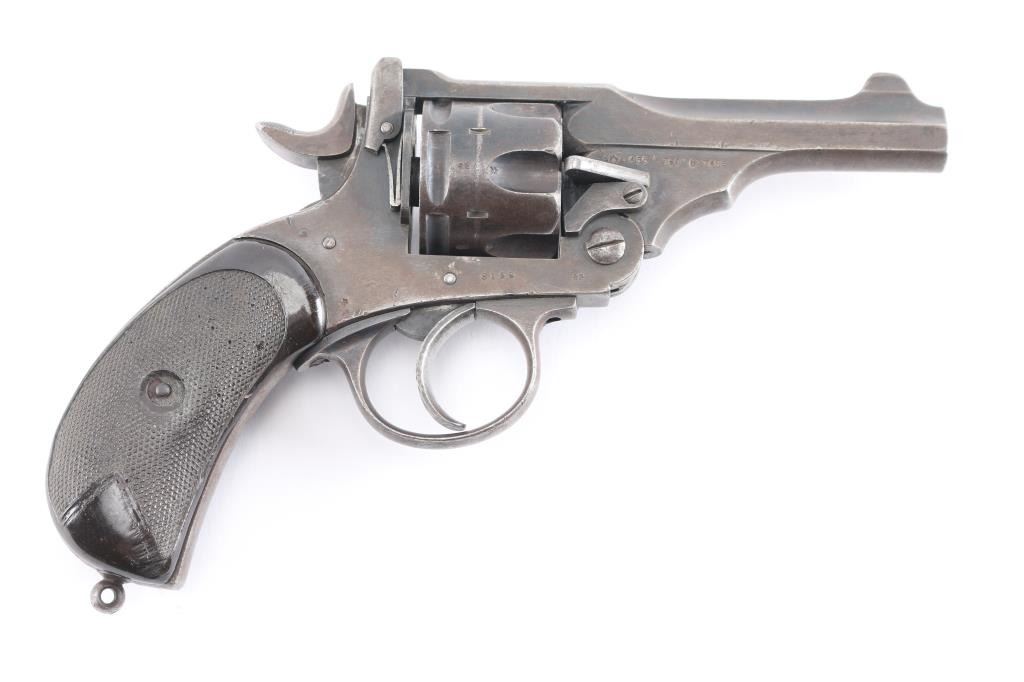 Cylinder has been shaved to fit 45 ACP in clips, or 45 Auto Rim ammunition, both of which are generally considered to be a bit hot for this model revolver. British top-break double action revolver. Features a blued finish, 4" barrel, forged round blade front sight, notched rear sight on the barrel catch, fluted six-shot cylinder, automatic extractor, smooth trigger, knurled hammer spur, lanyard stud (ring missing) on the bird's head shaped butt, two-piece checkered brown hard rubber grips. Serial numbers match on the barrel & frame, none observed on the cylinder. British proof marks are observed on the barrel and over every charge hole on the cylinder. Other markings include "455/476" on left side below barrel, "WEBLEY/PATENTS" on the frame, "MARK III" on top strap, "W&S" flying bullet logo on left side. Bore is good condition, mostly bright with strong rifling, showing dark streaks and some light pitting. The revolver retains approximately 10% of it's original finish, most finish has faded to a dull brown color, some darker grays in protected areas. Many small dings, especially on sharp edges. Screw slots typically show some marring. Grips are good condition, large chip missing from left panel at point, many small holes on both sides, smoothing of the checker points throughout. Action is smooth with fair lock-up, cylinder is fairly easy to turn by hand with trigger at reset. Extractor operation is good if opened quickly.