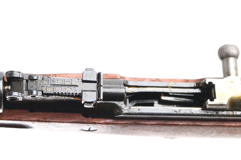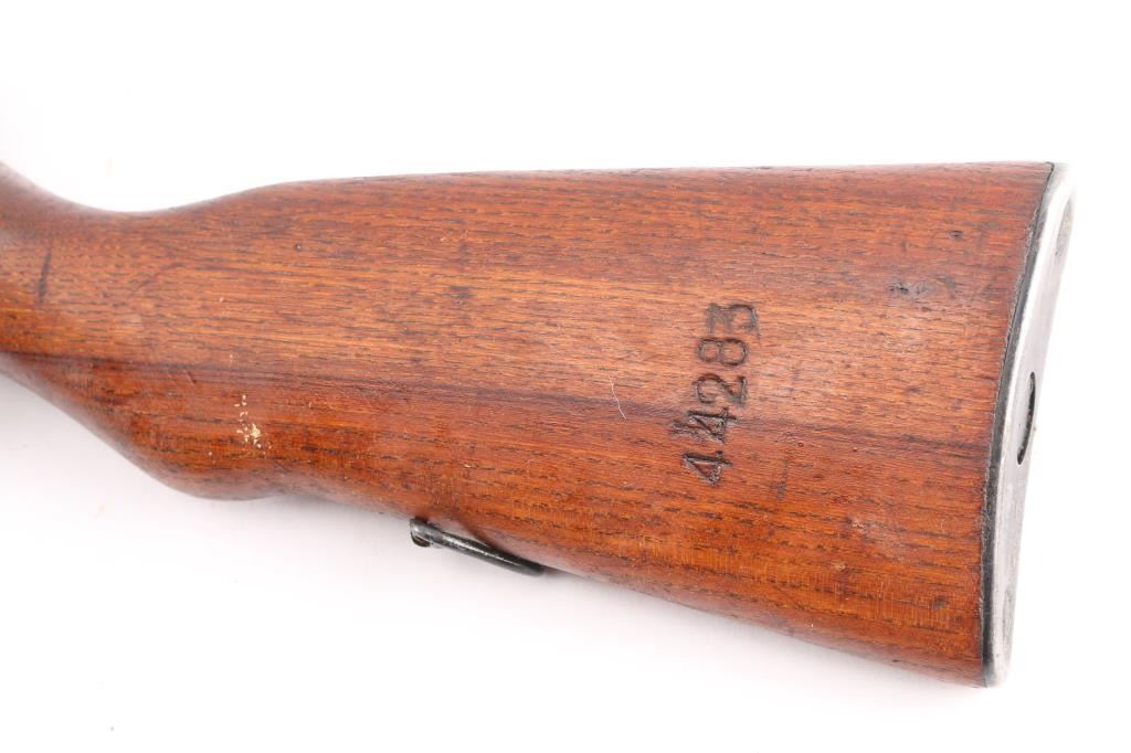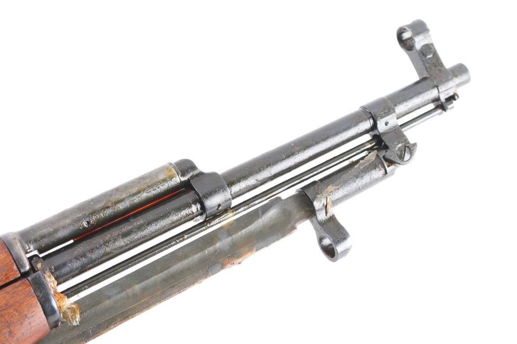 Zastava M59 PAP, also known as Papovka, is a Yugoslav licensed version of Soviet SKS semi-automatic rifle.'Mdl 59' Yugoslavian made gas-operated semi automatic rifle chambered in 7.62x39mm. Imported by CAI, right barrel. Features a blued finish, 20.5" barrel, hooded post front sight, tangent rear sight graduated to1,000 meters, cleaning rod, folding blade bayonet, manual safety, smooth trigger, fixed 10 round magazine, smooth wood handguard, pistol grip shoulder stock and trapdoor metal buttplate. Matching serial numbers on the receiver, bolt carrier, and stock, mismatched magazine. Rifle is coated with cosmoline from storage. Rifle retains approximately 98% of it's blued finish, bore appears good with strong rifling, has dried cosmoline, needs cleaning and wood stocks are good+ with several dings & gouges. Serial numbers puts it at pre 1967,