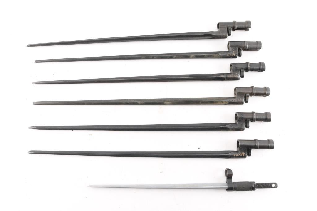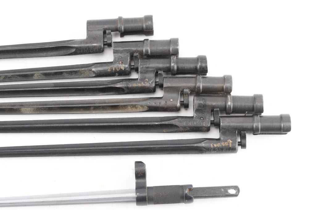 Lot of six 91/30 Mosin-Nagant bayonets. 17" cruciform blades. All have serial numbers, very good condition. Also included is a Chinese SKS cruciform bayonet.