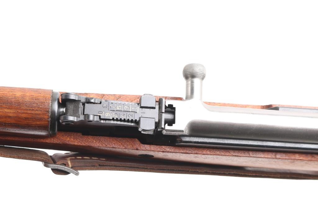 Zastava M59 PAP, also known as Papovka, is a Yugoslav licensed version of Soviet SKS semi-automatic rifle.'Mdl 59' Yugoslavian made gas-operated semi automatic rifle chambered in 7.62x39mm. No import marks observed. Features a blued finish, 20.5" barrel, hooded post front sight, tangent rear sight graduated to1,000 meters, cleaning rod, folding blade bayonet, manual safety, smooth trigger, fixed 10 round magazine, smooth wood handguard, pistol grip shoulder stock and trapdoor metal buttplate. Matching serial numbers on the receiver, bolt carrier, and stock. Rifle retains approximately 98% of it's blued finish, with some minor edge wear, bore is pristine and wood stocks are near excellent.. Serial numbers puts it at pre 1967. Leather sling attached.
