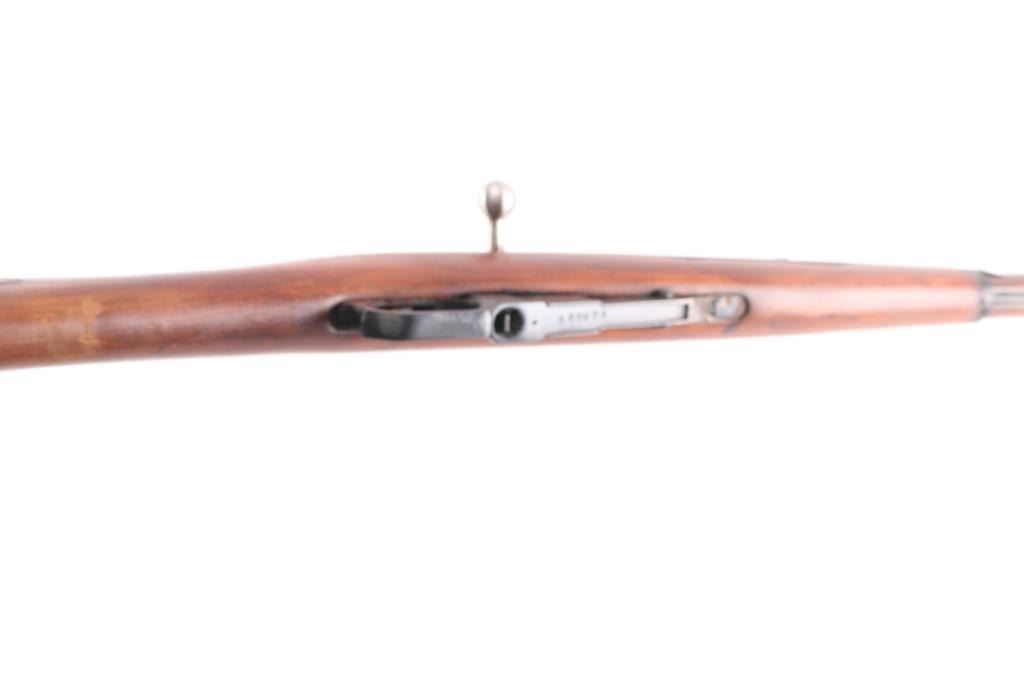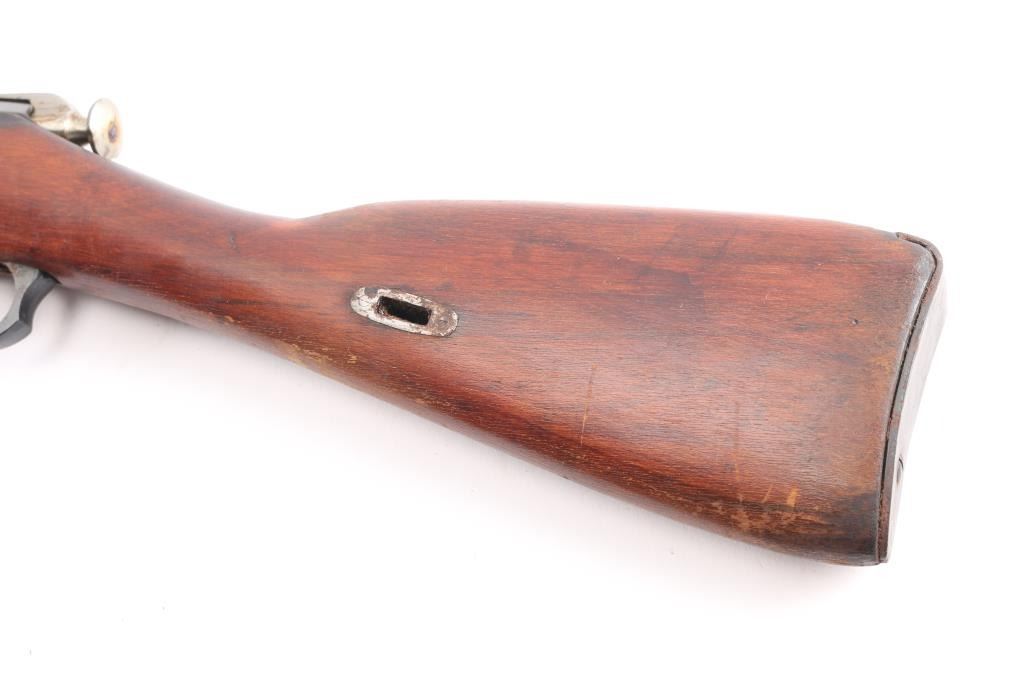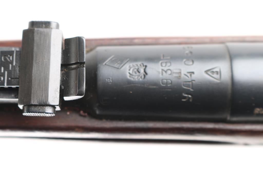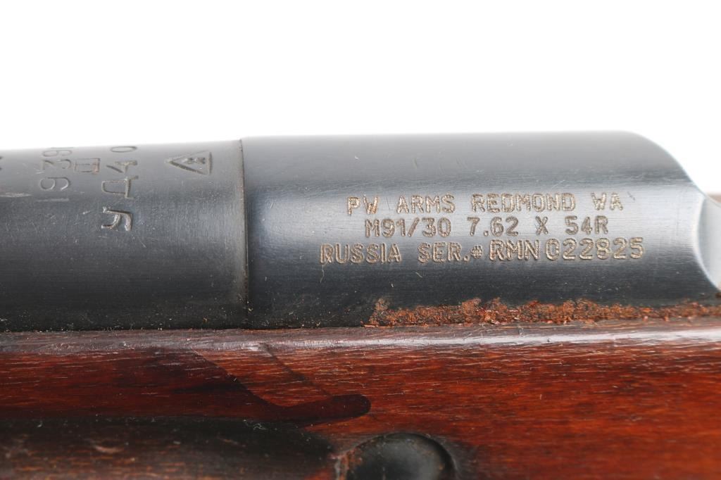 SN:RMN022825. Russian WW2 military bolt action rifle manufactured circa 1939, imported by PW Arms, Redmond WA. 4th Pattern Izhevsk wheat, hammer, & sickle barrel shank markings. Arsenal re-finish. Features 29" barrel, post front sight inside protective ring, tangent style rear sight, straight bolt handle, sling slots, cleaning rod under barrel. Bore is rough, some frosting in the grooves, strong rifling, should improve with cleaning. Retains 90% dark blued arsenal refinish with surface rust on the left receiver where it meets the wood. Bolt has areas of surface rust, and dried cosmoline on it.. Wood is good/sound, some small areas of finish loss. Importer serial number applied to receiver. Original Matching Cyrillic serial number is found on the bolt, barrel, floorplate, & steel butt plate. Comes with mismatched bayonet.