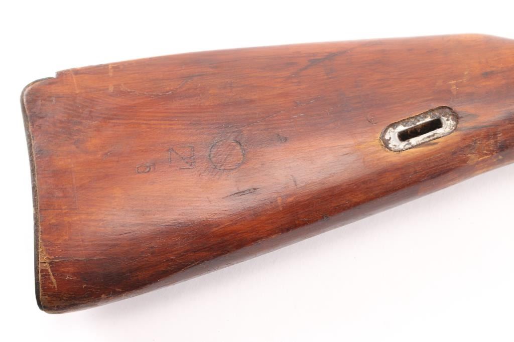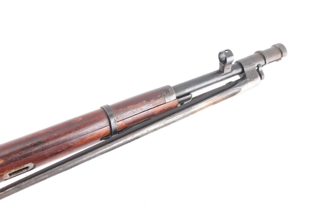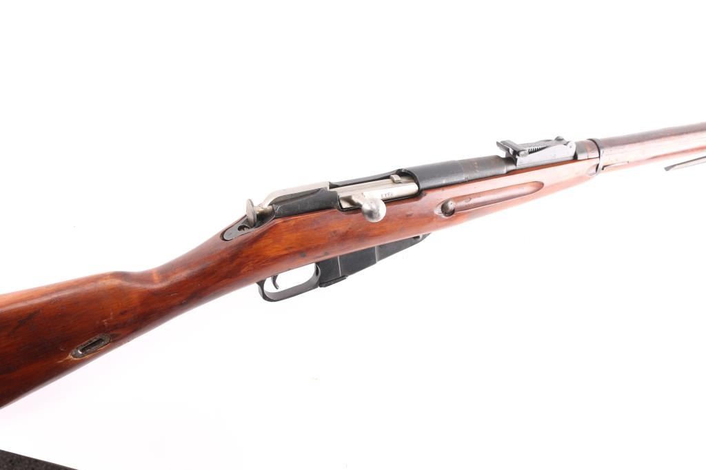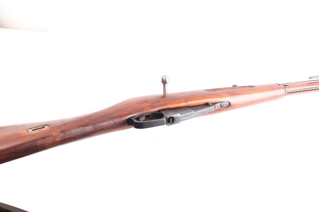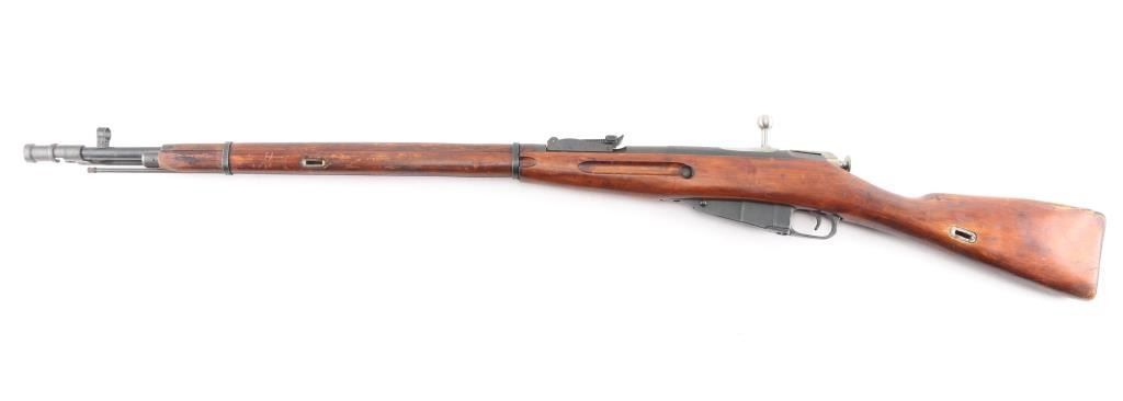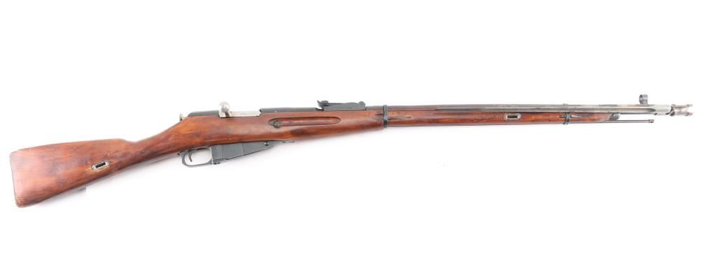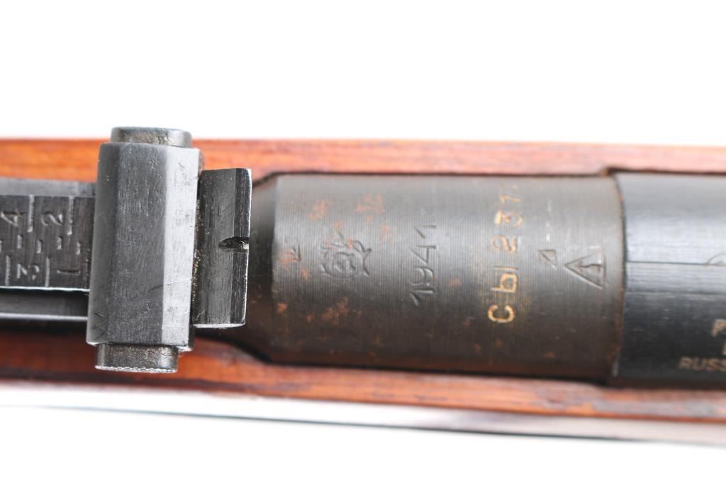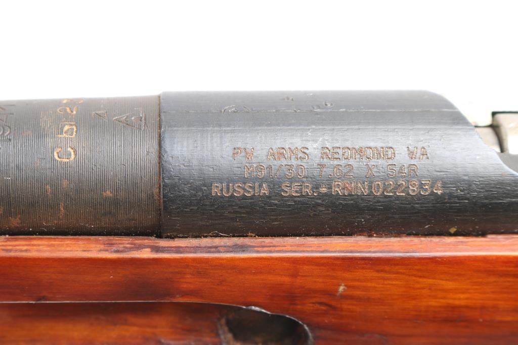 SN:RMN022834. Russian WW2 military bolt action rifle manufactured circa 1941, imported by PW Arms, Redmond WA. 4th Pattern Izhevsk wheat, hammer, & sickle barrel shank markings. Arsenal re-finish. Features 29" barrel, post front sight inside protective ring, tangent style rear sight, straight bolt handle, sling slots, cleaning rod under barrel. Bore is good, frosting in the grooves, strong rifling. Retains 92% dark blued arsenal refinish with minor scratches, some loss on the barrel from the bayonet. Bolt has some dried cosmoline on it. Wood is good/sound. Importer serial number applied to receiver. Original Matching Cyrillic serial number is found on the bolt, barrel, floorplate, & steel butt plate. Comes with mismatched bayonet, has some finish loss.
