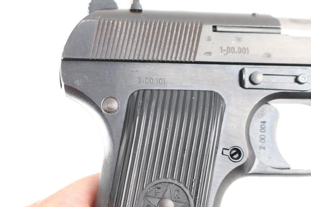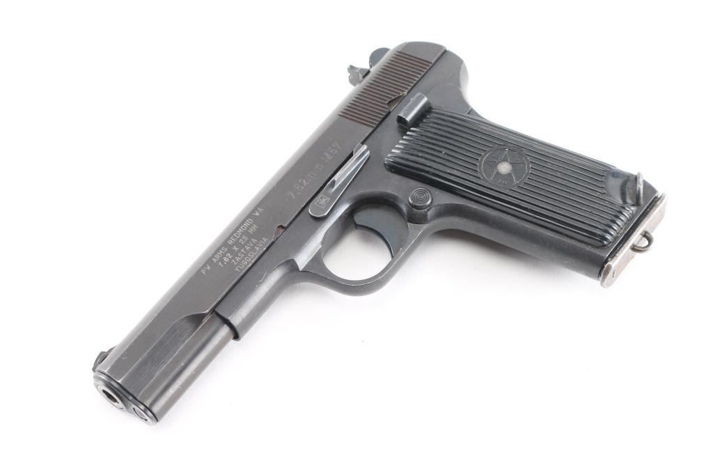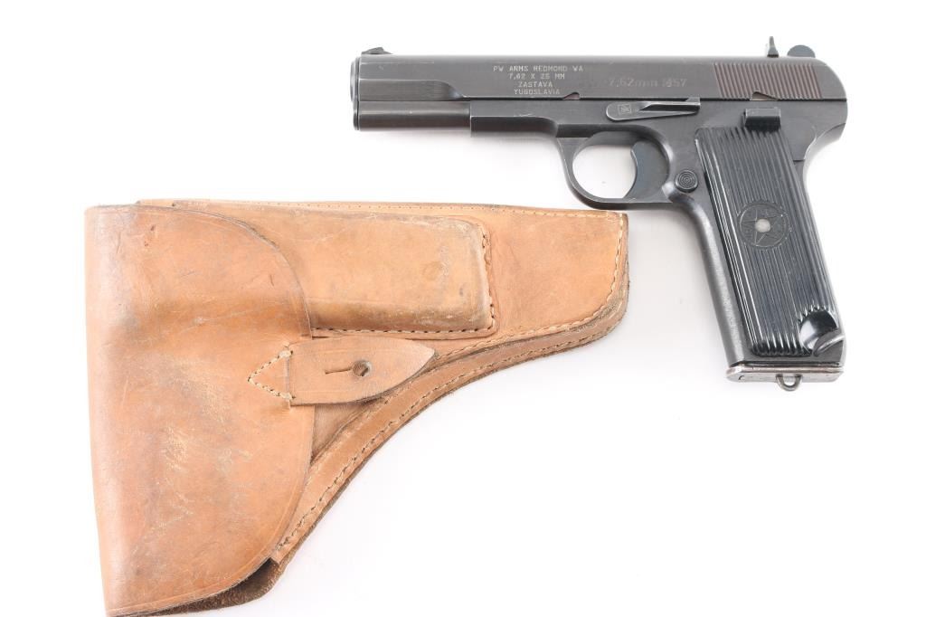 Yugoslavian military pistol imported by PW Arms, Redmond WA. Tokarev type pistol with slightly longer frame, takes a longer magazine that standard TT-33's. Features approx 4.5" barrel, fixed sights, detachable magazine, magazine safety, frame mounted manual safety, grooved plastic grips with "SFRJ" star, lanyard loop, single action trigger. Bore is very good condition. Finish is blued with 95% coverage, some scratches and scuffs, some rust in safety notch on slide. Appears to be factory reblue, with some blemishes under the re-finish. Black plastic grips in very good condition. Observed numbers match. Yugoslavian crest on top of slide. Includes one fair/good condition magazine with lanyard loop base, fair condition tan flap holster.