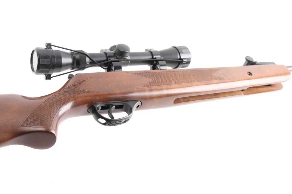 Break-action single shot air rifle chambered in .177 cal. Features an 18” barrel, polymer front sight with red insert and adjustable rear sight with green insert, polymer trigger and trigger guard, checkered wood stock with rubber butt pad. Tang safety. Bore is very good and bright, blued finish with some scratches on the barrel. Stock has some scratches and dents. Comes with a mounted Winchester 3 X 9 scope & manual. Scope is clear.