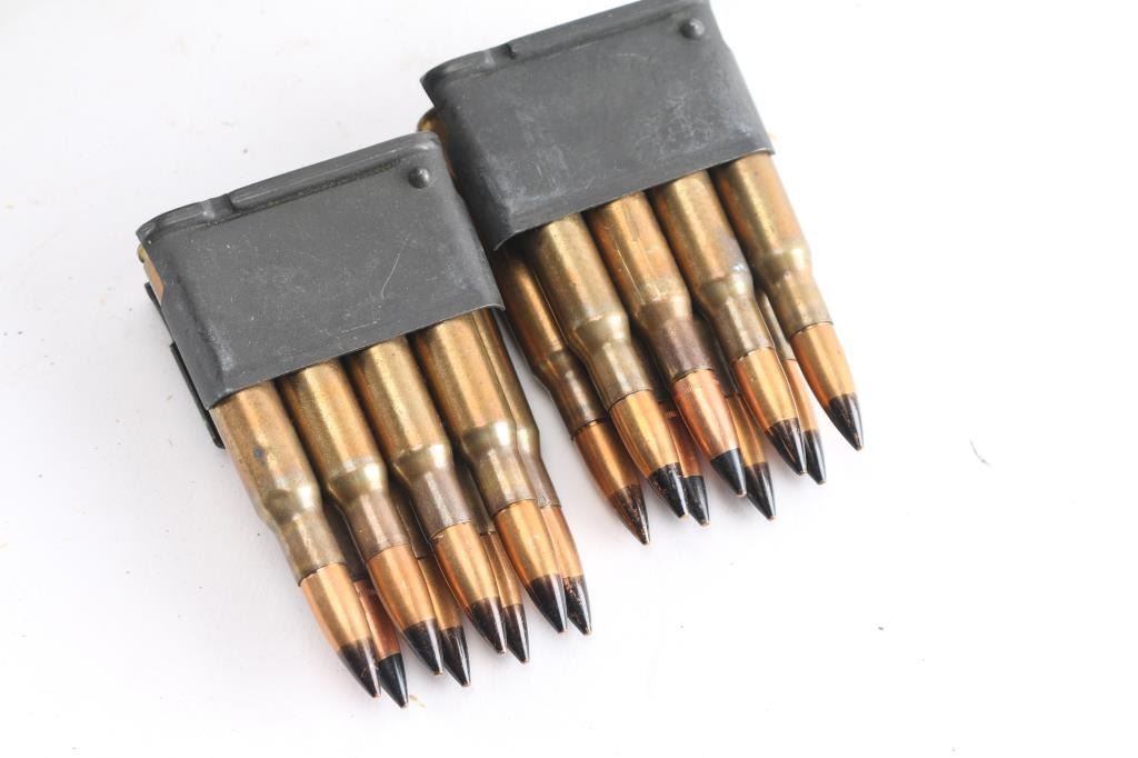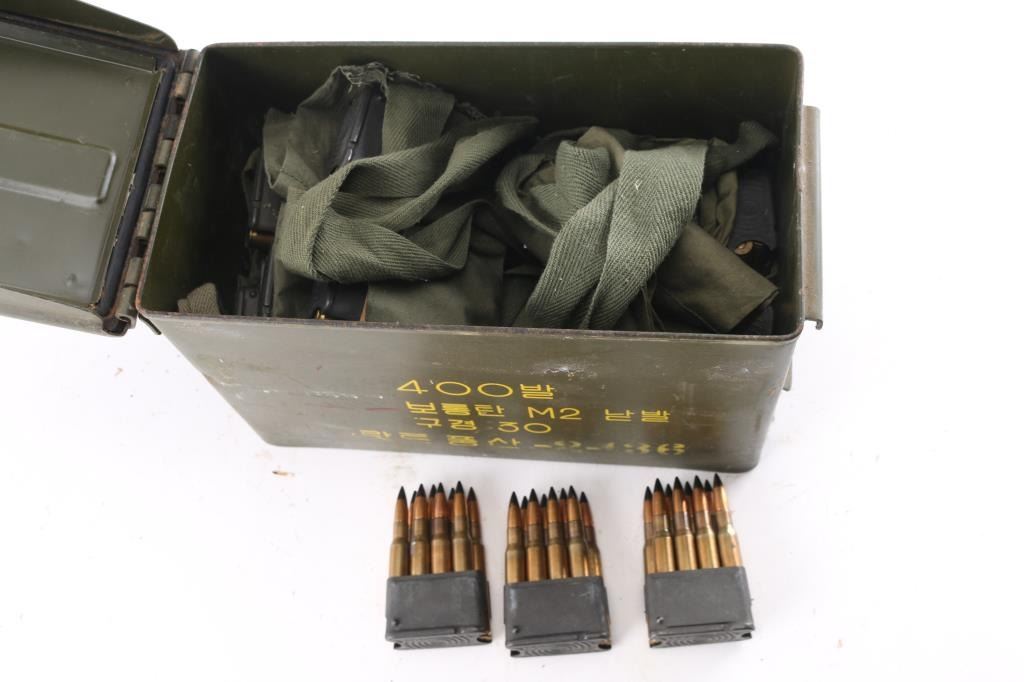 Approx. 216 rounds of .30-06 factory new ammunition, separated into 4 green bandoliers on 8 rd M1 Garand clips, w/ 3 loose clips. All in metal ammo can.