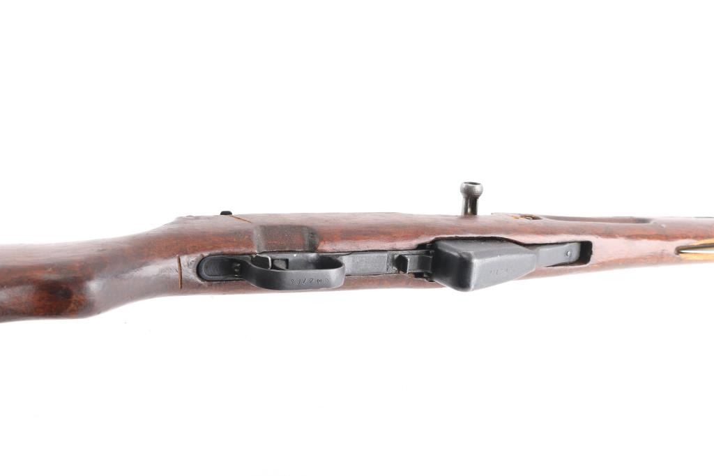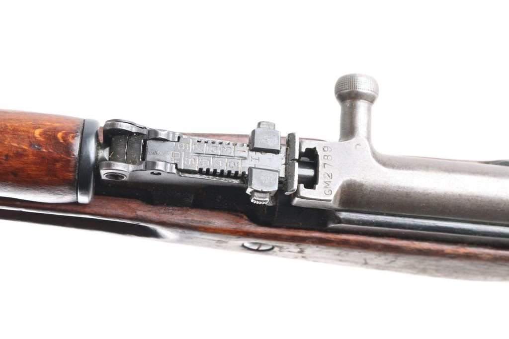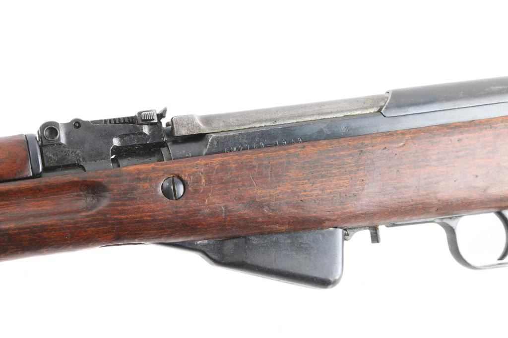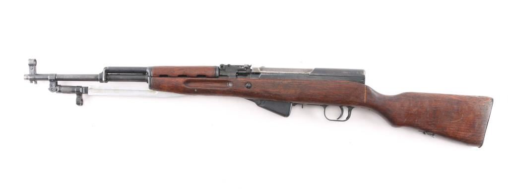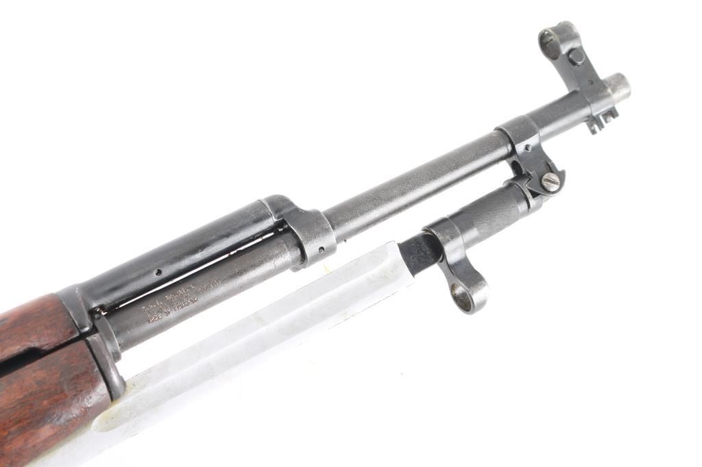 SN: Gm2789-1959. 'M56' Romanian made gas-operated semi automatic rifle chambered in 7.62x39mm. Cugir factory mark on left receiver. Dated 1959. Features a blued finish, 20.4" barrel, hooded front sight, adjustable tangent rear sight, cleaning rod, folding blade bayonet, safety selector, fixed 10 round magazine, smooth wood handguard and pistol grip shoulder stock with trapdoor metal buttplate. Matching serial numbers on receiver, bolt carrier, triggerguard, and magazine. Import marks on barrel. Rifle retains approximately 80% of it's blued finish showing edge wear, handling loss. Action is smooth, bore is overall good, but has a area of pitting about midway, and wood stock is good with several blemishes.