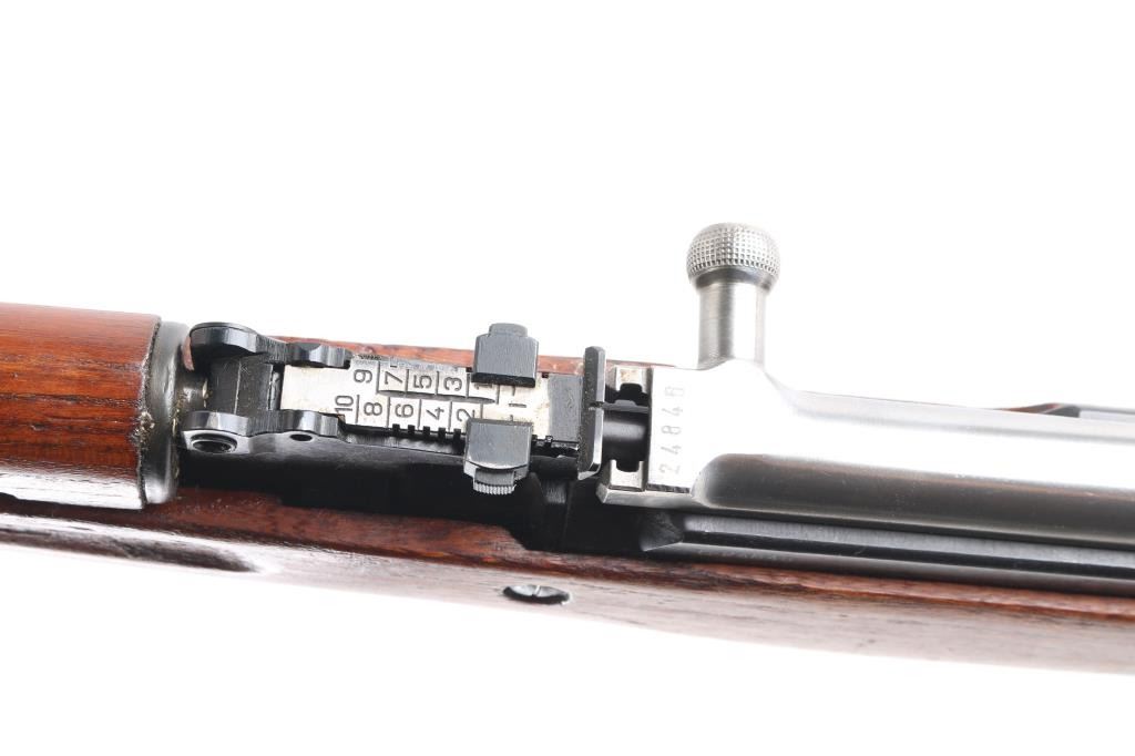Zastava M59 PAP, also known as Papovka, is a Yugoslav licensed version of Soviet SKS semi-automatic rifle.'Mdl 59' Yugoslavian made gas-operated semi automatic rifle chambered in 7.62x39mm. Imported by CAI, right barrel. Features a blued finish, 20.5" barrel, hooded post front sight, tangent rear sight graduated to1,000 meters, cleaning rod, folding blade bayonet, manual safety, smooth trigger, fixed 10 round magazine, smooth wood handguard, pistol grip shoulder stock and trapdoor metal buttplate. Matching serial numbers on the receiver, bolt carrier, magazine,triggerguard, and stock. Rifle retains approximately 96% of it's blued finish, with some minor edge wear, bore appears excellent/bright, and wood stocks are very good. Serial numbers puts it at pre 1967,