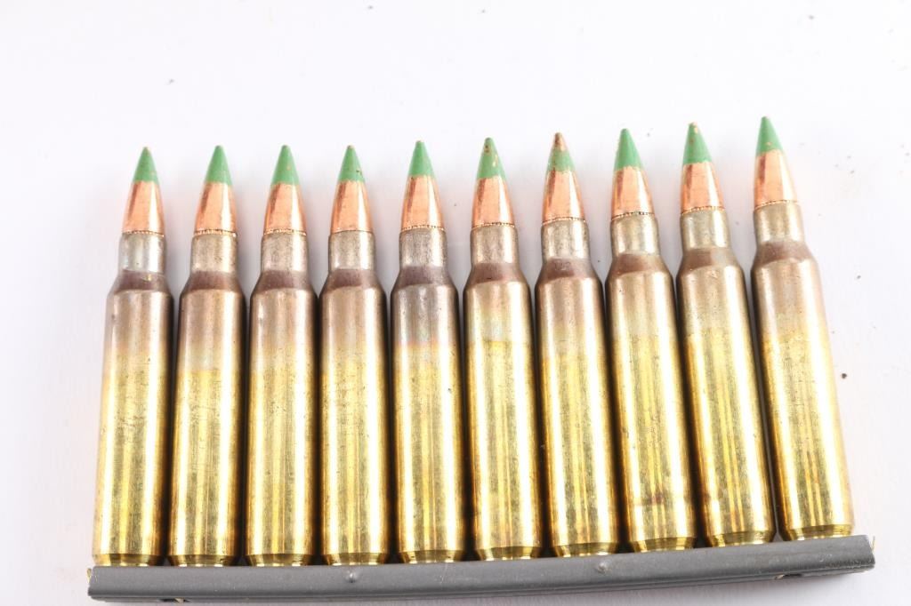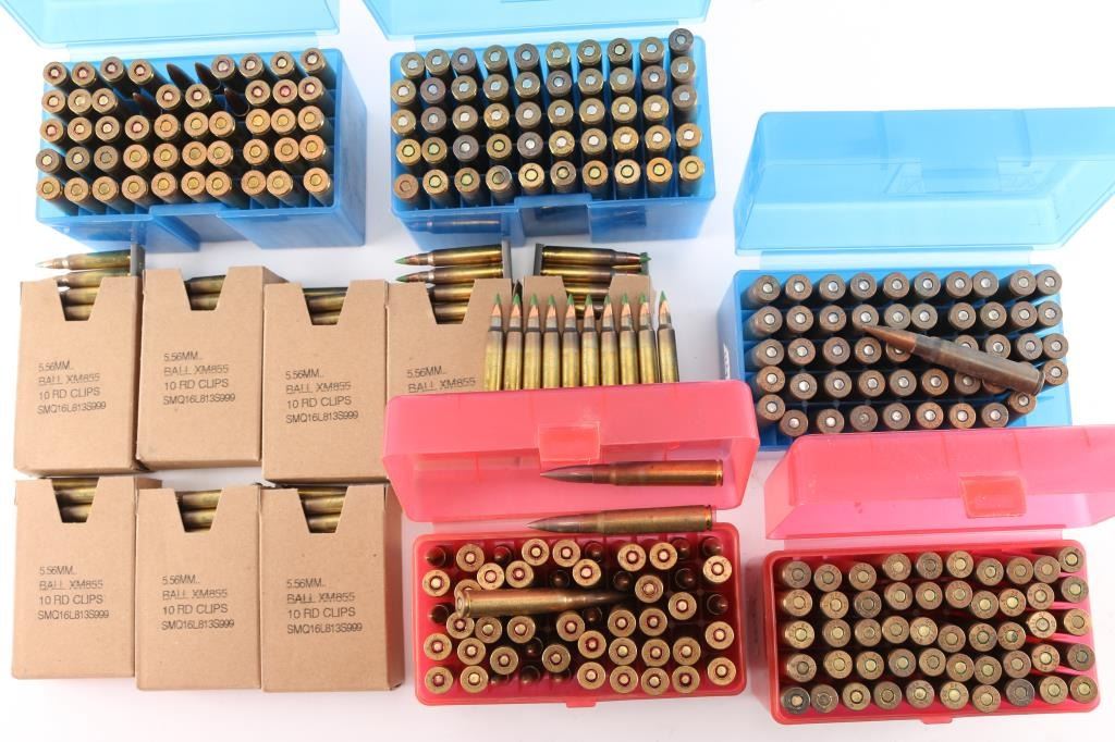 Approx. 490 rounds total. Approx. 250 of reloaded 8mm Mauser ammunition. Various weights and bullets. All in plastic cases of 50. & approx. 240 rounds of 5.56 X 45mm factory new ammunition. Federal, 62 Gr. FMJ XM855LC1, 10 rd stripper clips, 3 clips per box, 8 boxes in 1 metal ammo can.