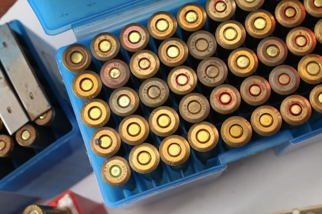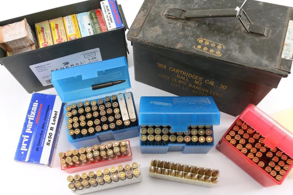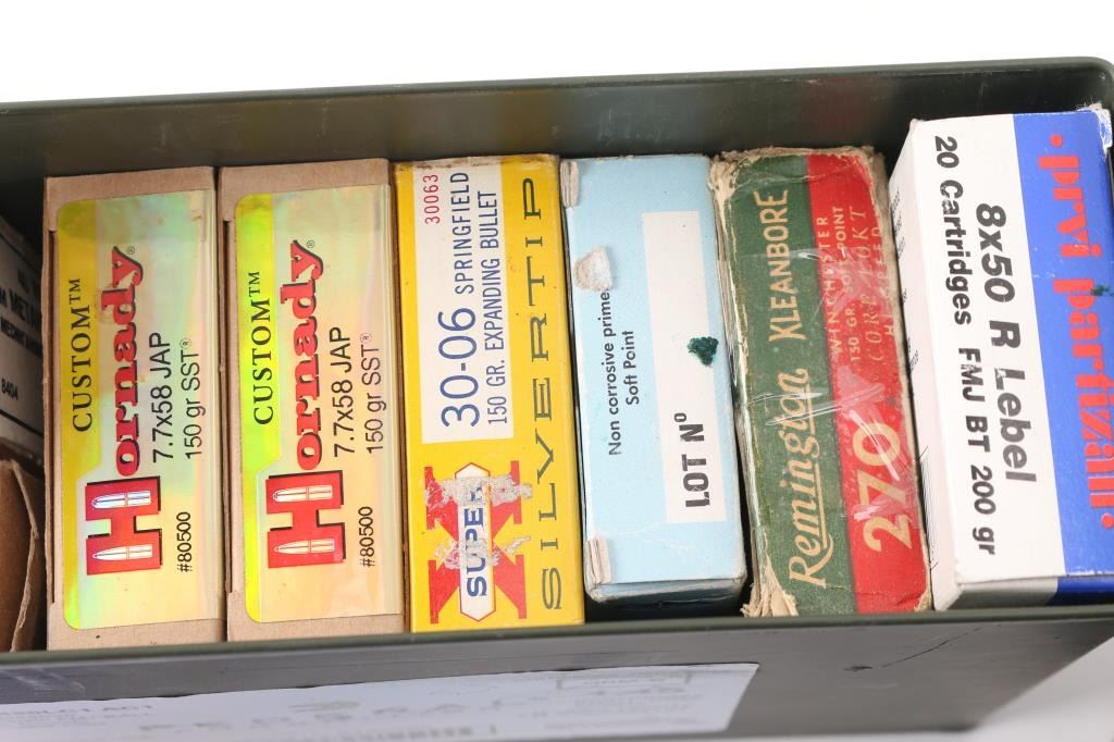 Approx. 450 rounds total of factory new ammunition. Yugo military surplus 100 rds 7.62 X 39mm M67, Hornady 40 rds 7.7 X 58mm JAP, PPU 40 rds 8 X 50R, Western 20 rds 30-06, FNM 20 rds 6.5 Carcano & Remington 20 rds 270 Win, In factory boxes & Misc. reloads, in plastic cases, all in 2 metal ammo cans.