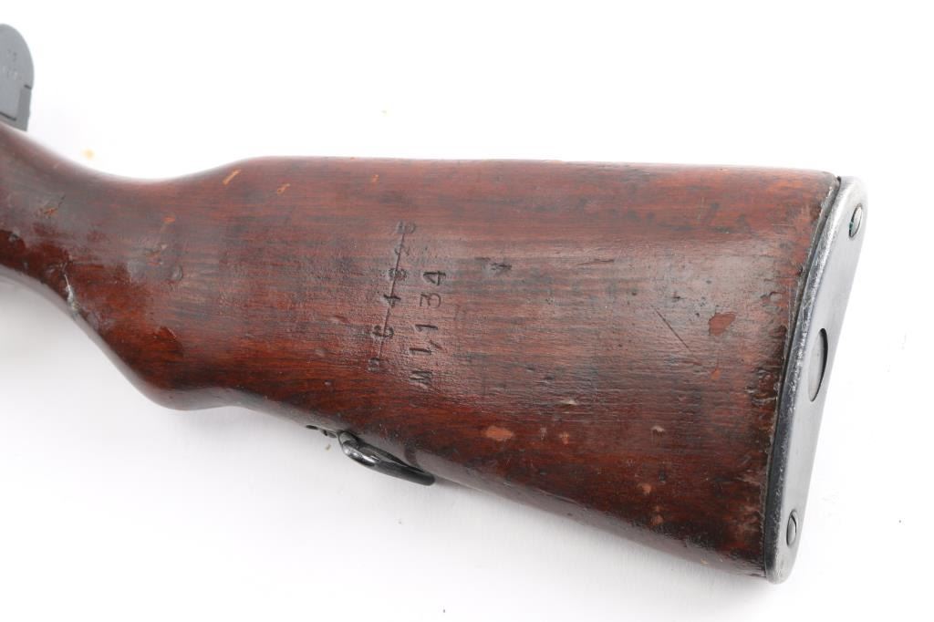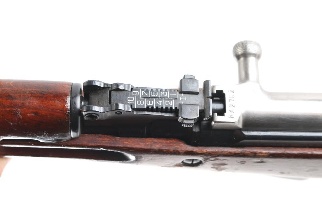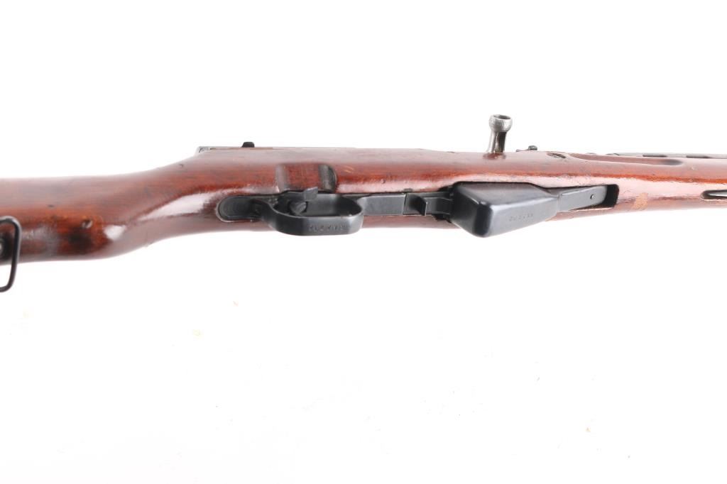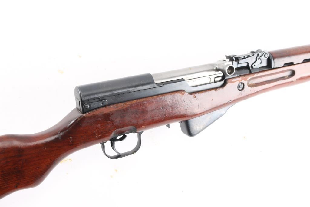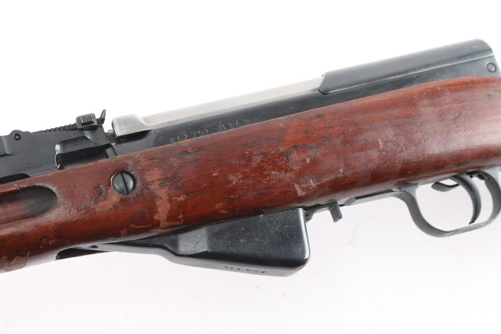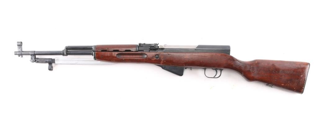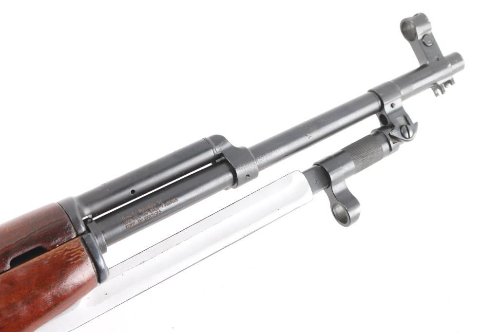 SN: RA2702-1960. 'M56' Romanian made gas-operated semi automatic rifle chambered in 7.62x39mm. Cugir factory mark on left receiver. Dated 1960. Features a blued finish, 20.4" barrel, hooded front sight, adjustable tangent rear sight, cleaning rod missing, folding blade bayonet, safety selector, fixed 10 round magazine, smooth wood handguard and pistol grip shoulder stock with trapdoor metal buttplate. Matching serial numbers on receiver, bolt carrier, triggerguard, and magazine. Has coat of cosmoline from storage. Import marks on barrel. Rifle retains approximately 96% of it's blued finish with slight handling wear, bore is excellent/bright, and wood stock is sound/good.