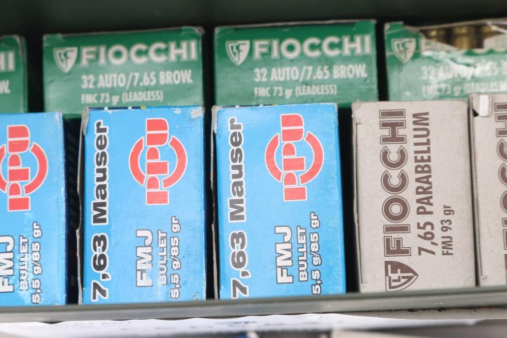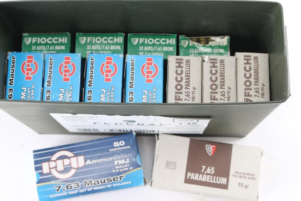 Approx. 650 rounds total. 250 rds of 7.63 Mauser, PPU 65 Gr. FMJ; 200 rds of 7.65 Parabellum, Fiocchi 93 Gr. FMJ & 200 rds of 32 ACP/7.65 Browning, Fiocchi 73 Gr. FMJ. All in factory boxes of 50. All in small metal ammo can.