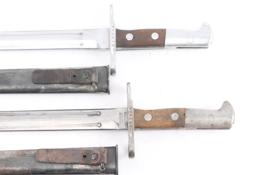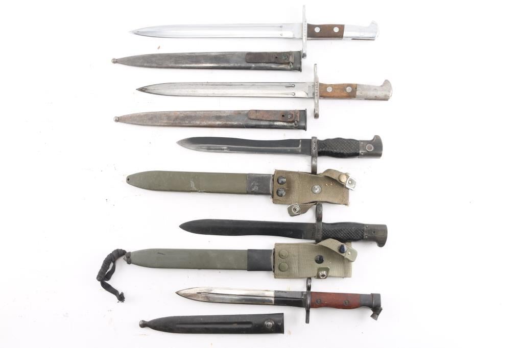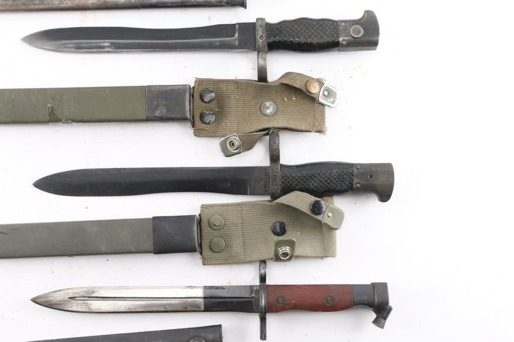 Five Total. Includes two Spanish CETME bayonets with scabbards, Two Swiss M1918 bayonets for the K31, M1911 rifles, with scabbards, Egyptian Hakim Bayonet with scabbard.