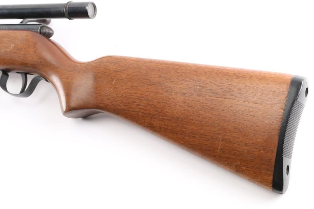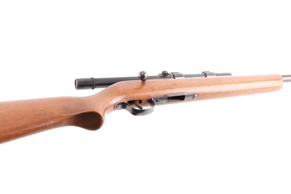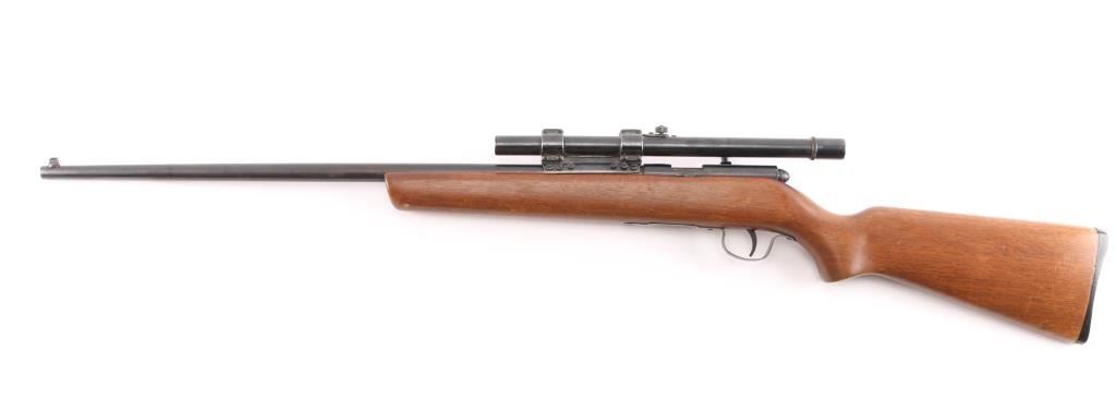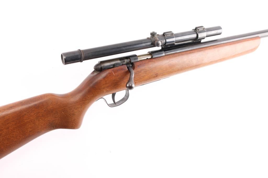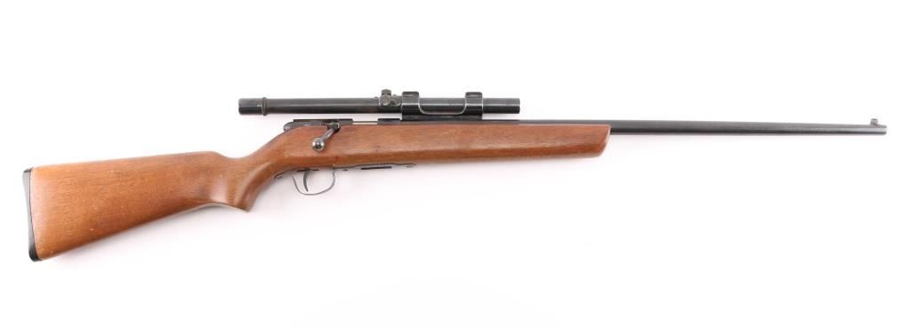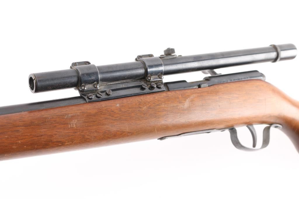Vintage bolt action magazine fed rimfire rifle. Appears to be the same as H&R Plainsman model 865, with no markings other than as indicated. Features 24" barrel, dovetailed blade front sight, rear sight removed from barrel, manual safety, mag release sticks up on left side of receiver, Weaver scope mount secured to left side of barrel with screws, Weaver G6 scope with fine cross hairs, smooth walnut stock, serrated plastic butt plate. No Magazine. Bore is very good. Metal retains 80% finish, with edge losses, some fading. Numbers scratched or electric pencil engraved on side of receiver and on bottom metal, probably a previous owner's identification. Scope is good condition, dust on lenses. Stock is very good with handling marks. No magazine provided.