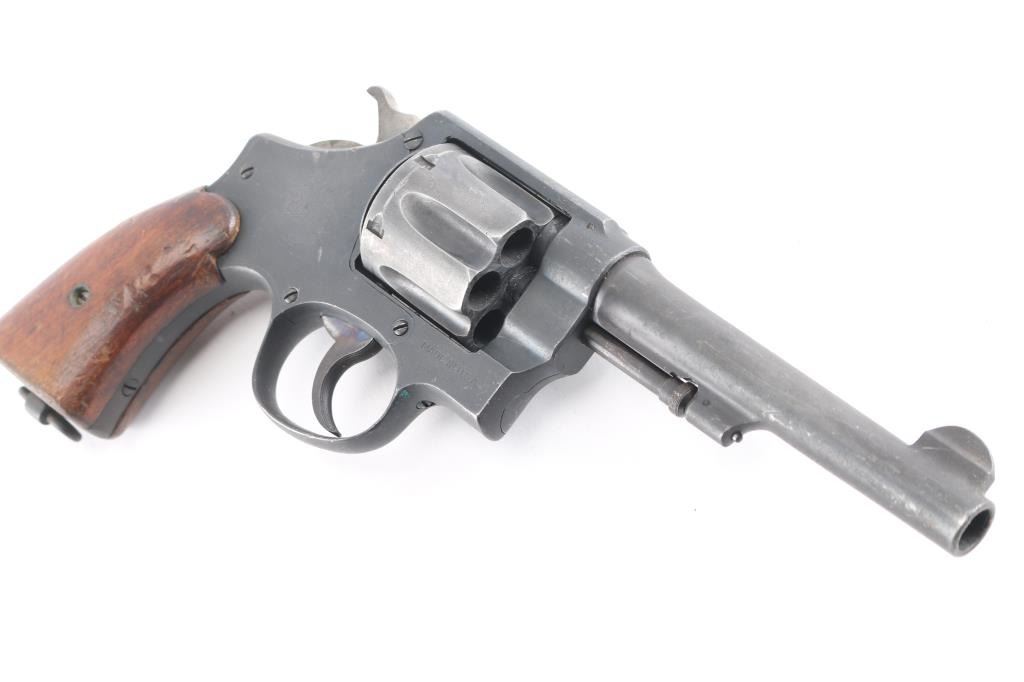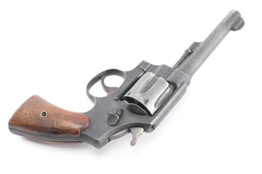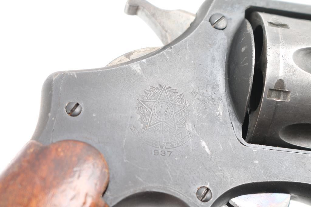 SN: 185213 Large frame double action revolver purchased by the Brazilian government for military use, produced circa 1937. No importer marks observed. Accepts moon or half moon slipped ammunition, or 45 Auto Rim. The extractor will not remove 45 ACP cases without the clips. Features matte blued finish, 5.5" barrel, fixed sights, six shot fluted cylinder, lanyard ring at butt, serrated thin trigger, knurled narrow spur hammer, smooth walnut grips. Barrel stamped "F.I." under caliber marking. Bore appears good or better, dark streaks appear to be residue that should clean out. Retains 90% coverage of medium gray finish, thinning in places such as cylinder, showing edge losses & scratches. Grips are good condition, with scrapes and scratches, finish loss. Action is smooth with good lock-up. Includes fair condition vintage leather full flap holster