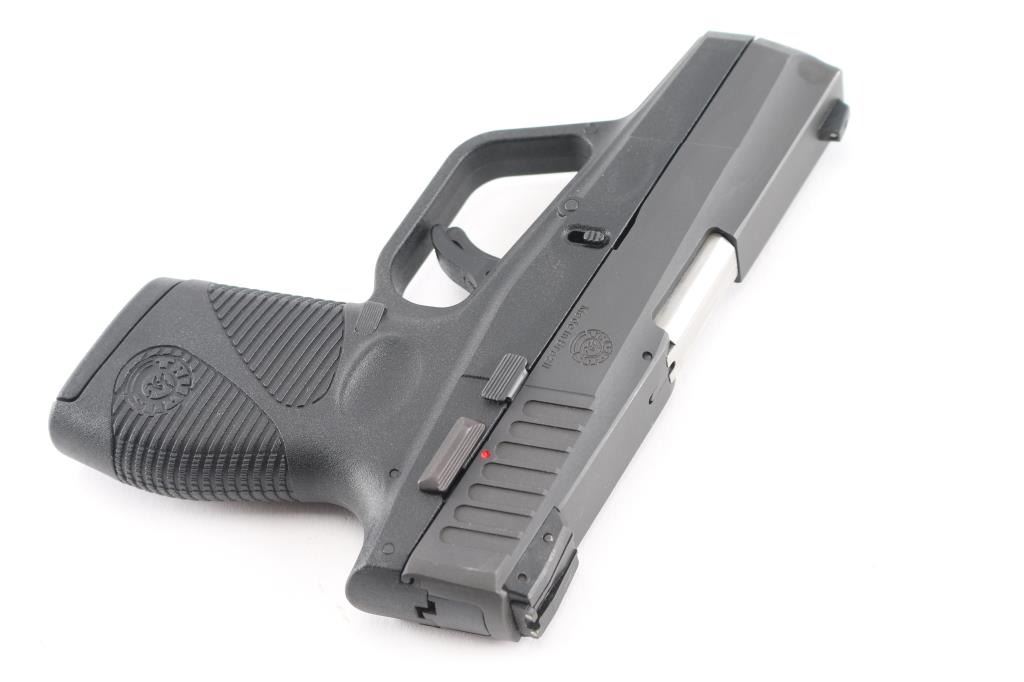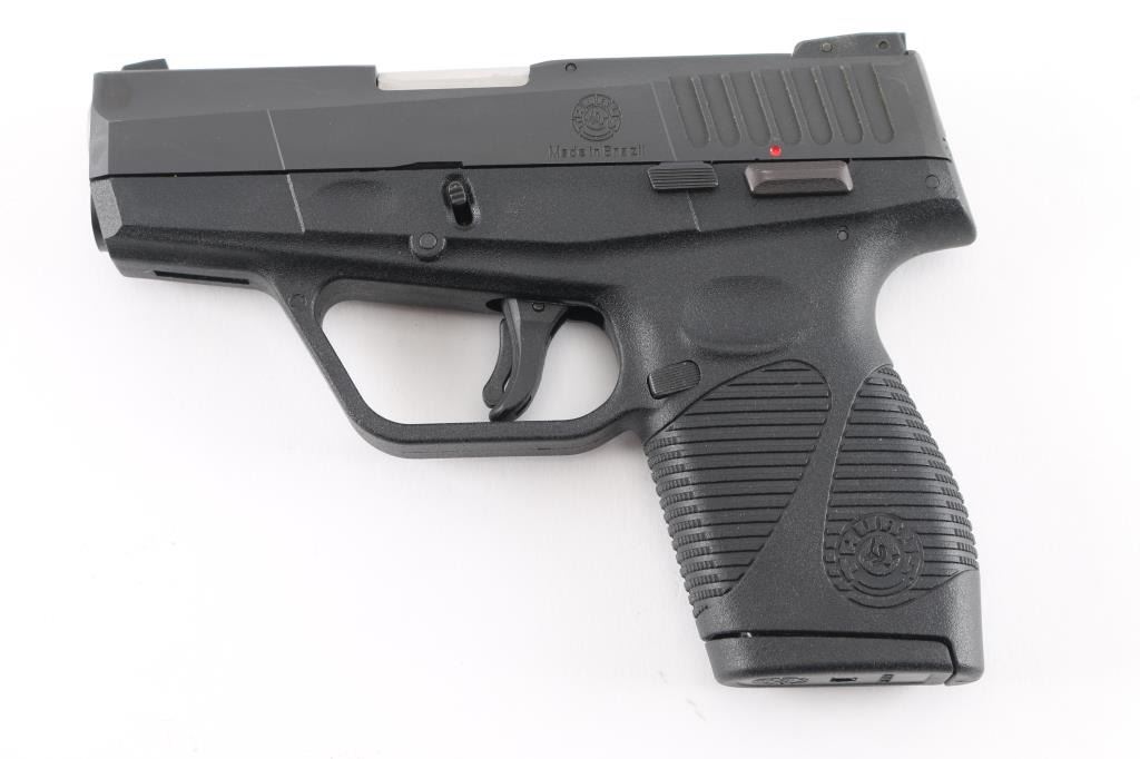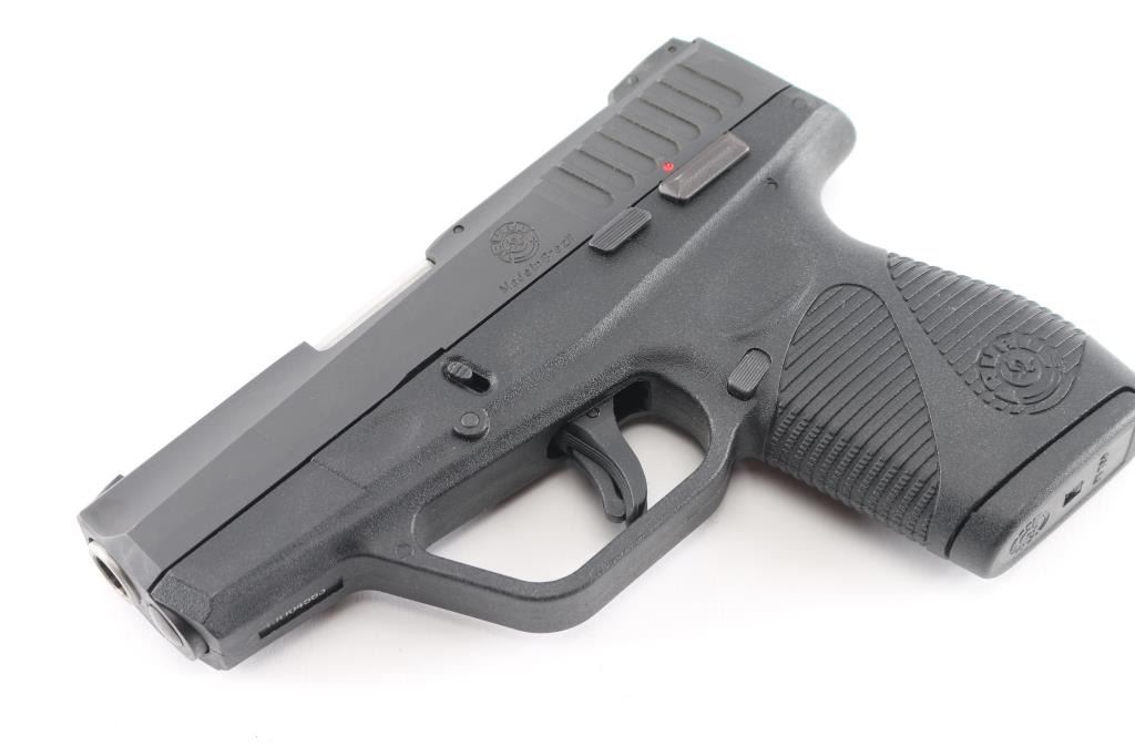 Compact semiautomatic pistol made in Brazil. Features 3.25" barrel, 3 dot sights with adjustable rear, frame mounted manual safety, pushbutton mag release, Taurus locking system in slide, trigger safety, loaded chamber indicator, matte black finish, polymer frame. Double action only trigger with restrike. Bore is very good bright condition. Retains 95% finish with edge losses. Includes one magazine.
