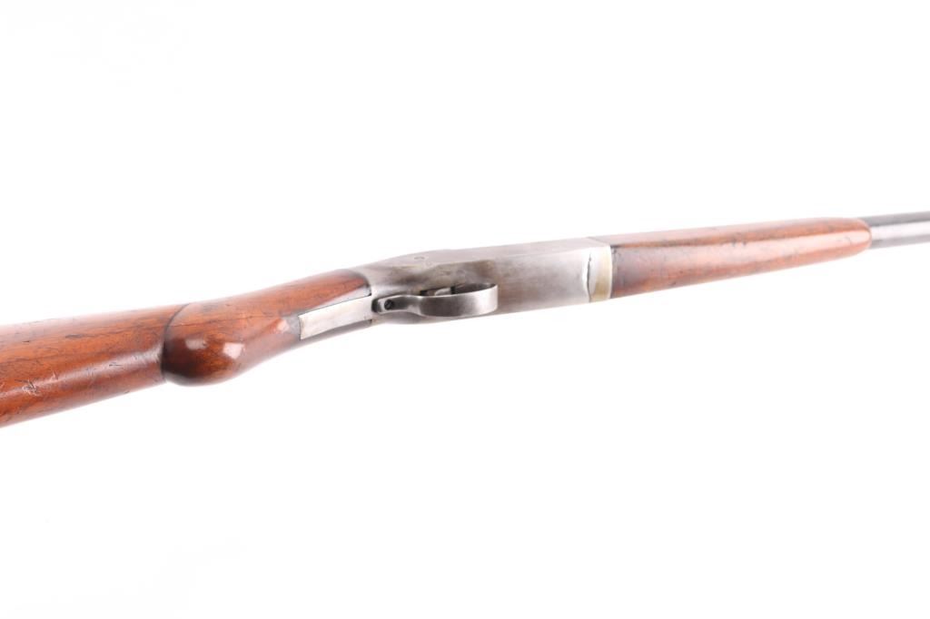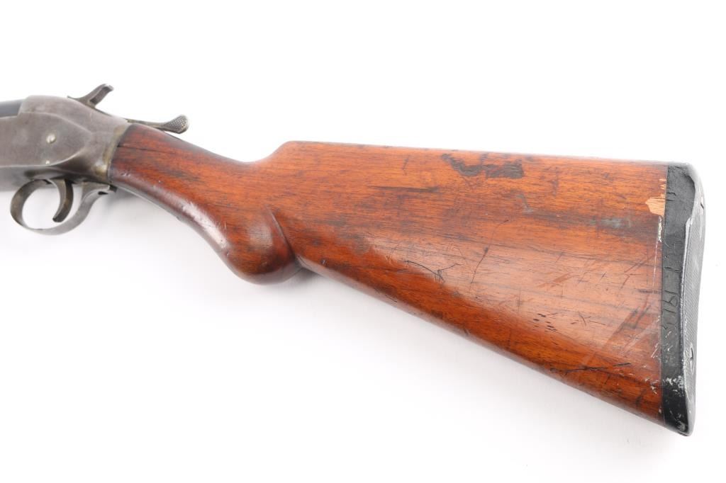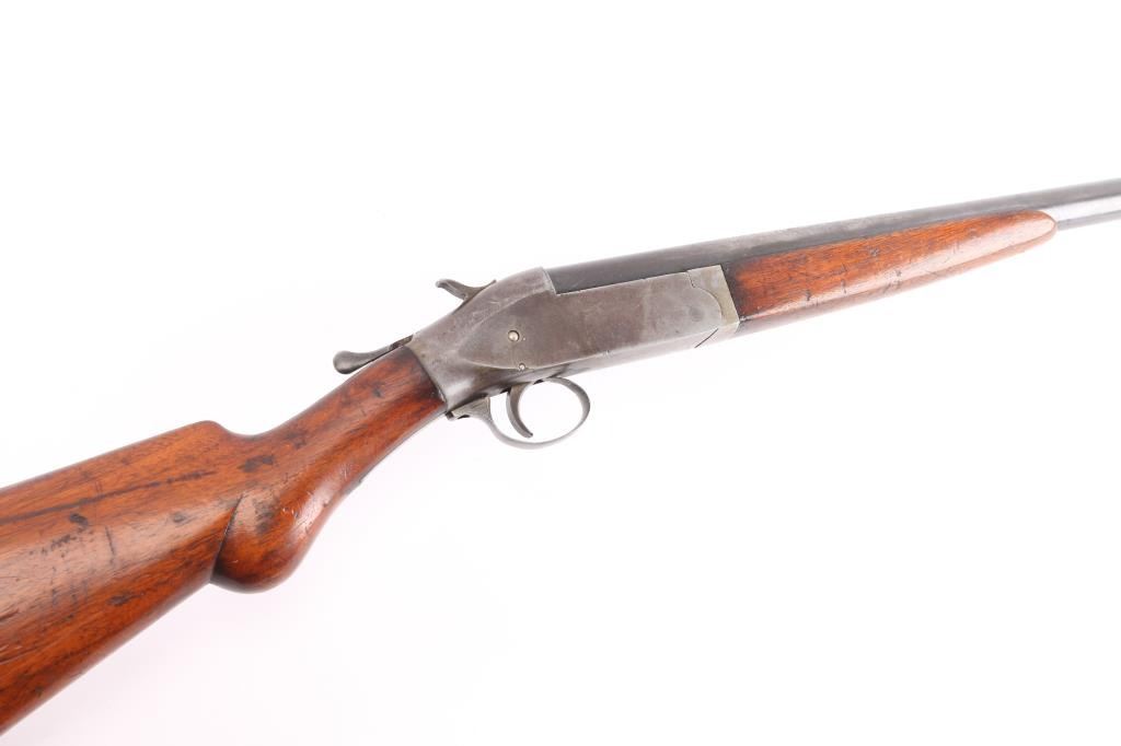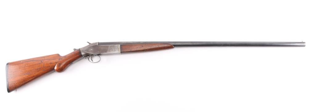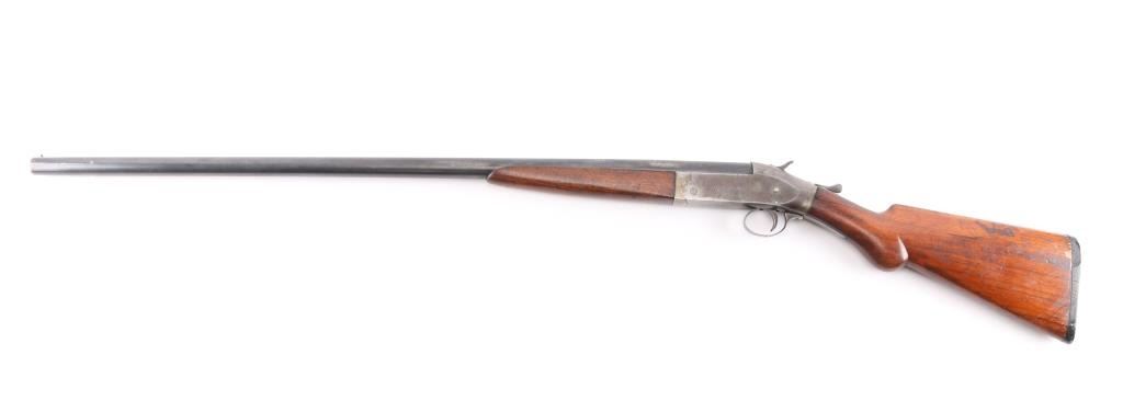 Vintage single shot break top shotgun. Accepts 2-3/4" shells. Features blued finish, 32" barrel, brass bead front sight, Full choke, exposed hammer, top lever opening, smooth wood forend and semi-pistol grip stock. Bore is very good condition. Retains 60% finish, fading and thinning, with small patina spots throughout. Receiver is a mottled brown patina color. Wood is good condition, varnished, with scrapes and dents, repair to left side of butt stock in tang area, also a crack in the same area. Buttplate has a thin wide chip out near the heel.