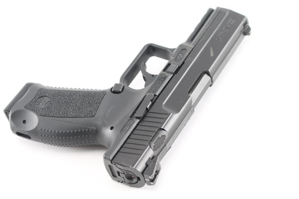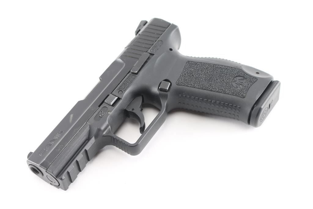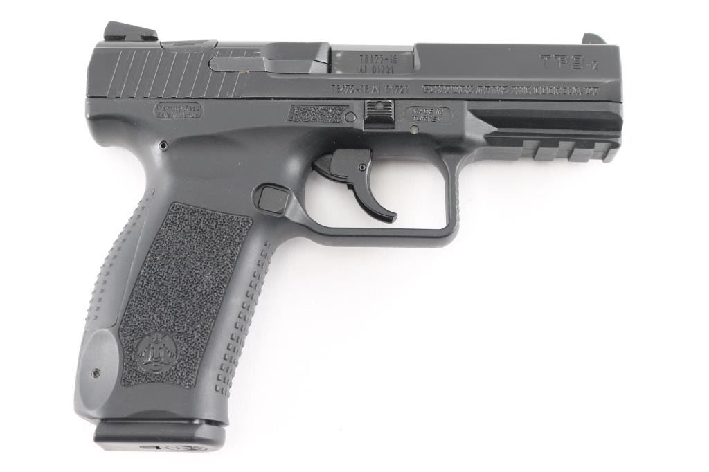Turkish made semi-automatic full-size pistol chambered in 9x19mm. Imported by Century Arms of Georgia, V.T. Features matte black finish, 4" barrel, double action trigger with restrike, dovetailed 3 dot sights, polymer frame with accessory rail & replaceable backstraps, cocked indicator, decocking button on top of slide, push button magazine release, pin for backstrap acts as lanyard point. Bore is pristine. Retains 95% finish with slight edge wear and a few small scuffs. Includes the original factory hard case with manual, cleaning brush, additional backstrap, spare magazine (2 total).