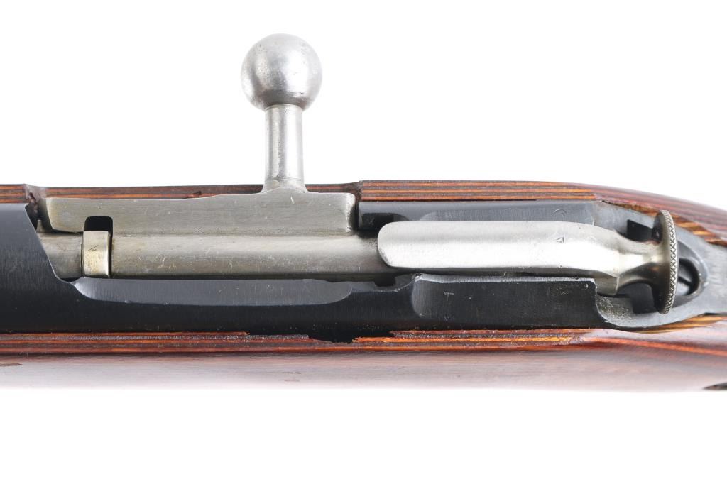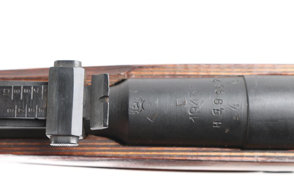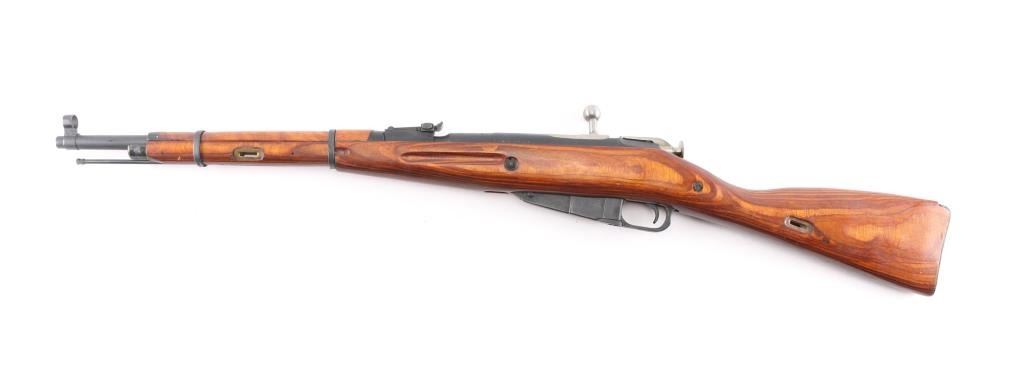 WW2 Russian Army carbine. Arsenal reworked. Blued metal finish, with wooden stock, and forearm. 20" barrel, with tangent rear sights. Hooded adjustable front sight post. Action is smooth/tight. 5-rd attached box magazine. Chrome bolt. 1943 dated barrel, round receiver. Serial number matched on barrel and receiver, electro-penciled on magazine floorplate, bolt, and steel butt-plate. Imported by Century Arms, cleaning rod present. Blue metal is about 95%, with wear on the edges, minor scratches, bolt has some surface rust on the knob, bore is good, strong rifling, some frosting in the grooves, wood is very good/sound.