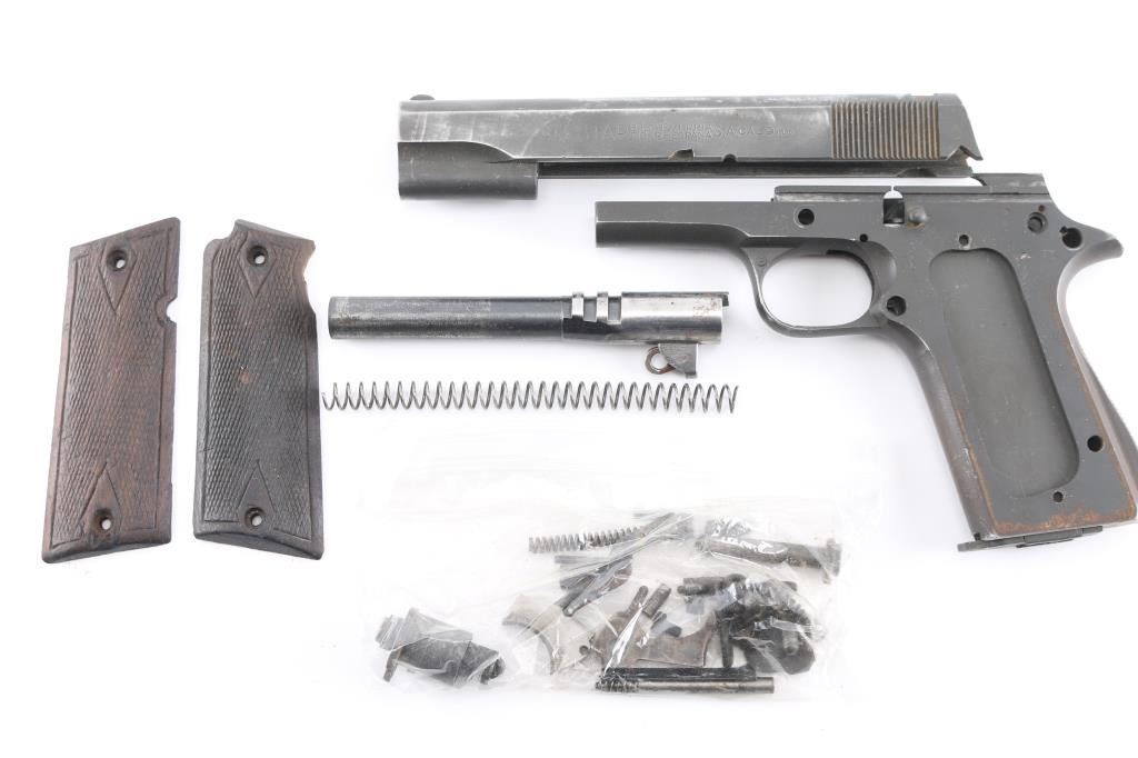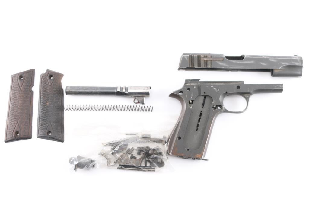 **FOR PARTS OR REPAIR ONLY** Spanish 9x19mm semiautomatic pistol imported by Century Arms, Georgia VT. Not assembled, and may be missing one or more parts. Features blued finish, checkered wood grips, single action trigger, 5" barrel, fixed sights, frame mounted manual safety, push button mag release. Bore is good condition with dark streaks in the grooves. Retains 40% blue with losses throughout, some light rust, patina or pitting. Grips are fair to good condition with heavy wear from use, showing s smoothing and loss of detail. Includes one unmarked magazine.